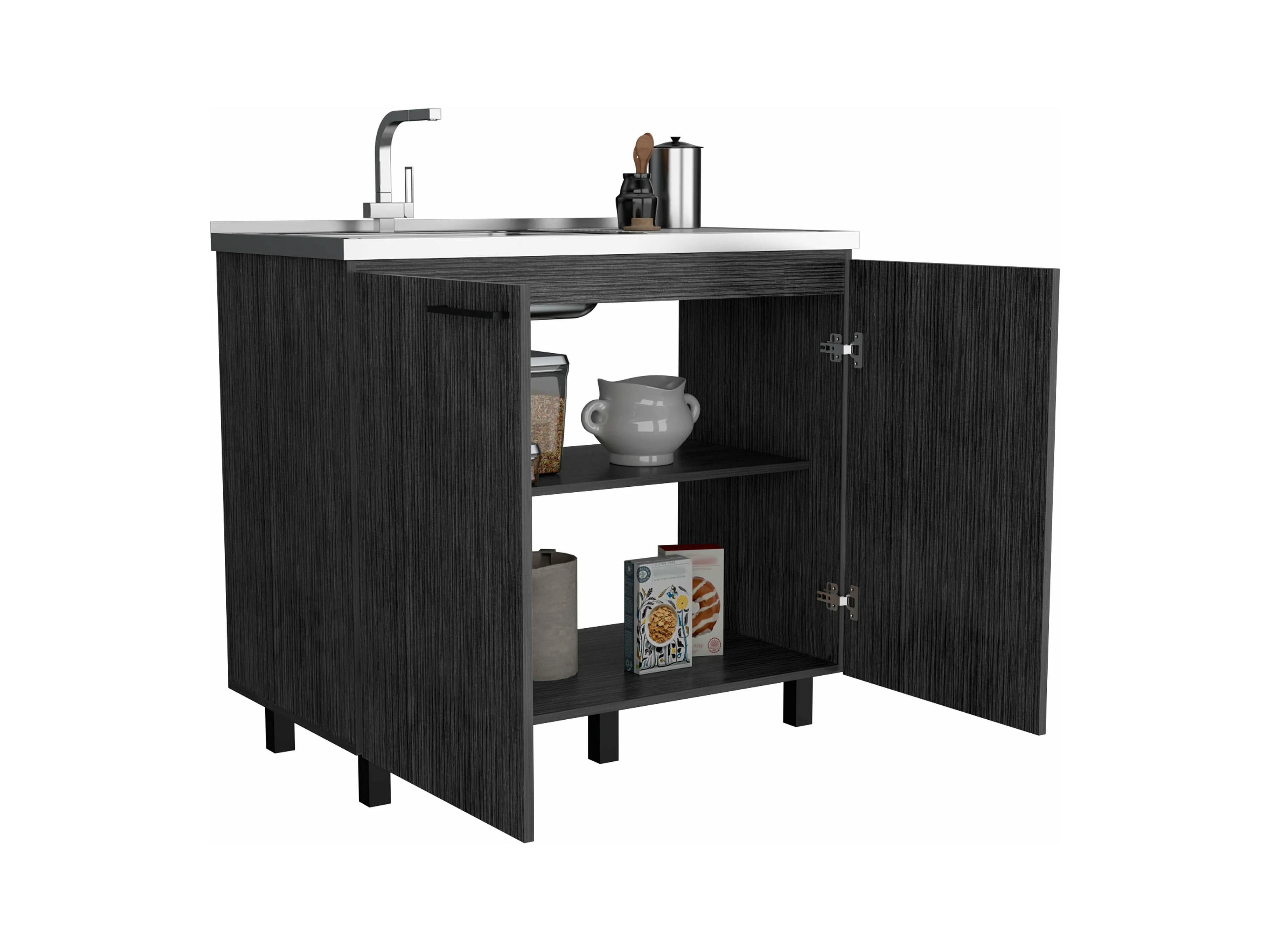 Elément bas Napoles en mélaminé avec 2 étagères, 2 portes et plan de travail en inox, gris, 89 cm X 100 cm X 52.5 cm