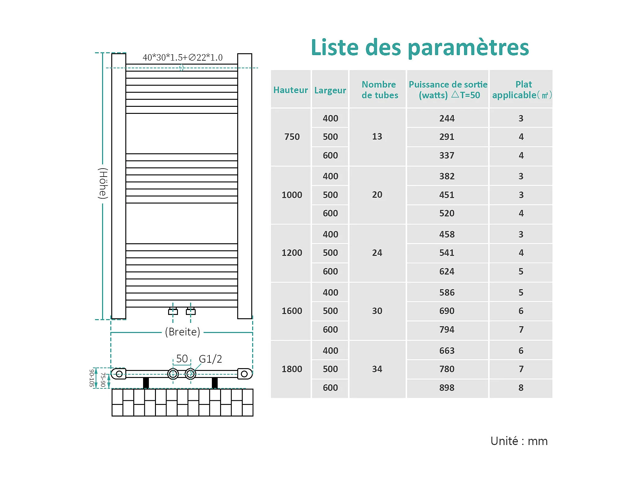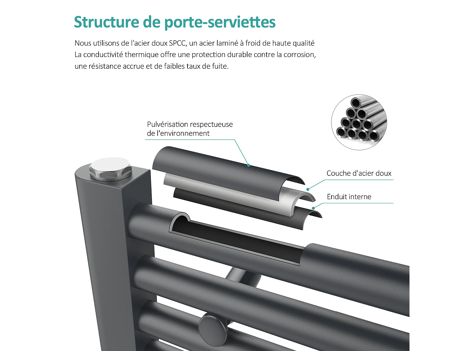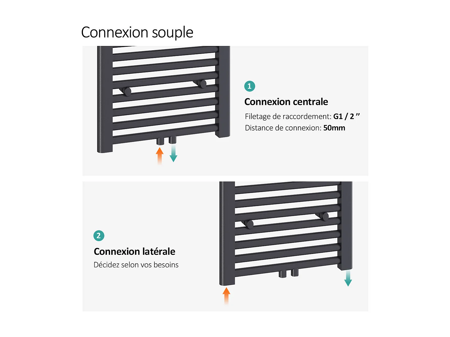 Radiateur sèche-serviette forme droite anthracite connexion latérale 50x150 cm