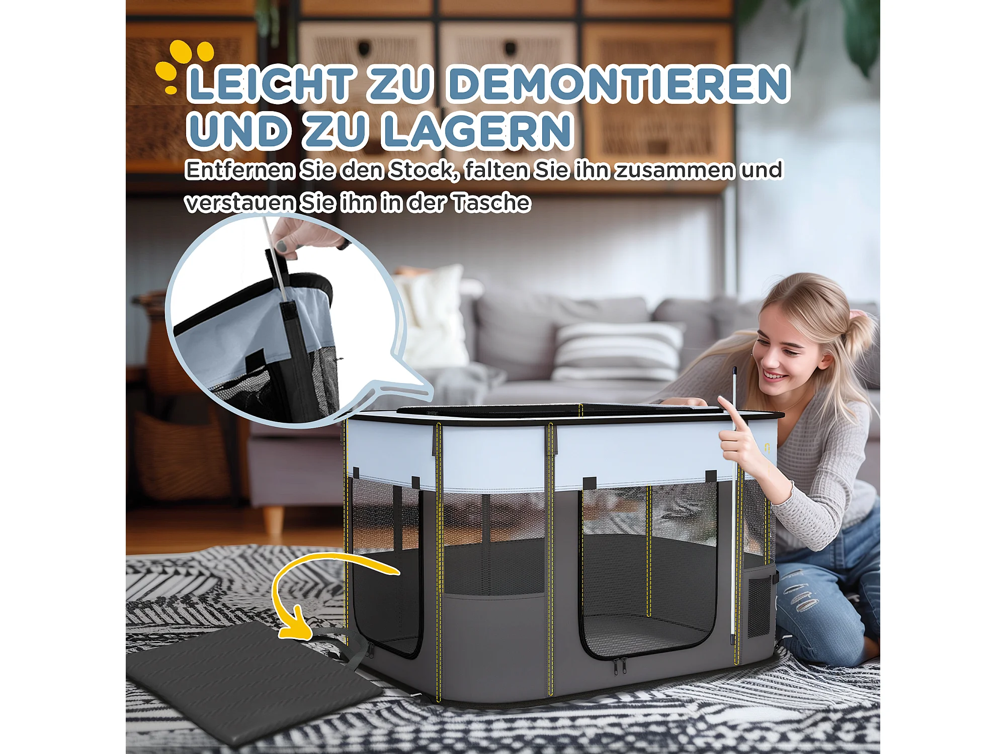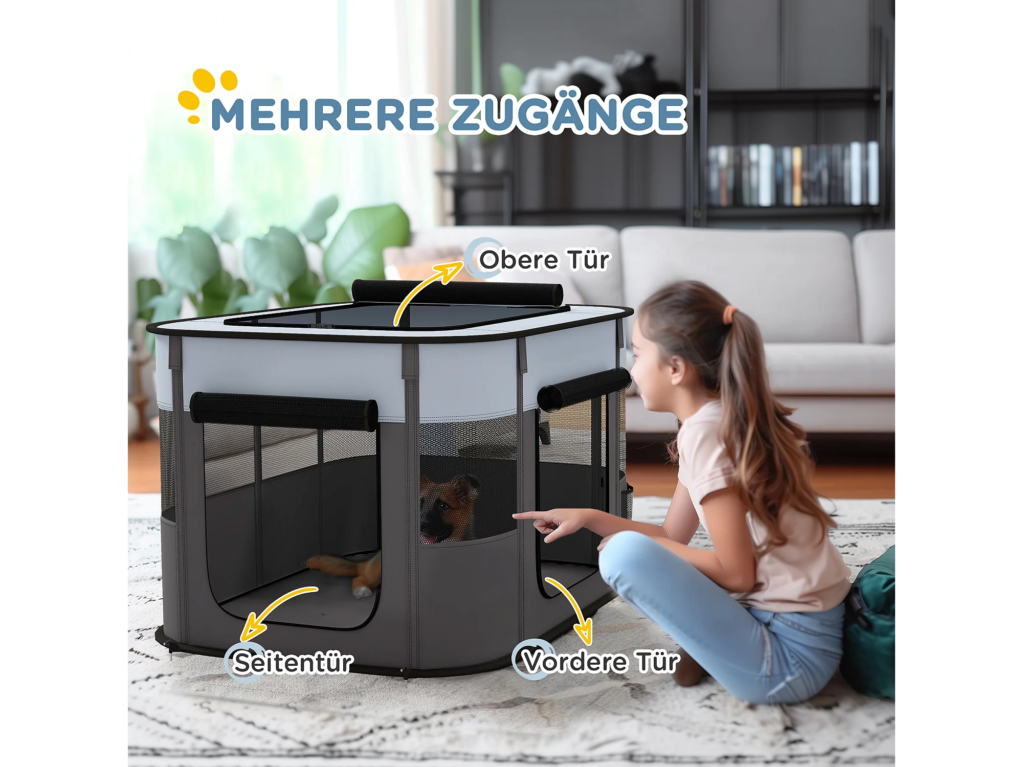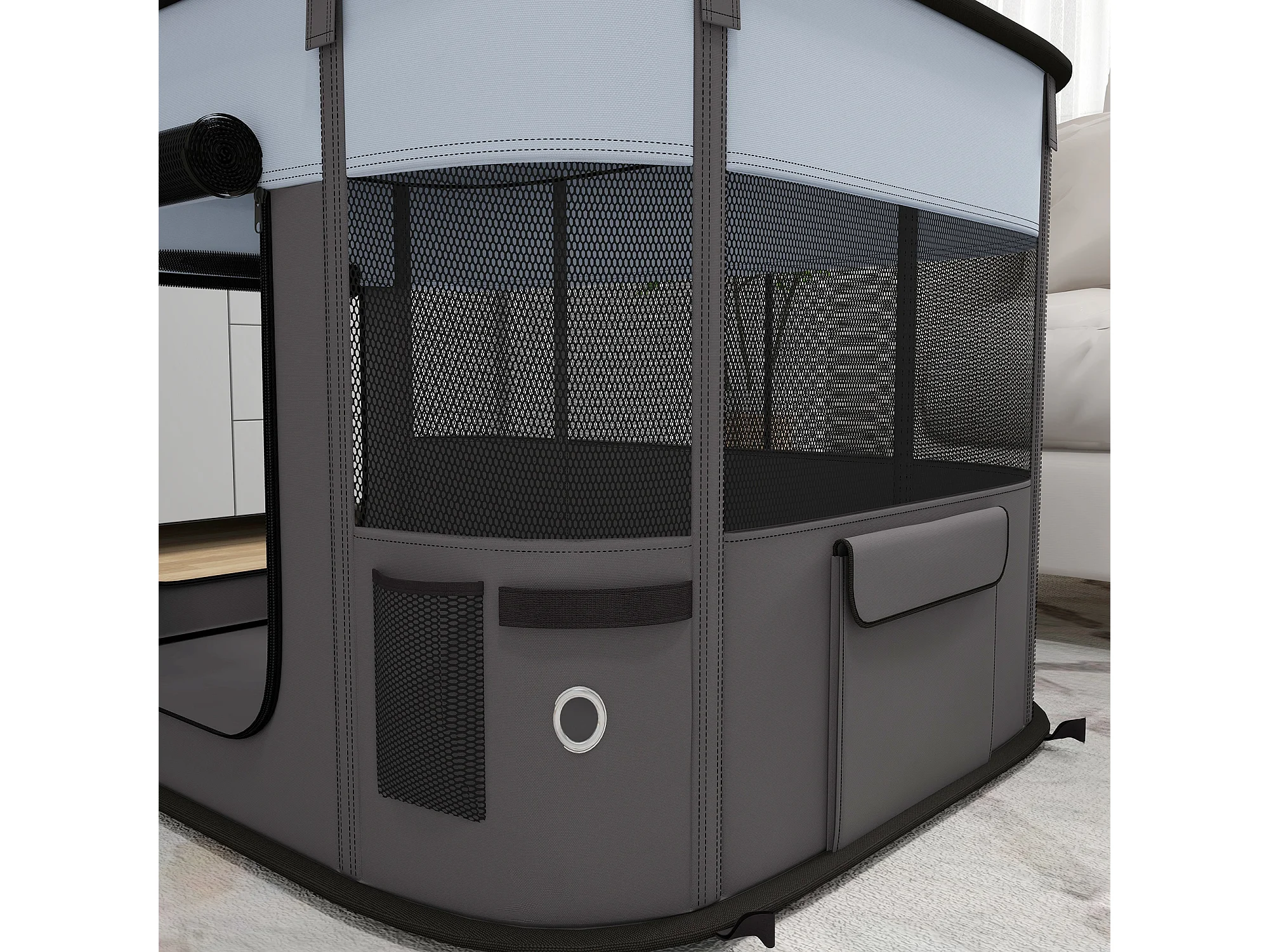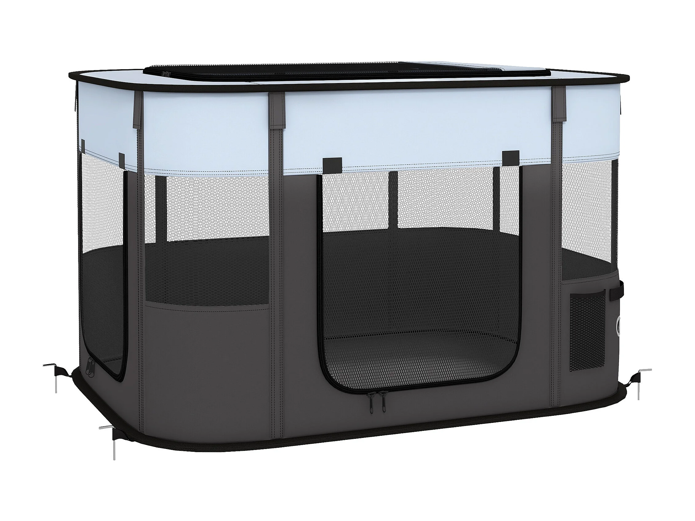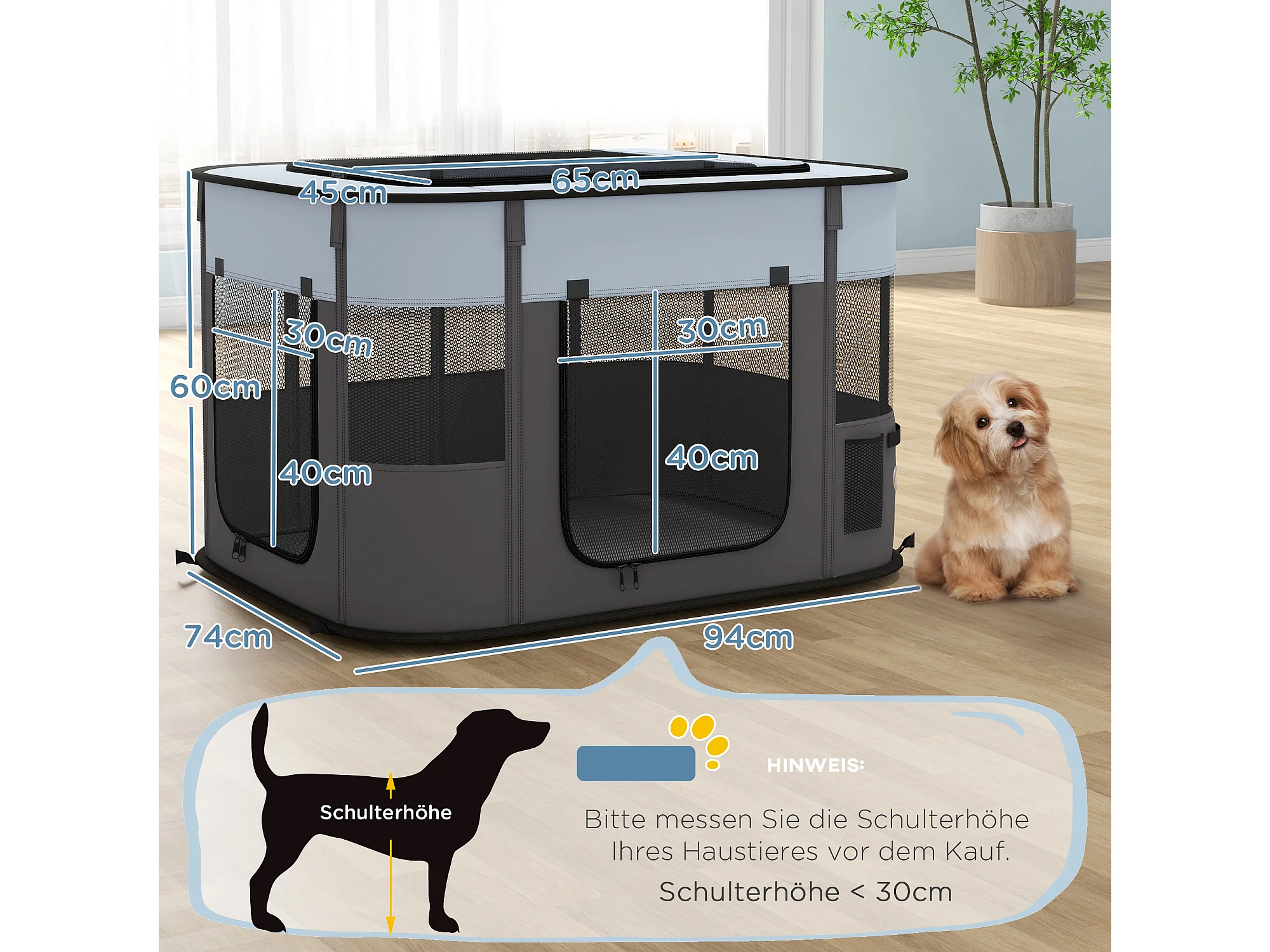 Enclos pour chiots et petits animaux, pliable avec portes et fenêtres, polyester respirant, gris (94x74x60cm)