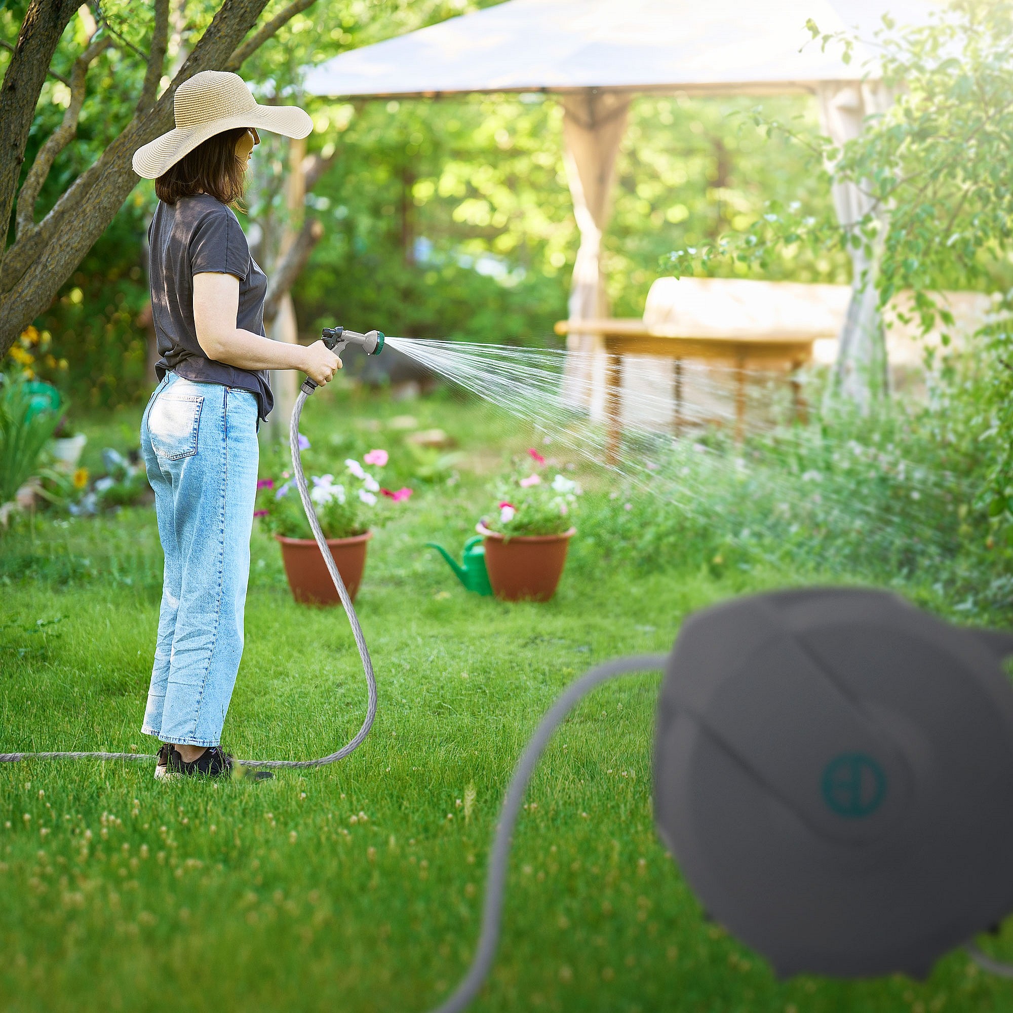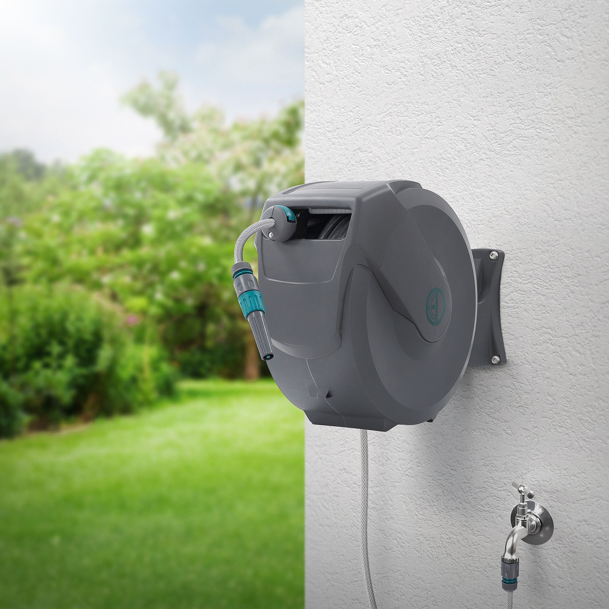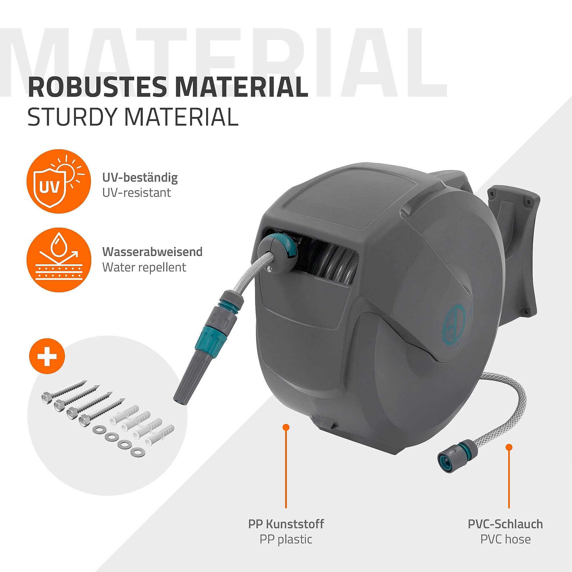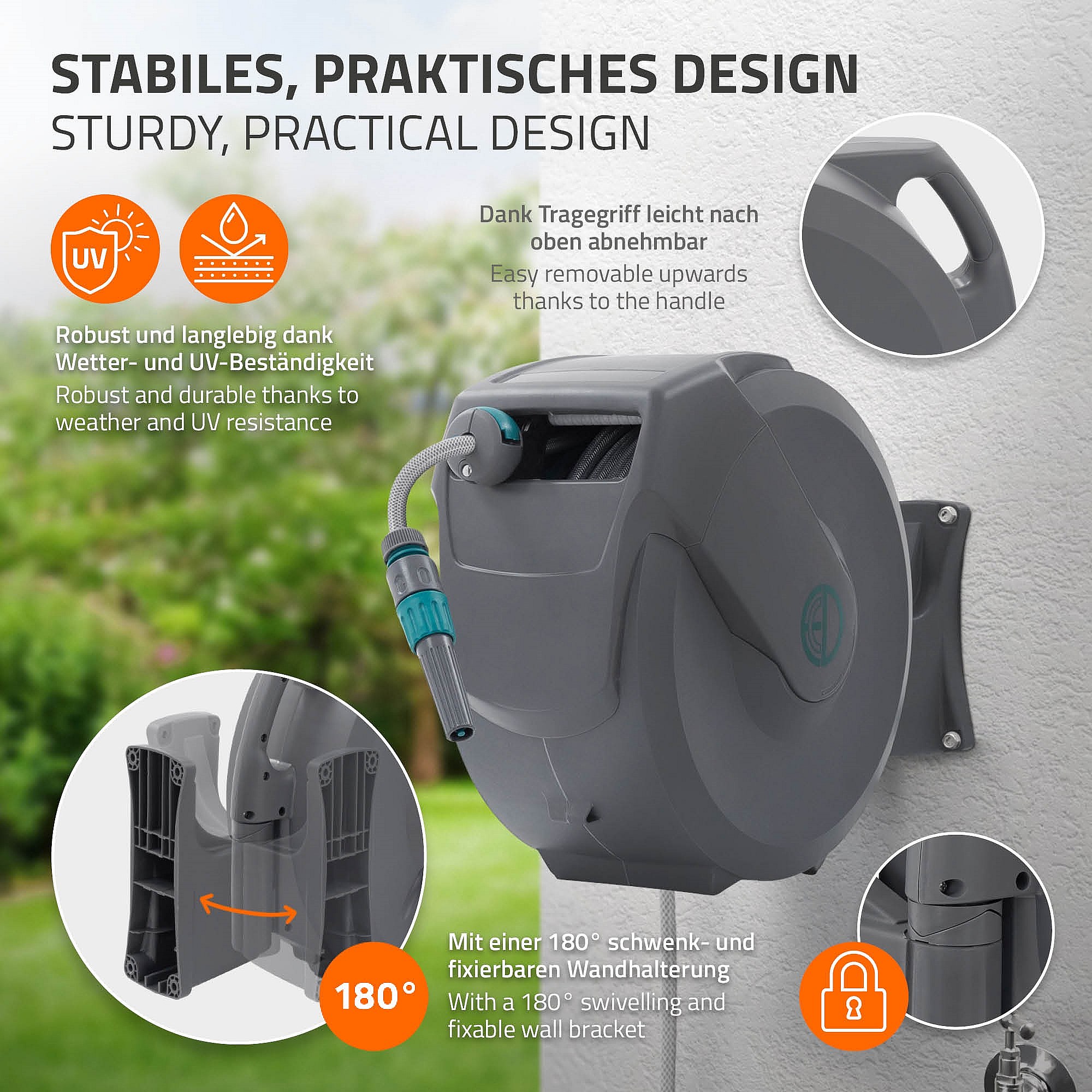 Enrouleur de tuyau d'arrosage mural 30m + 2m pivotant à 180° rétraction automatique fonction d'arrêt 9 fonctions de pulvérisation en PVC/plastique