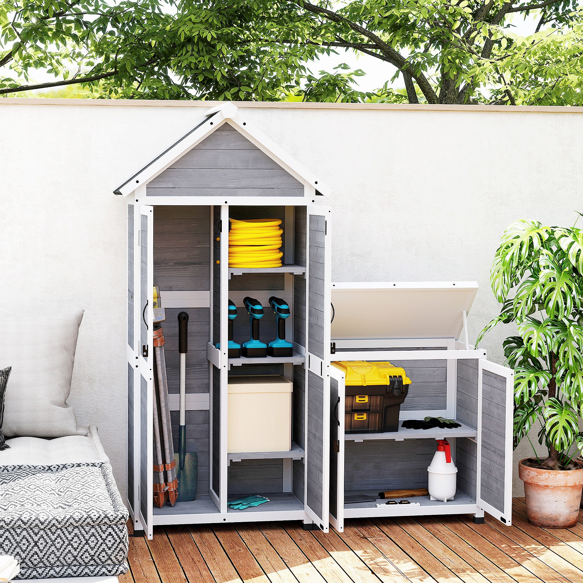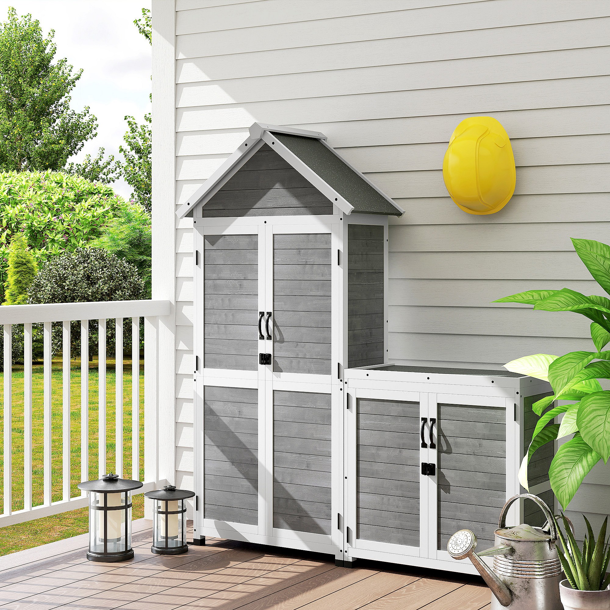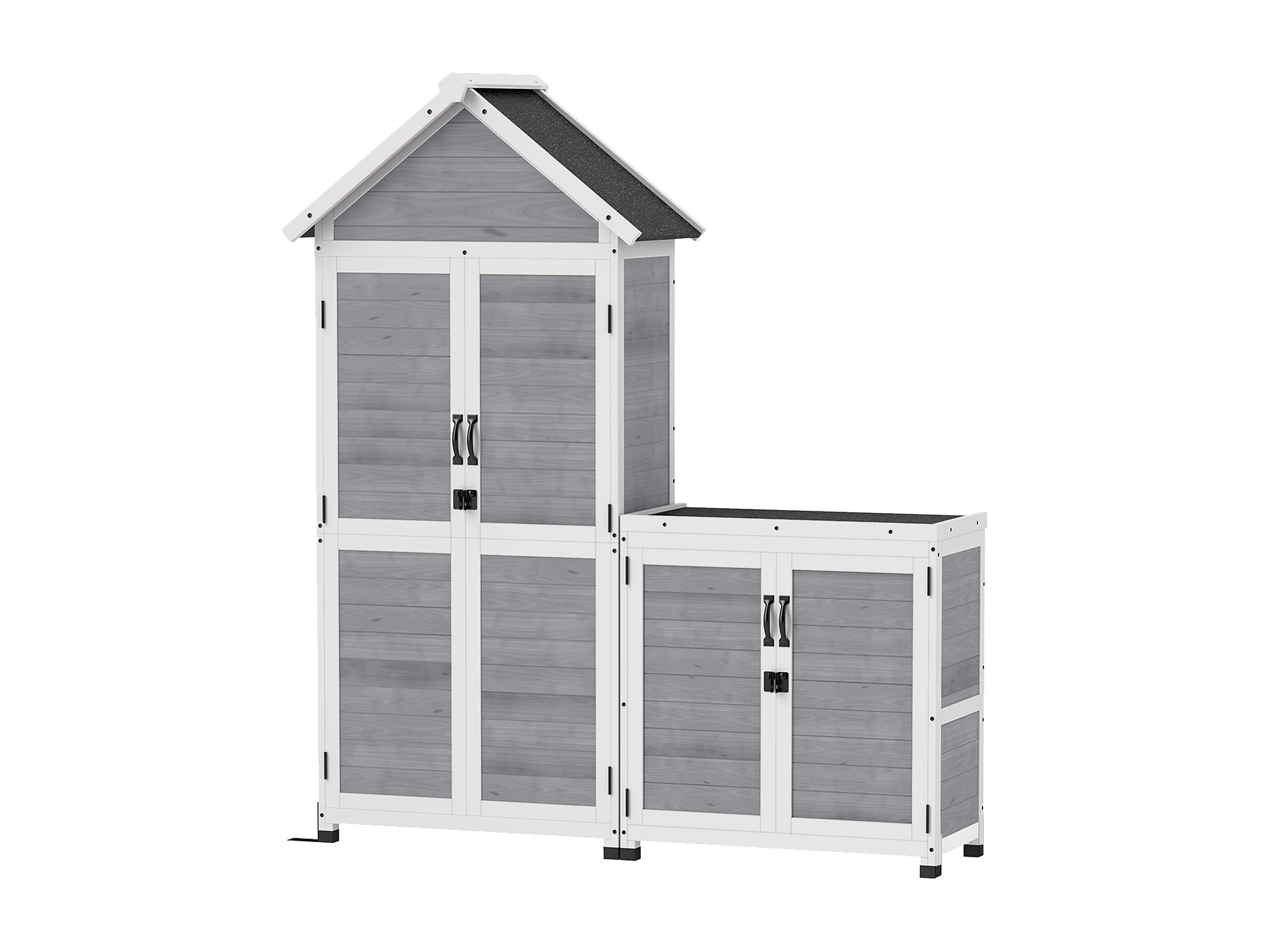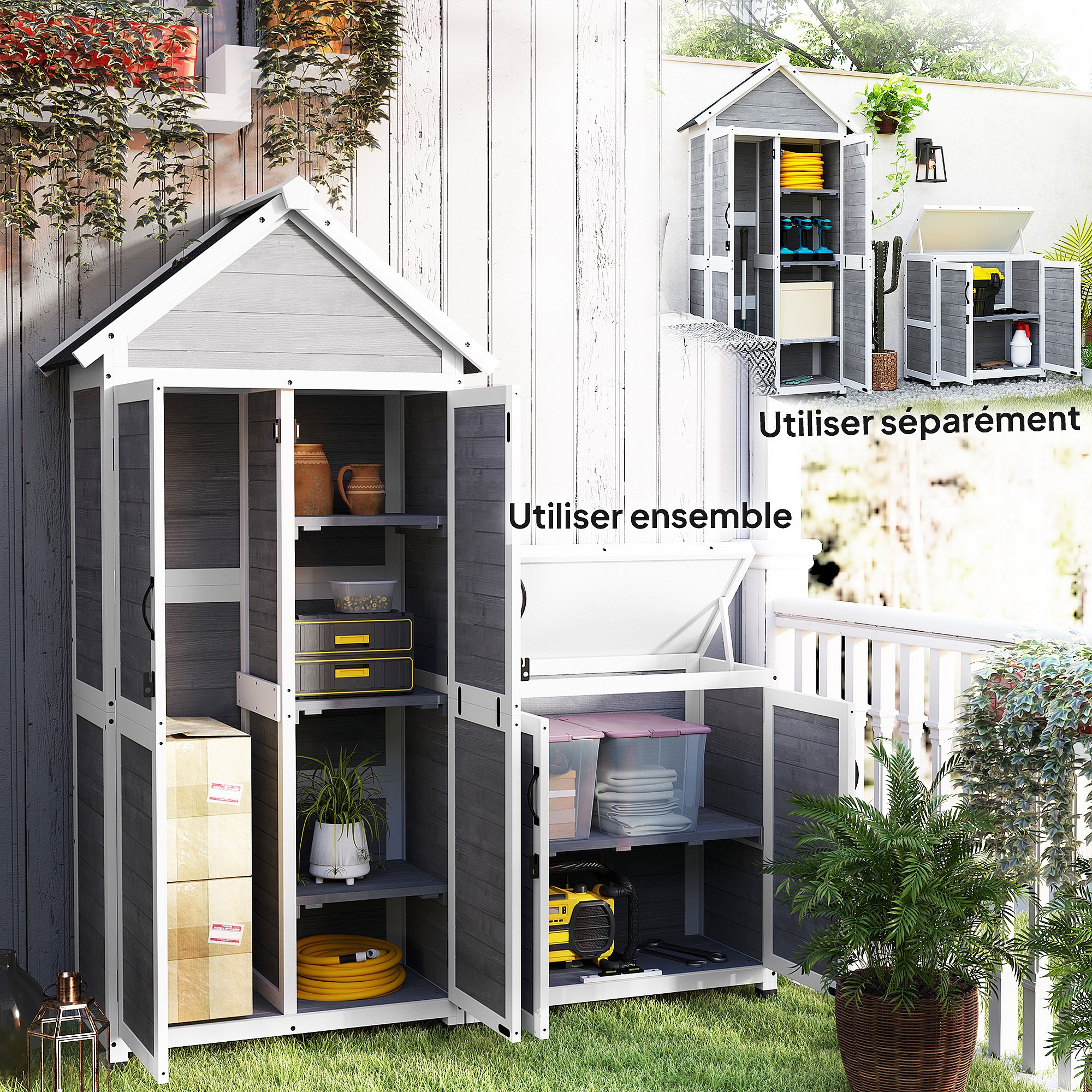 Ensemble armoire de jardin avec coffre extérieur assorti - 2 + 2 portes - 3 + 1 étagères - toit bitumé noir bois gris blanc