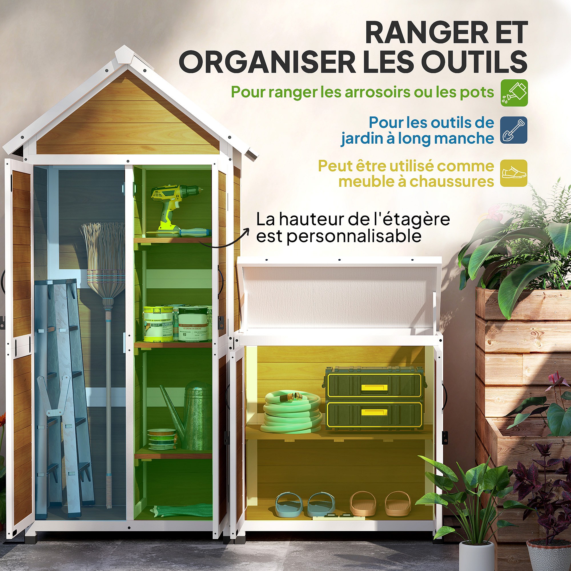 Ensemble armoire de jardin avec coffre extérieur assorti - 2 + 2 portes - 3 + 1 étagères - toit bitumé noir bois lasuré blanc