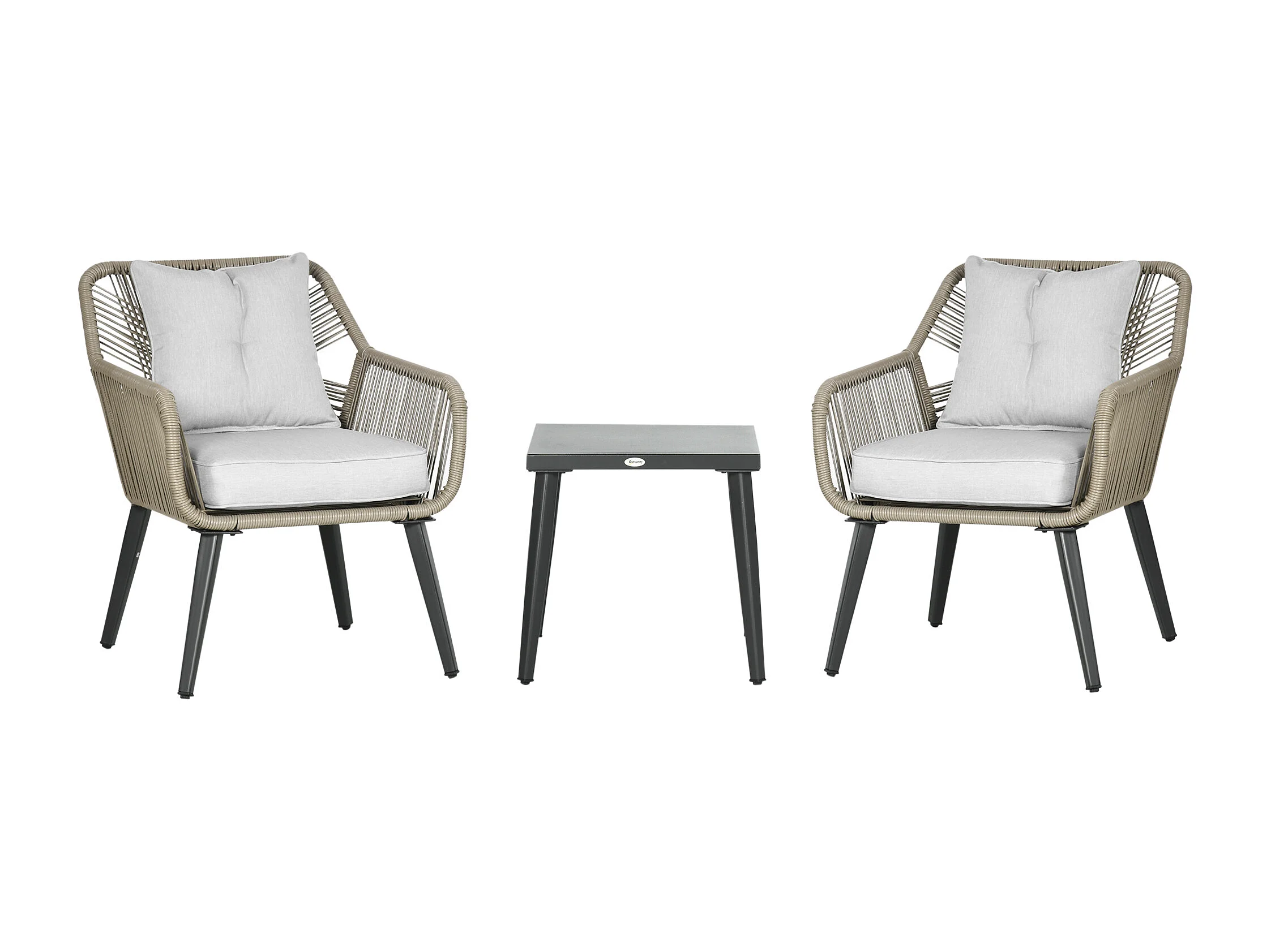 Ensemble bistro de jardin 2 places 3 pièces style contemporain acier époxy noir résine filaire gris clair