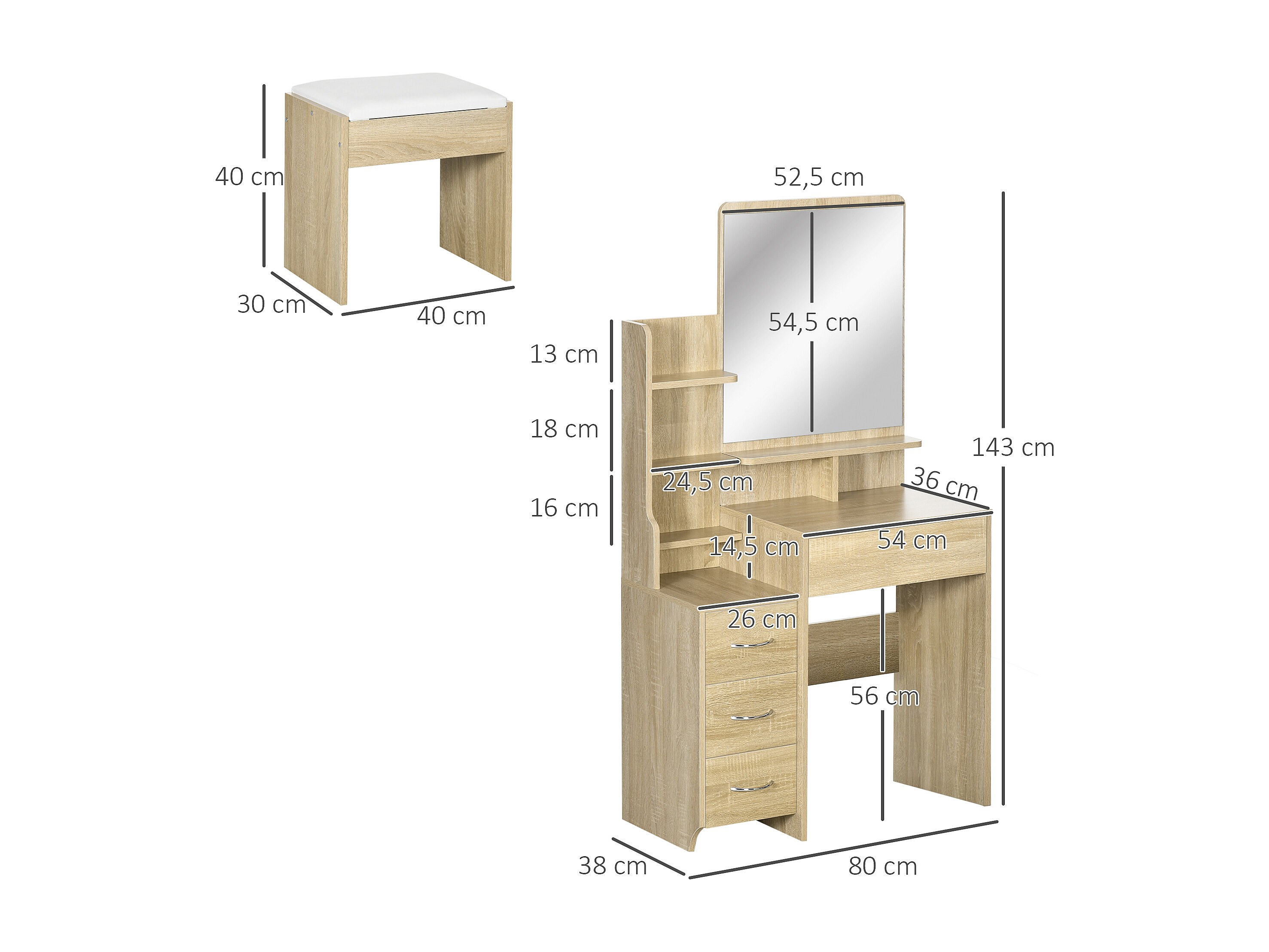 Ensemble coiffeuse tabouret design contemporain multi-rangement 4 tiroirs 4 étagères grand miroir aspect chêne clair blanc