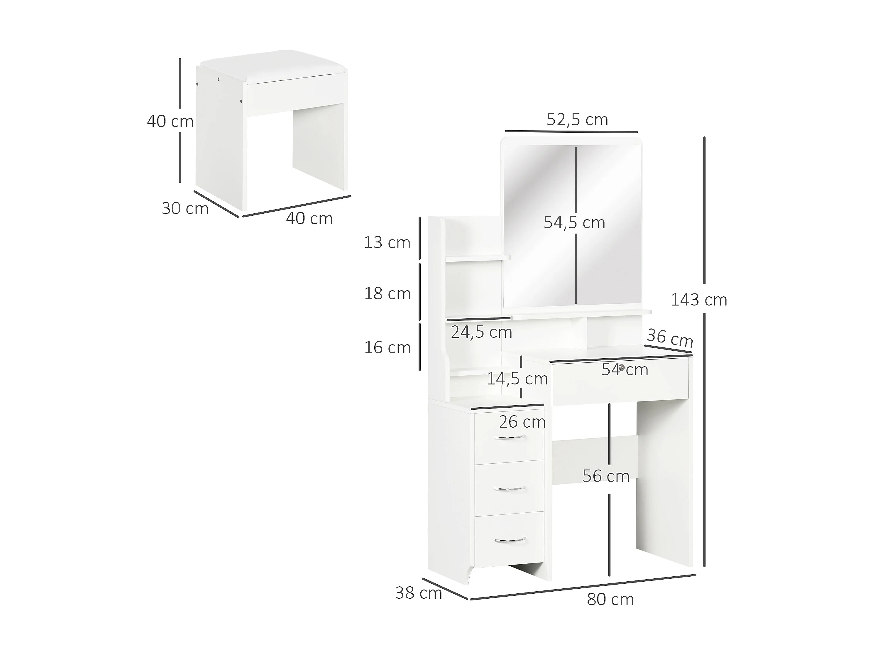 Ensemble coiffeuse tabouret design contemporain multi-rangement 4 tiroirs 4 étagères grand miroir blanc