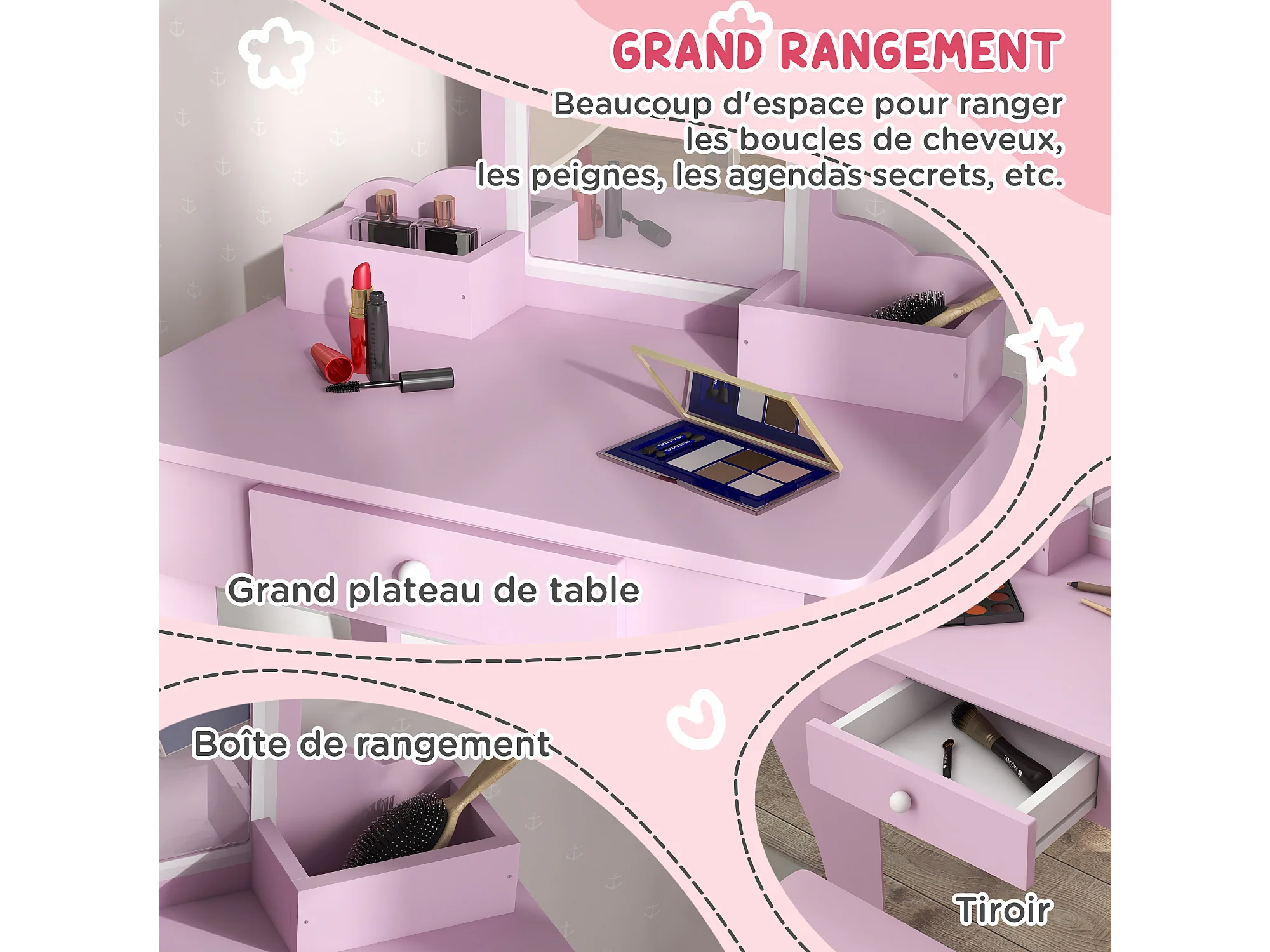 Coiffeuse pour Enfant Table de Maquillage avec Tabouret, Miroir Détachable et 1 Tiroir de Rangement Style Princesse