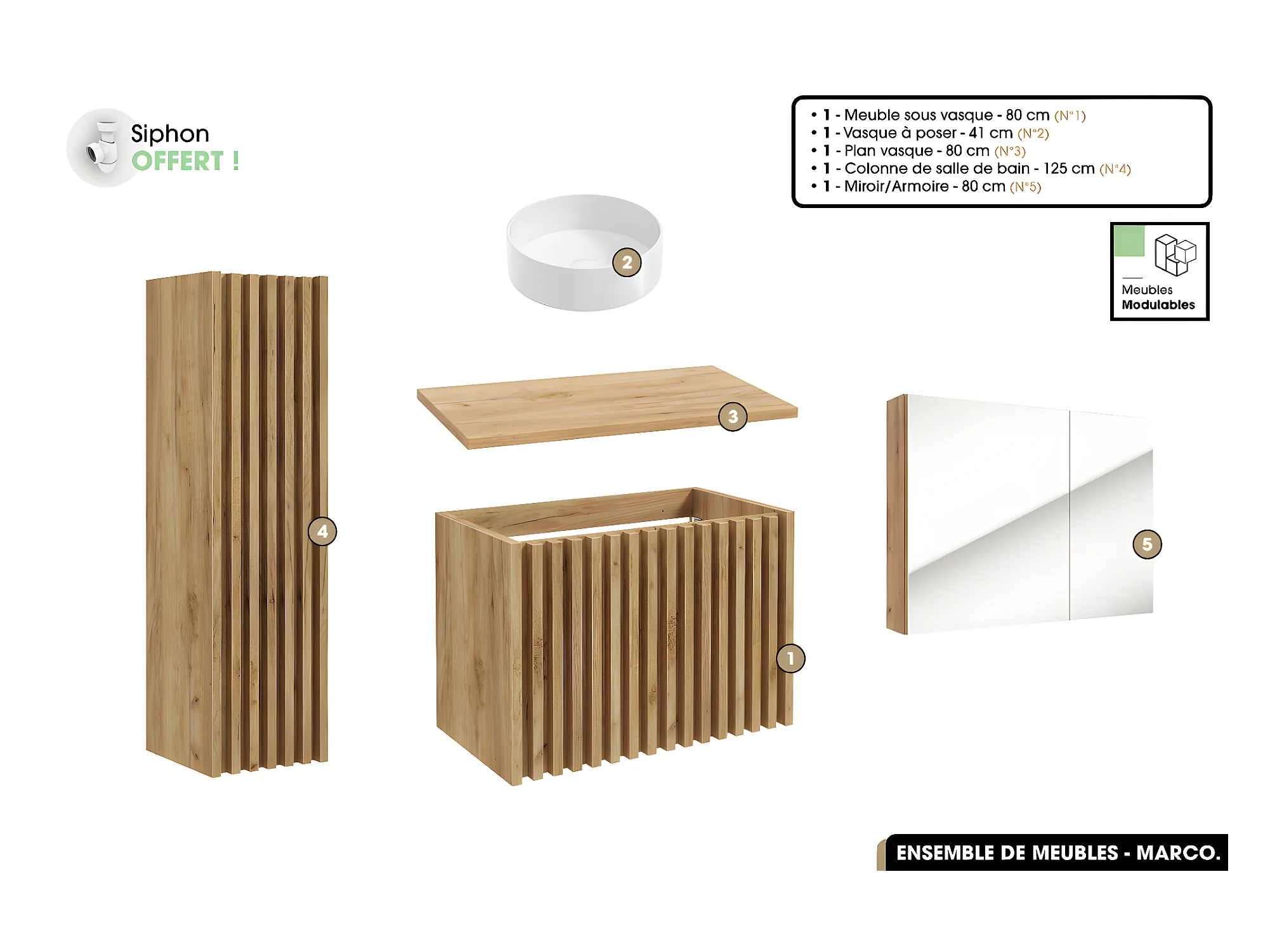 Ensemble complet de salle de bain - Meuble - Colonne - Miroir - Vasque à poser avec Siphon OFFERT | MARCO | Oak | 80 x 56 x 45 cm
