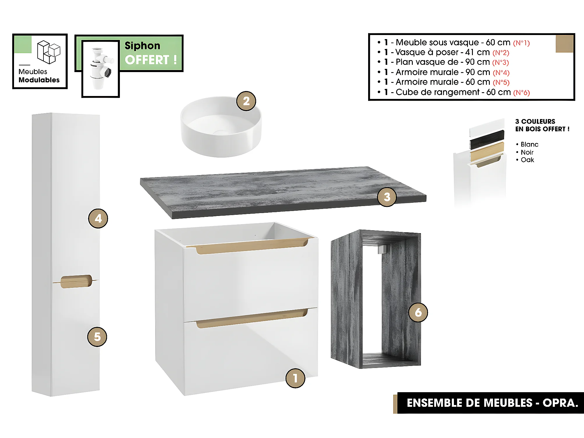 Ensemble complet de salle de bain - Meuble - Plan - Armoires - Cube - Vasque à poser avec Siphons OFFERT | OPRA | 90 x 60 x 45 cm