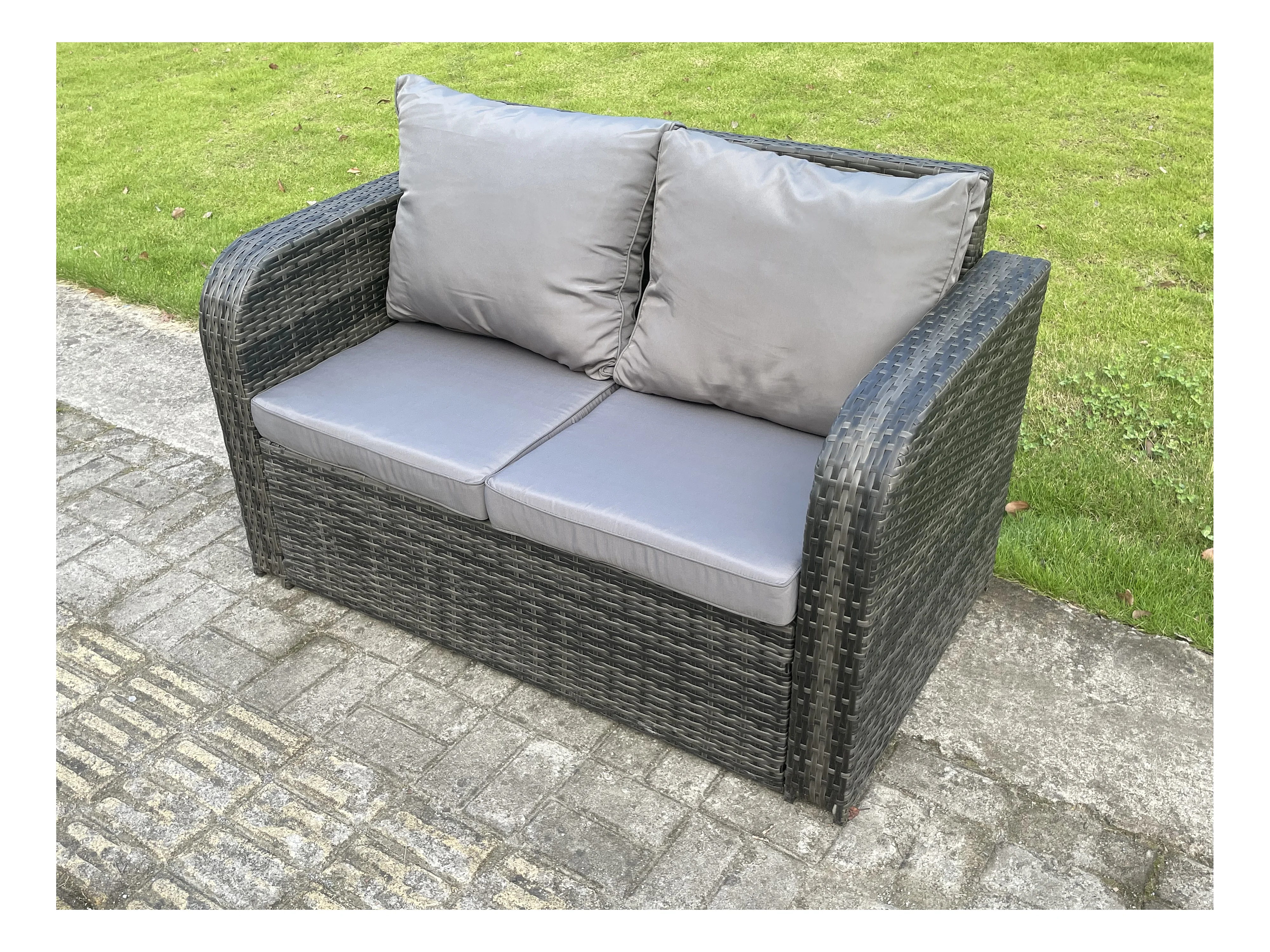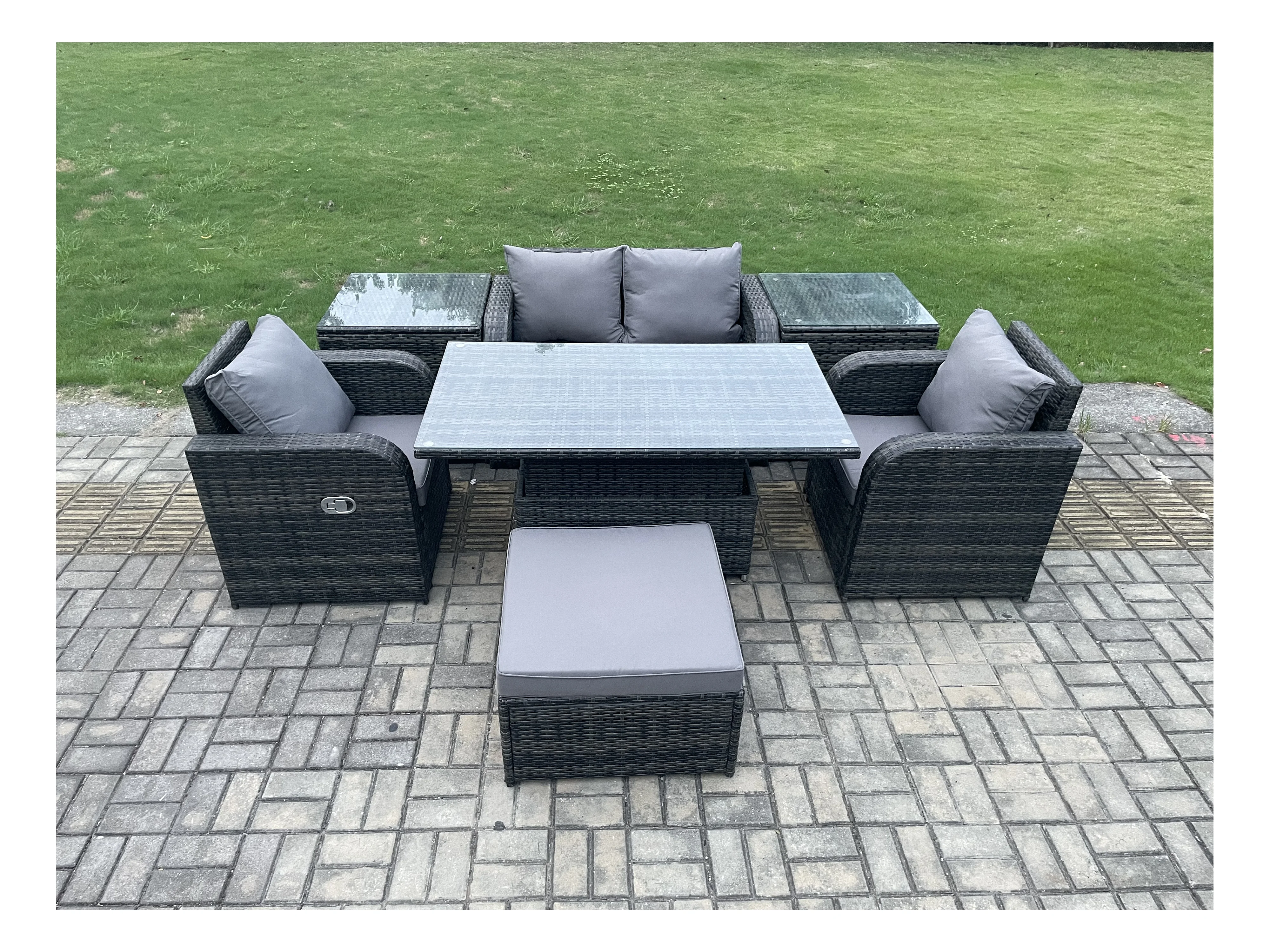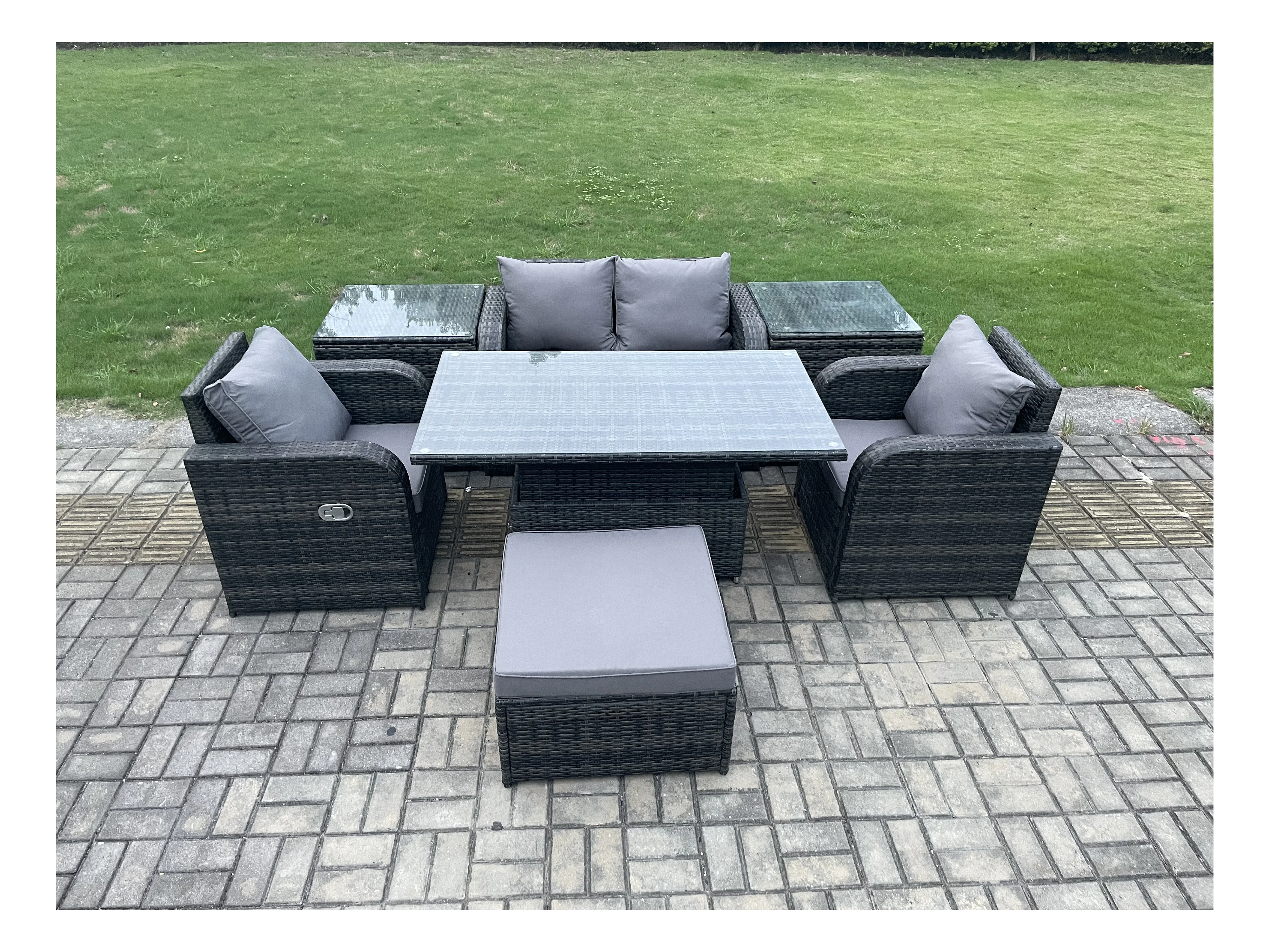 Ensemble de meubles de jardin en rotin ave Table à manger réglable en hauteur Chaises inclinable Canapé d'amour 2 Table d'appoint Tabourets Mélange gris foncé