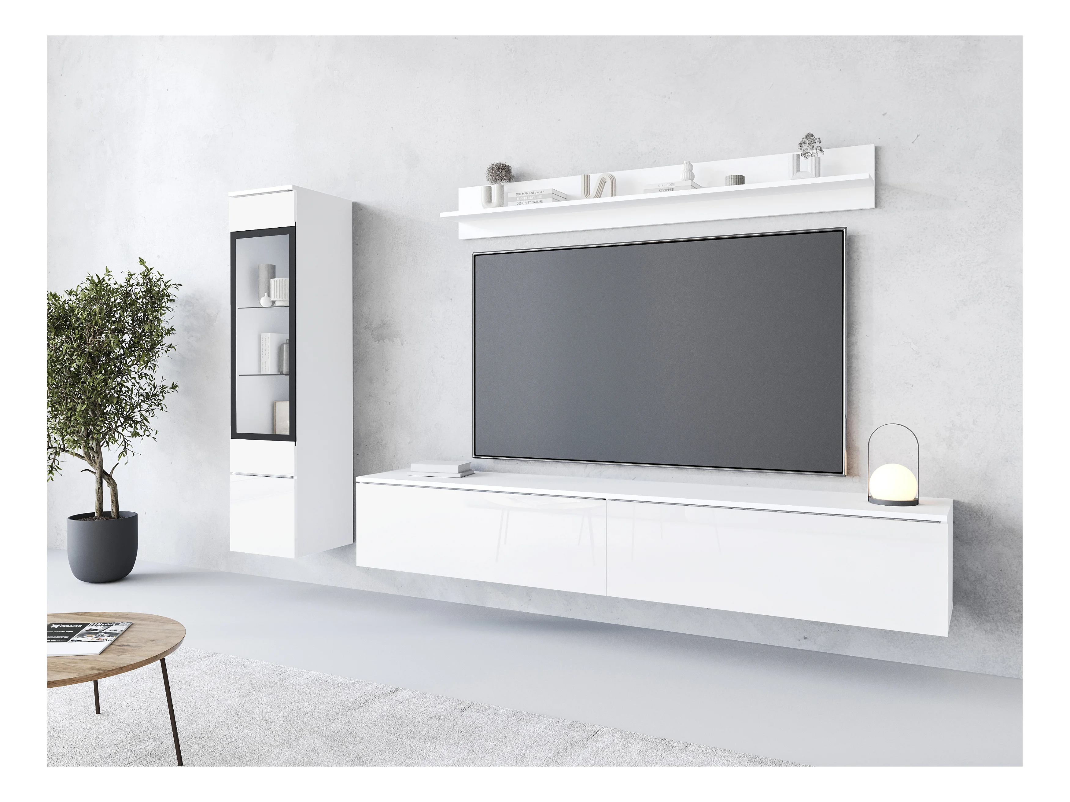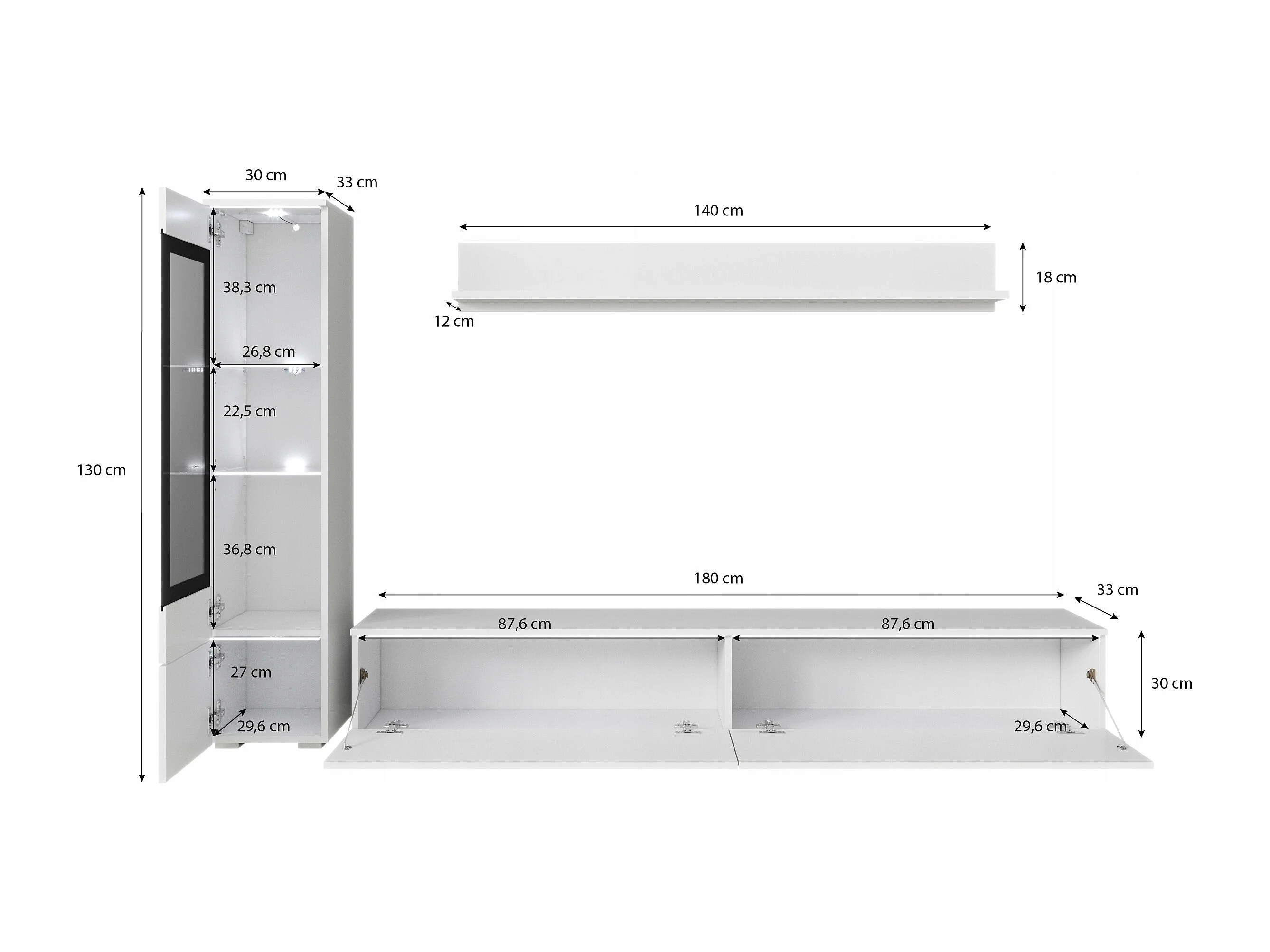 Ensemble de meubles pour salon 3 éléments avec LED – meuble TV 180 cm, vitrine et étagère, corps blanc mat, façades blanc brillant