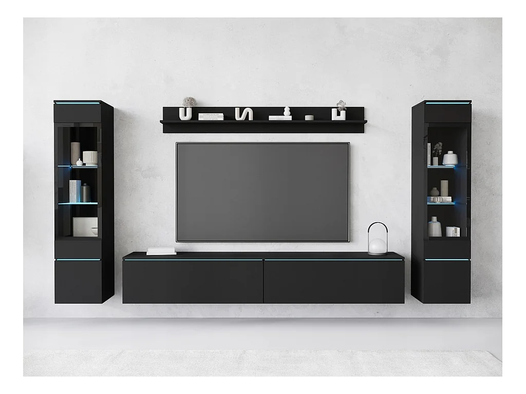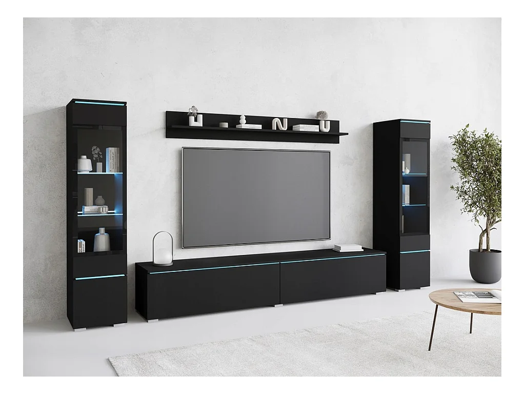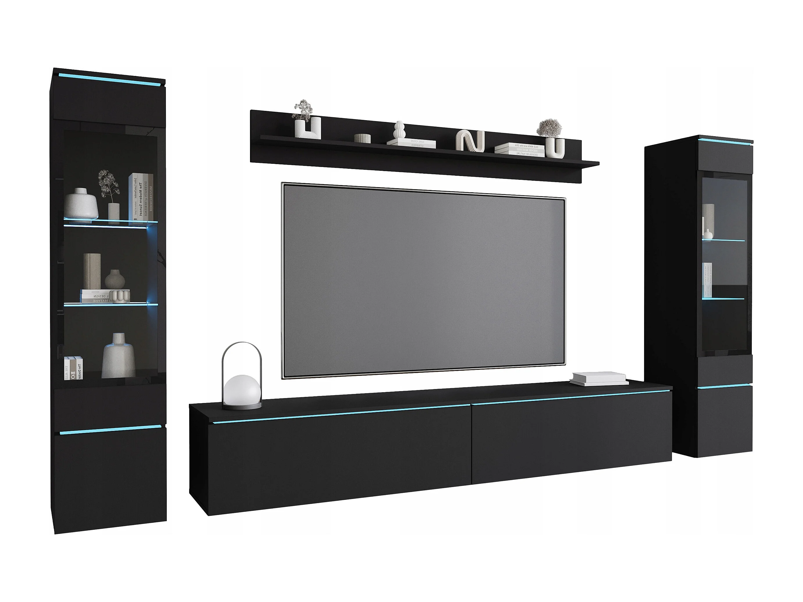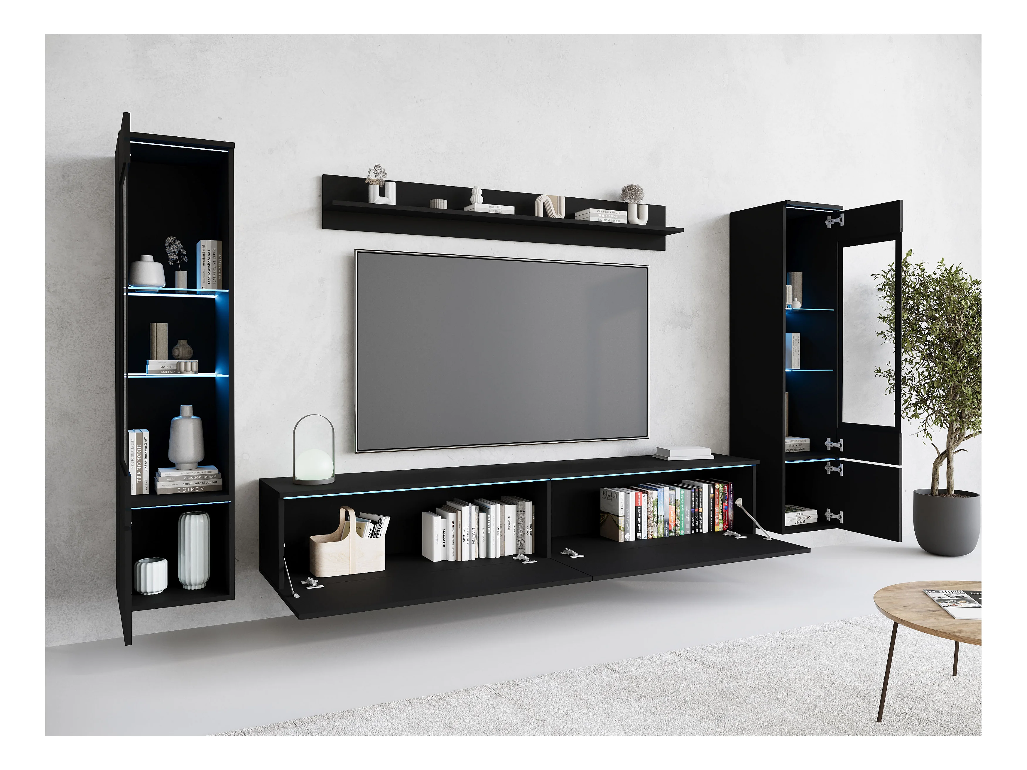Ensemble de meubles pour salon avec LED 4 éléments – meuble TV 180 cm, 2 vitrines et étagère, composition murale debout ou suspendue noir mat