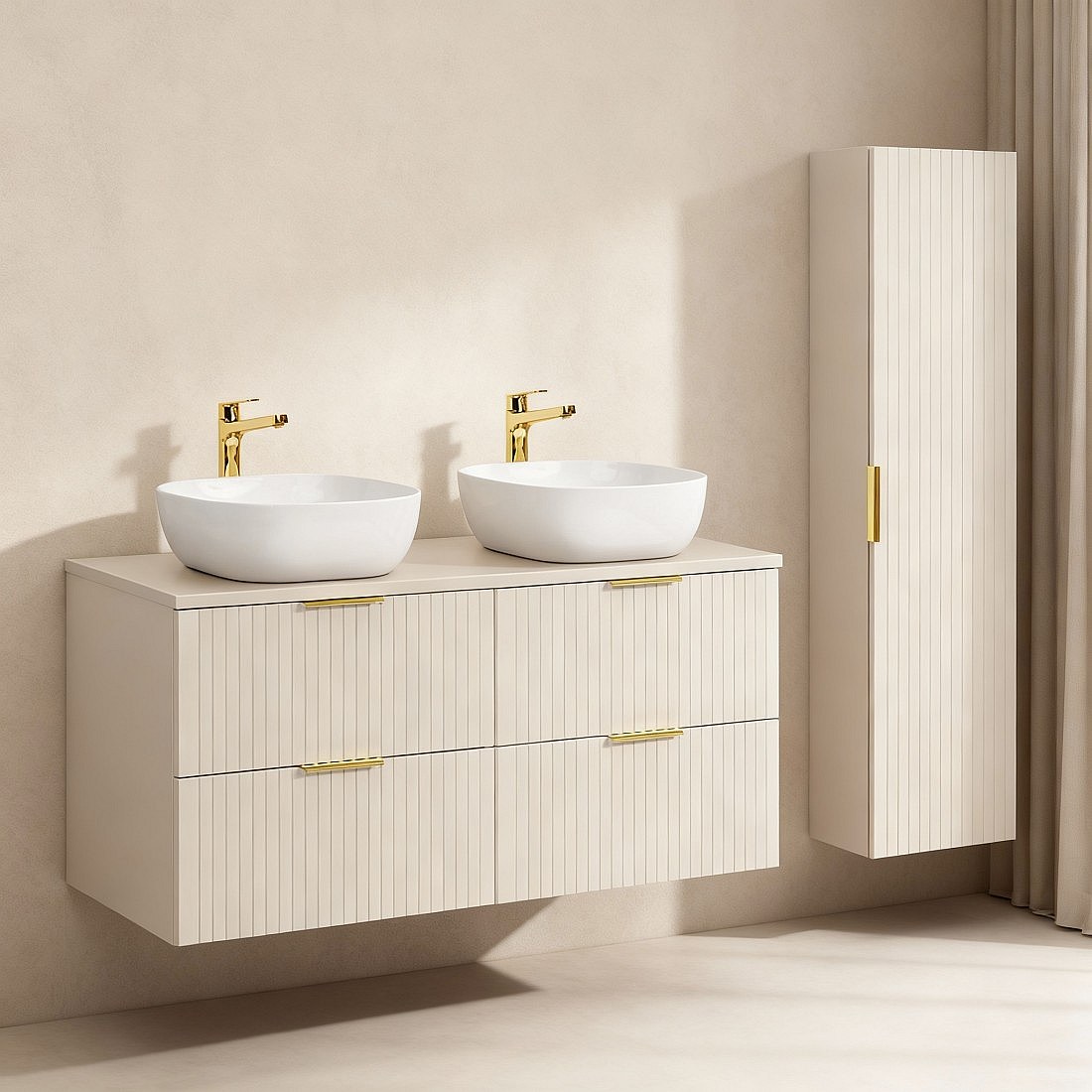 Ensemble de salle de bains NOXERA 120 cm – Marron congo – Double vasque + 4 tiroirs + colonne suspendue