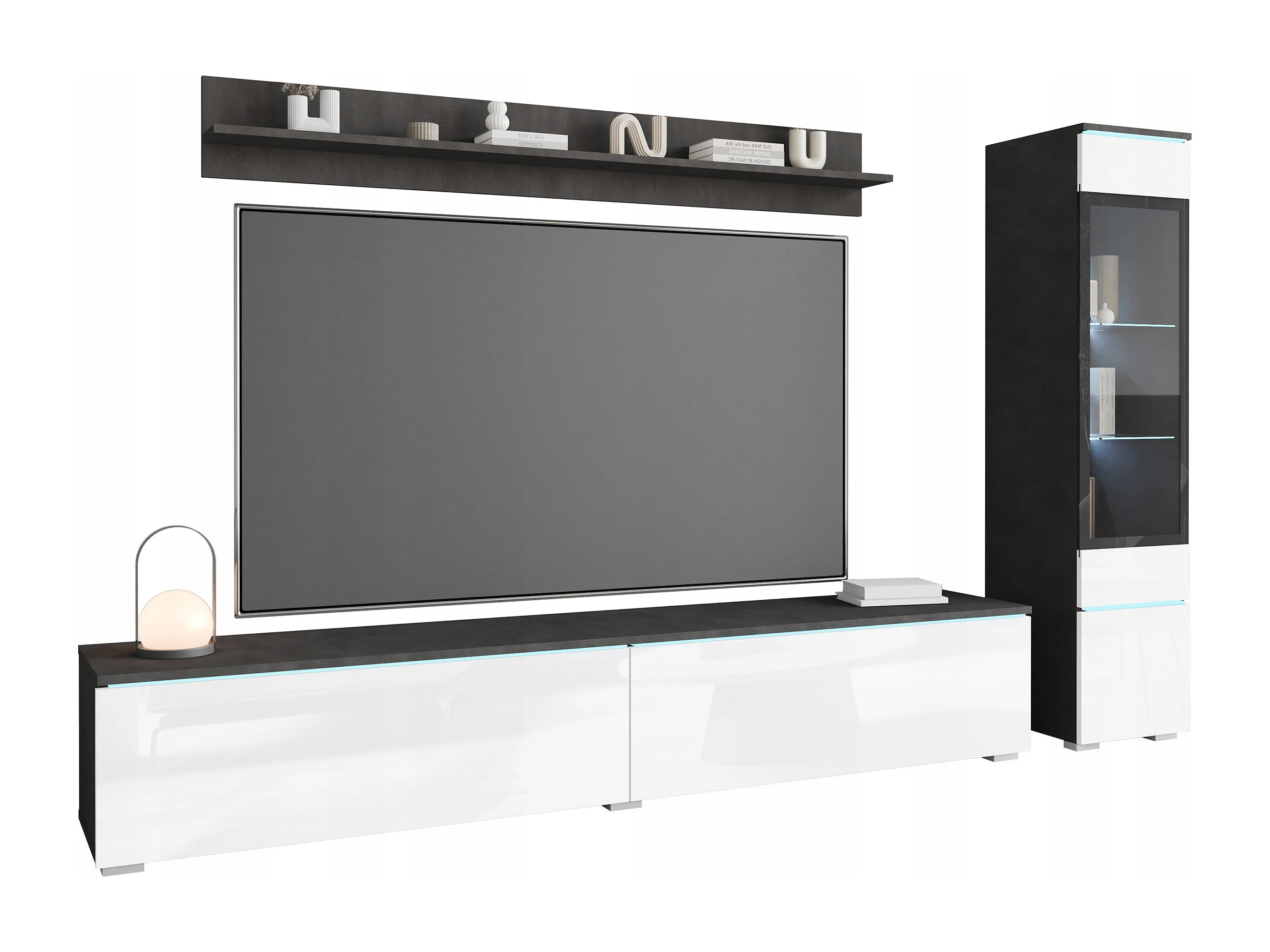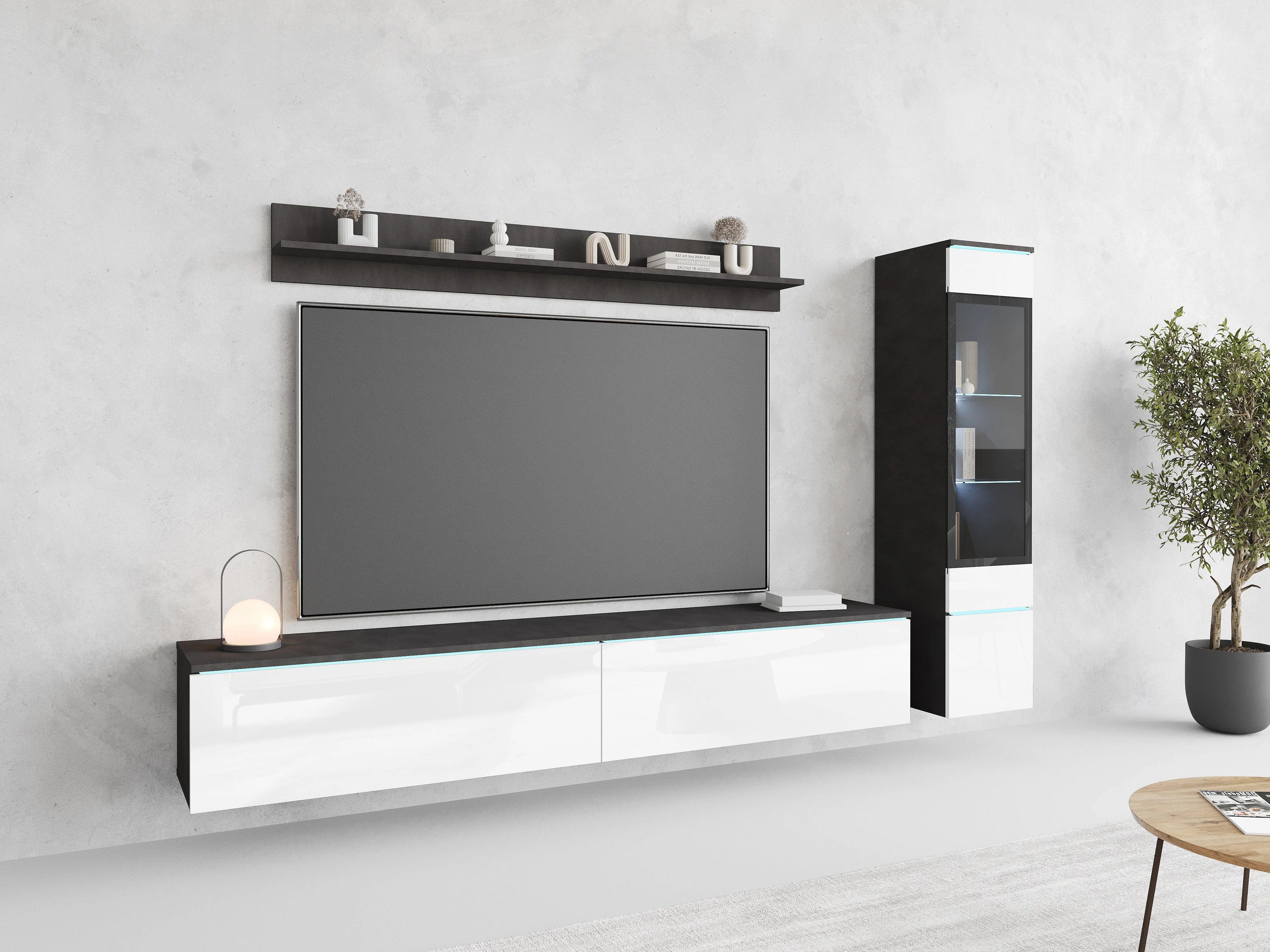 Ensemble de salon 3 éléments avec LED – meuble TV 180 cm, vitrine et étagère, à poser ou suspendu, corps anthracite, façades blanc brillant