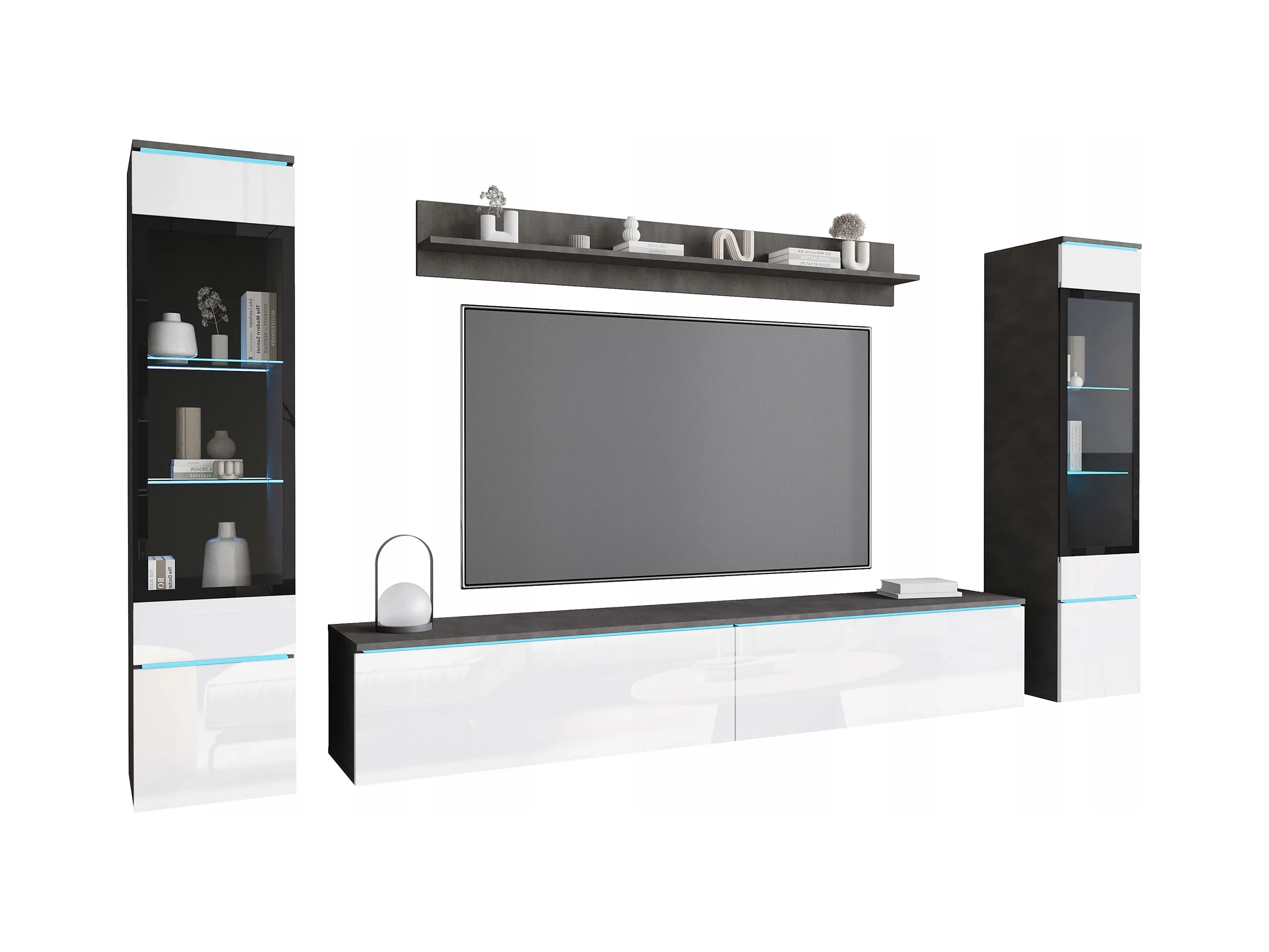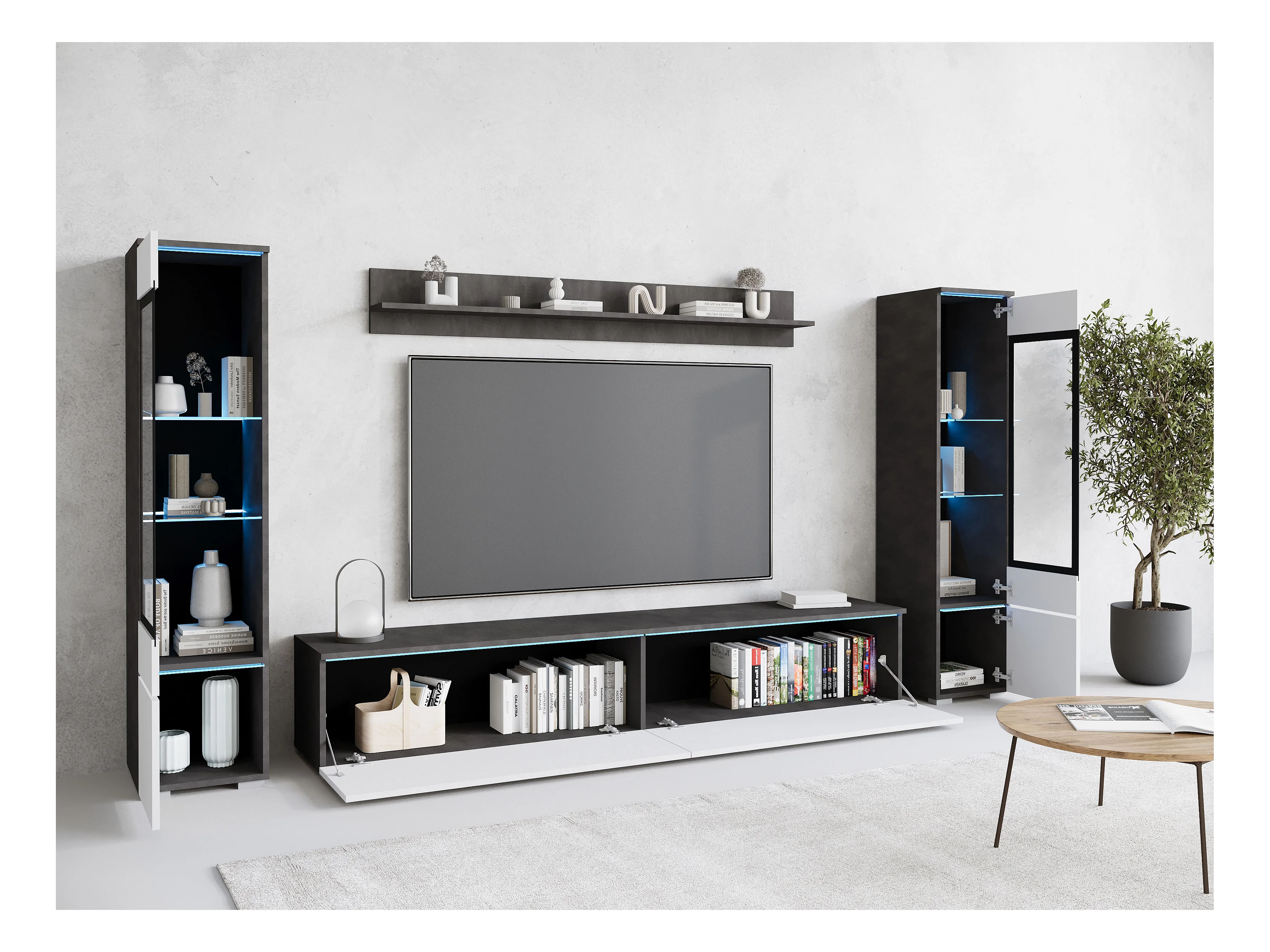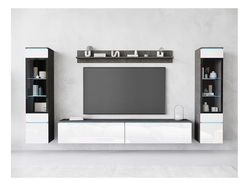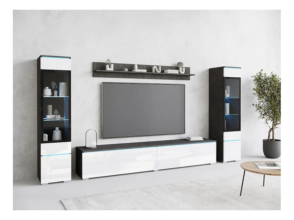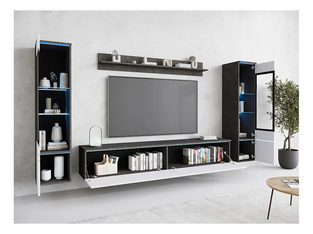 Ensemble de salon avec LED 4 éléments – meuble TV 180 cm, 2 vitrines et étagère, à poser ou suspendu, corps anthracite, façades blanc brillant