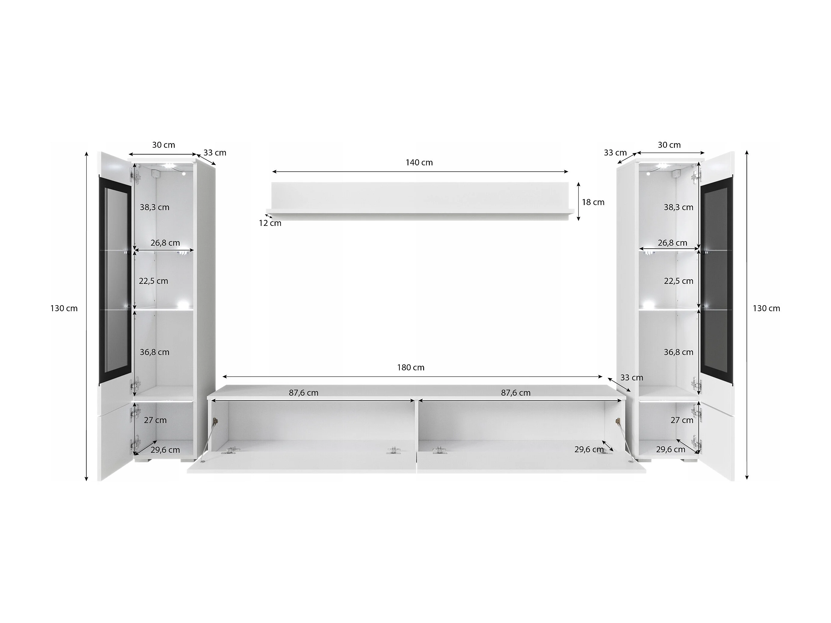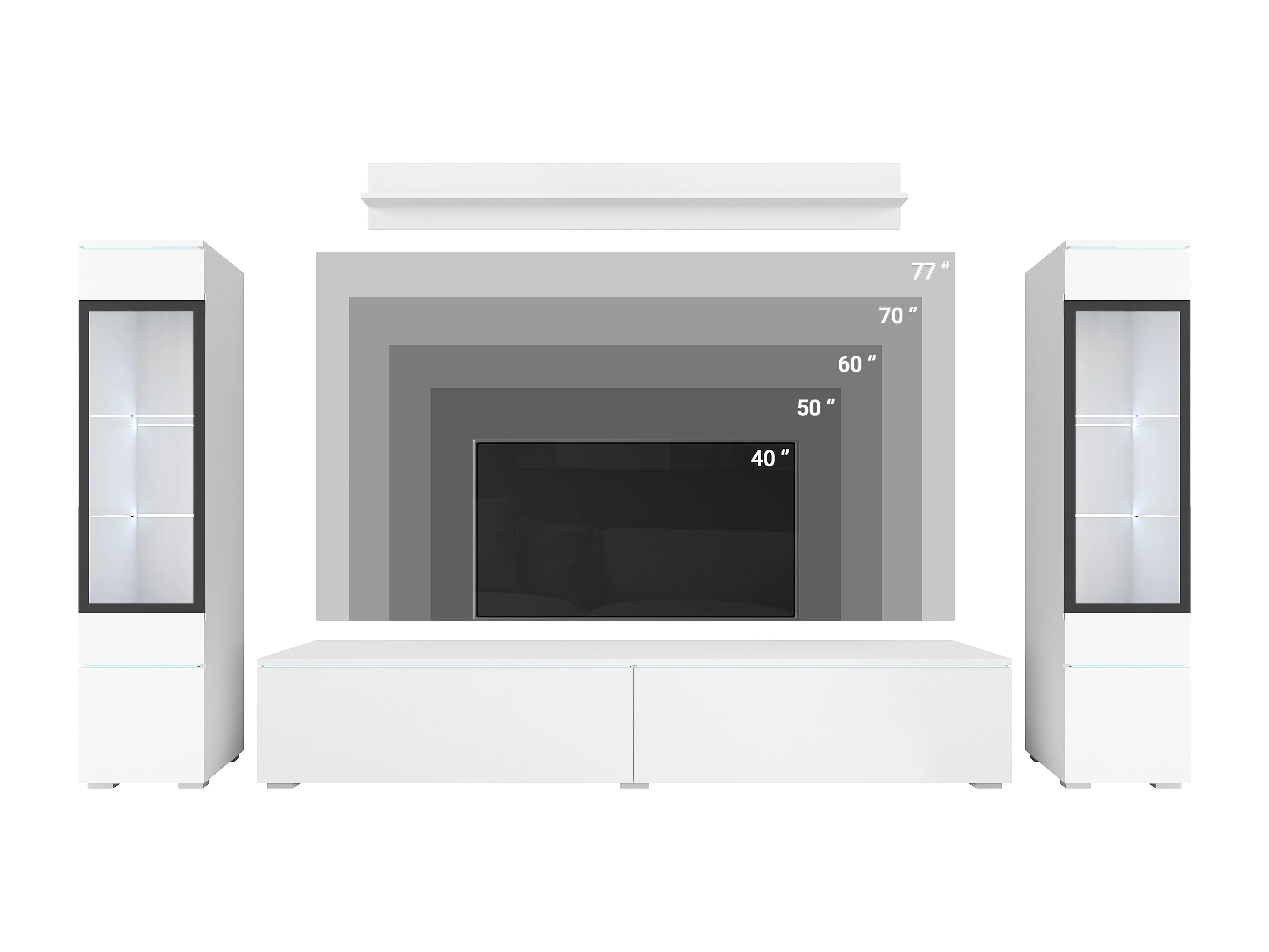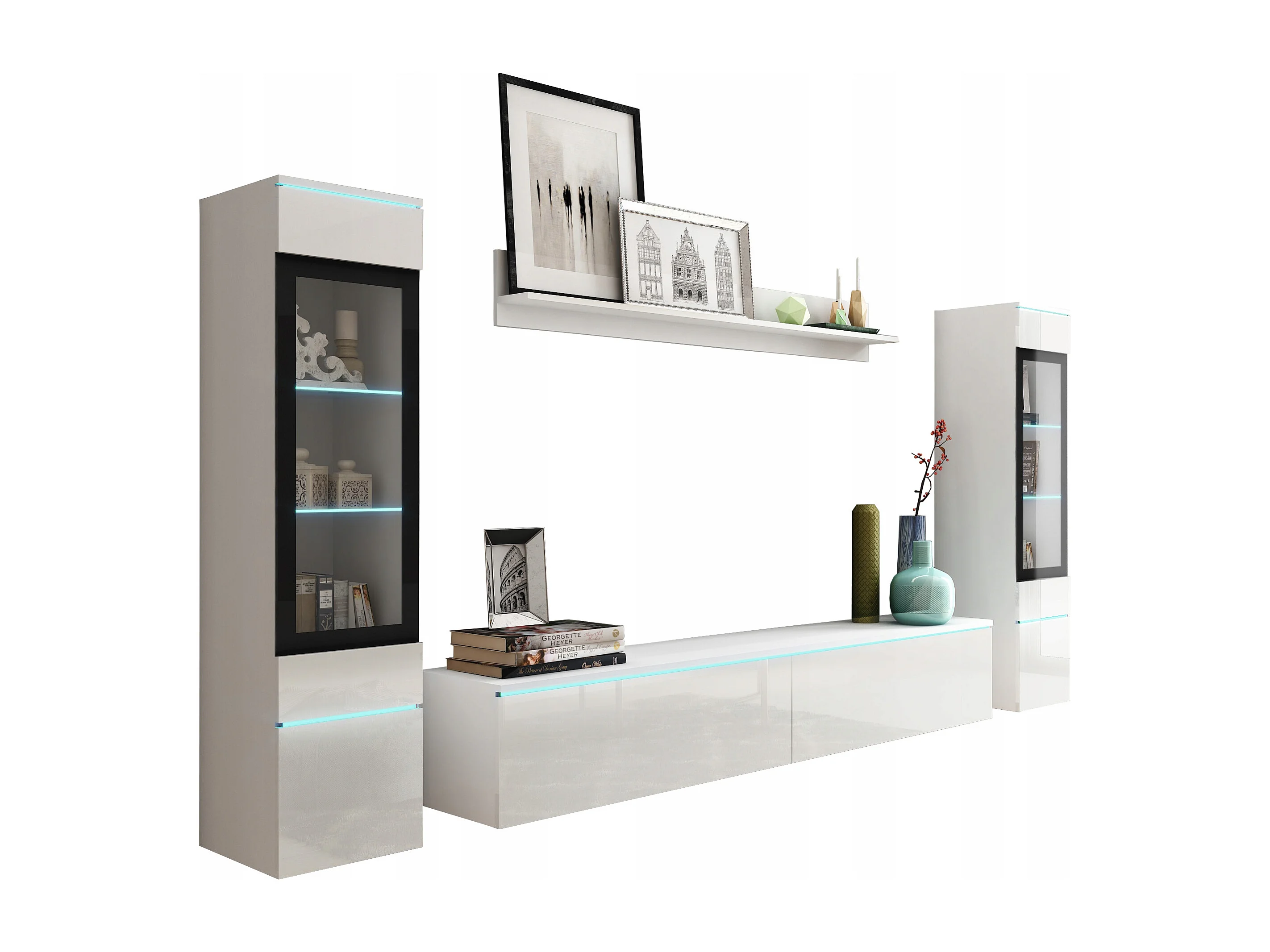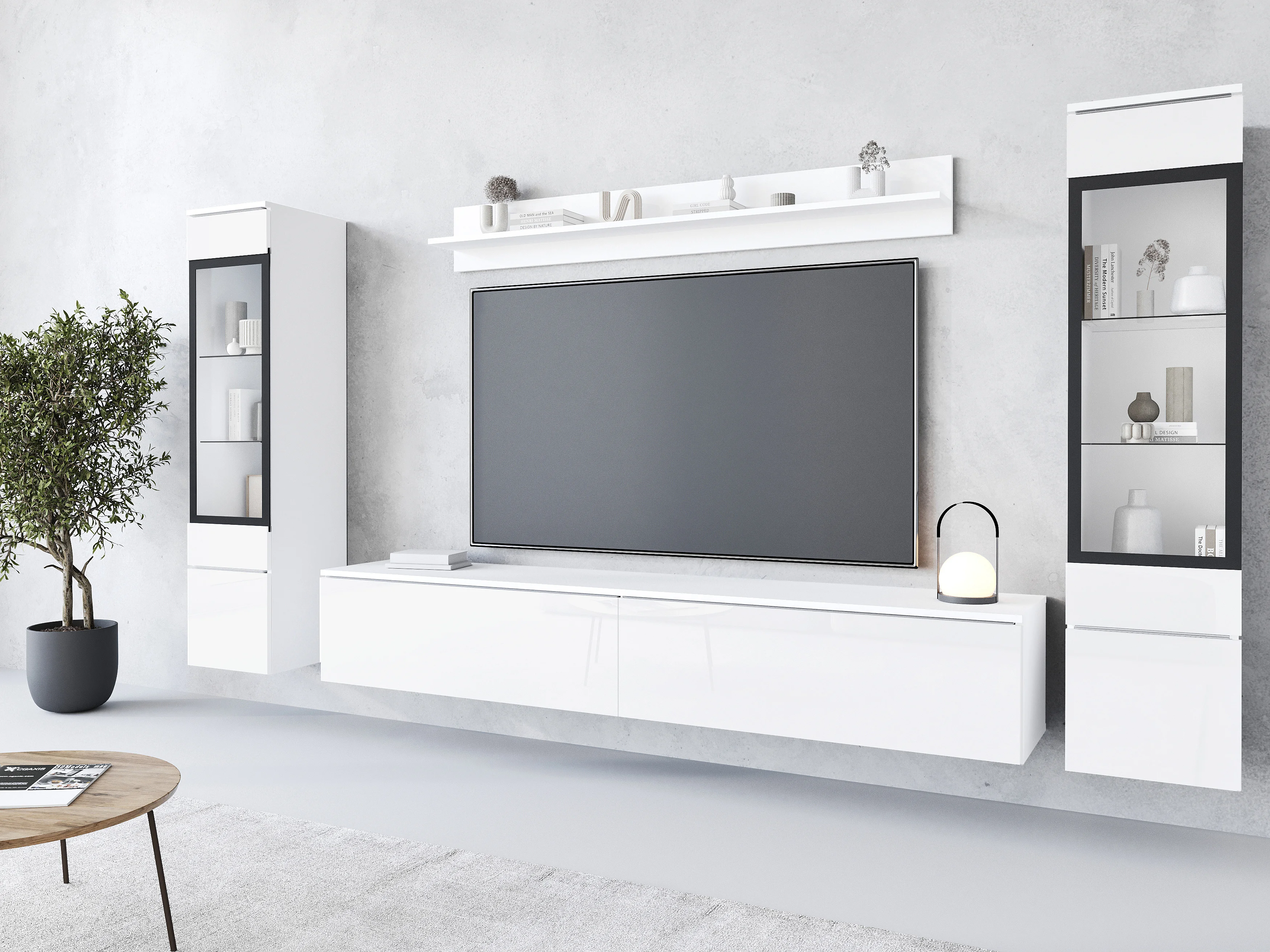 Ensemble de salon avec LED 4 éléments – meuble TV 180 cm, 2 vitrines et étagère, à poser ou suspendu, corps blanc mat, façades blanc brillant