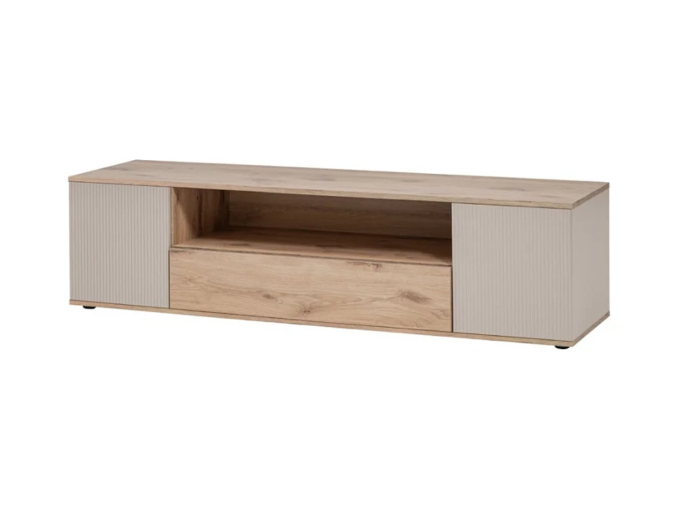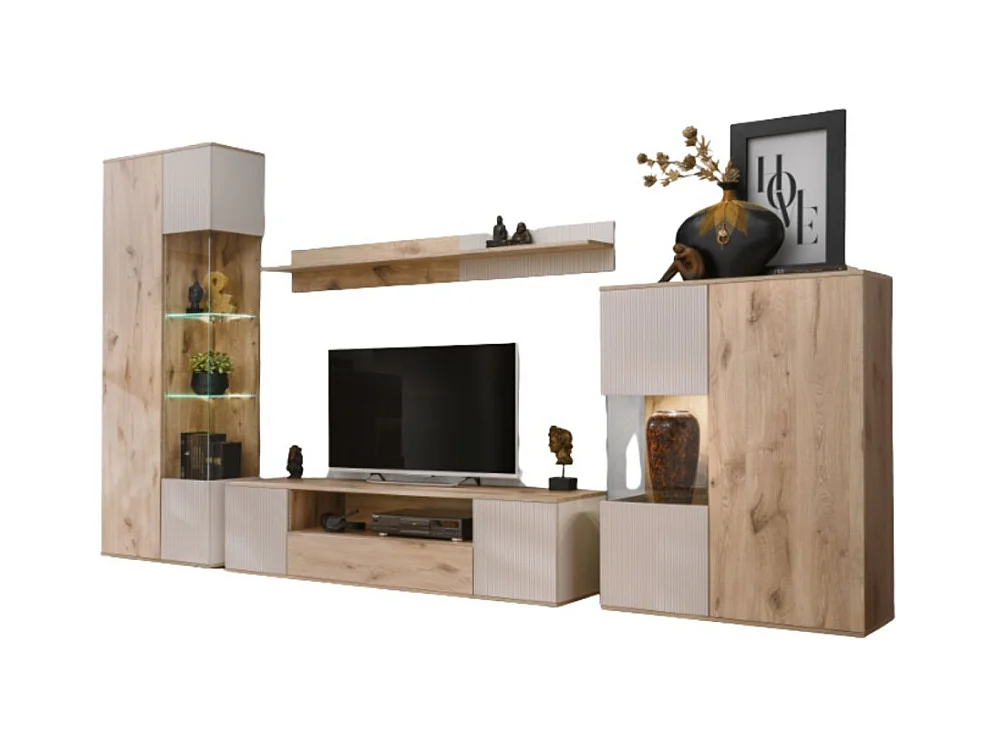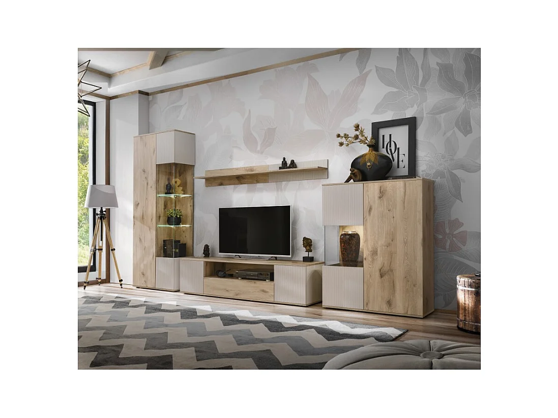 Ensemble de salon ERINA – Vitrine, meuble TV, étagère murale et buffet haut – Chêne clair et beige