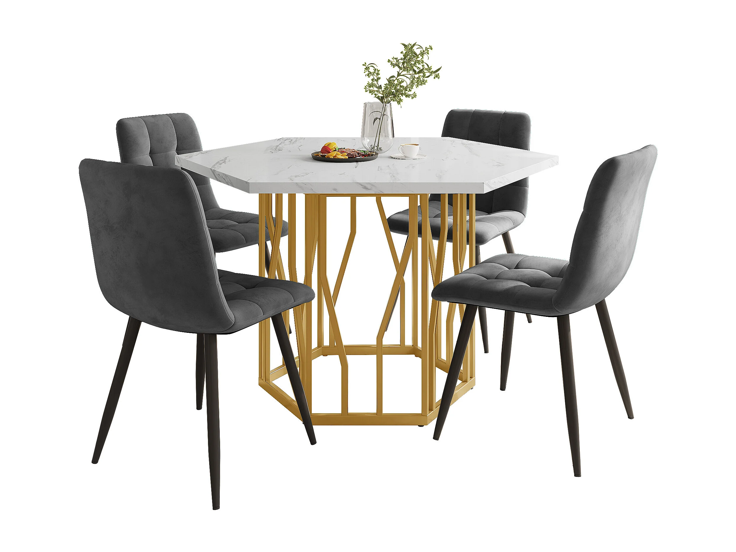 Ensemble de table à manger et chaises (5 pièces), table en marbre hexagonale moderne + 4 chaises en velours gris avec pieds dorés (115.5x100x75 cm)