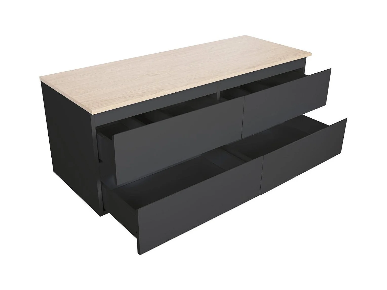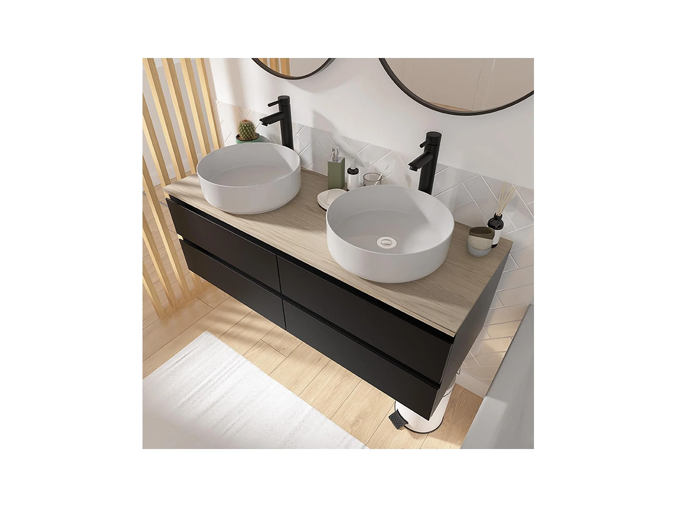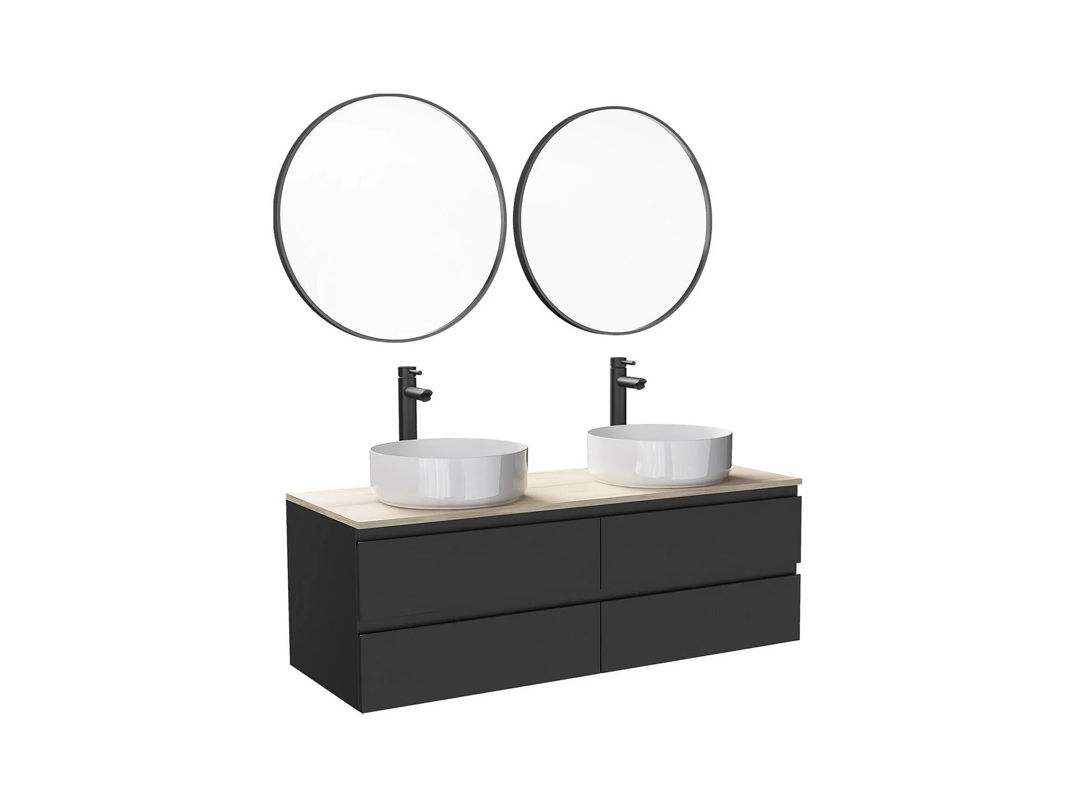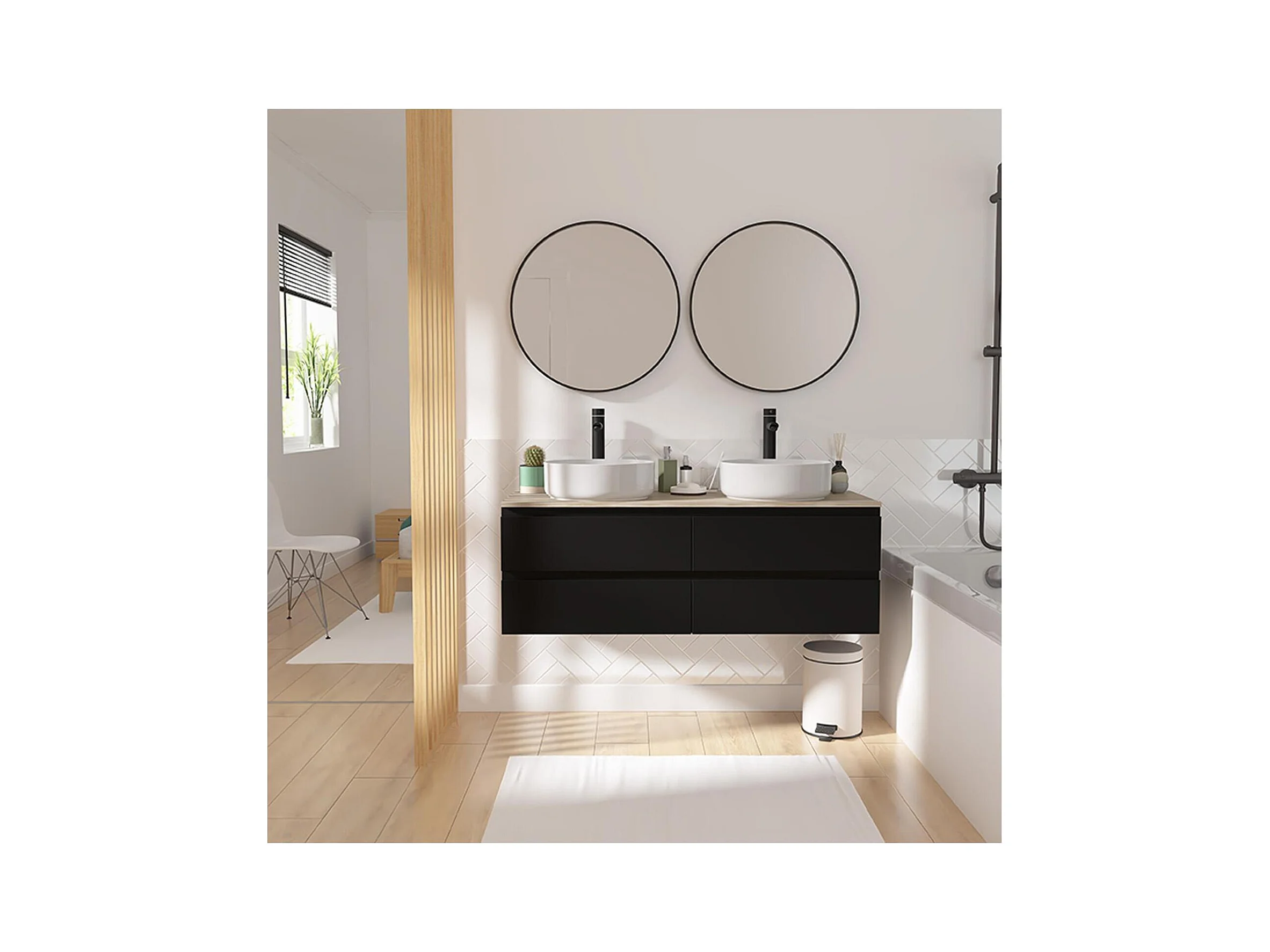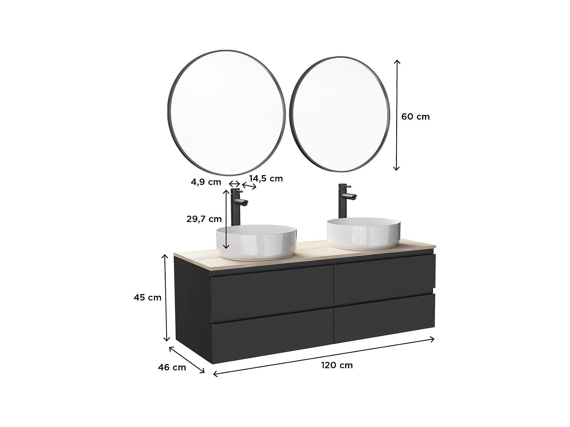 Ensemble double vasque suspendu avec plan bois, vasques, robinets et miroirs 120cm