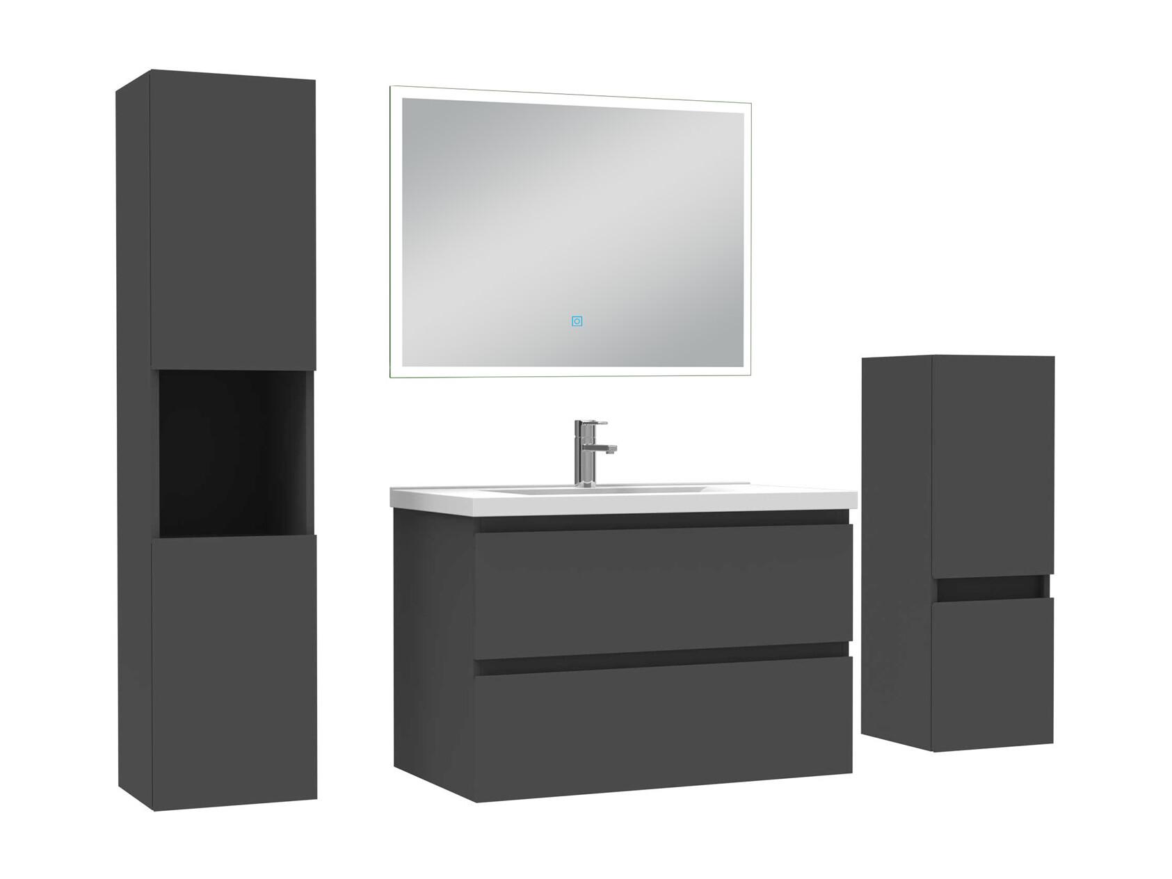Ensemble meuble Salle de Bain 80cm avec simple vasque et colonne et miroir lumineux dimmable anthracite