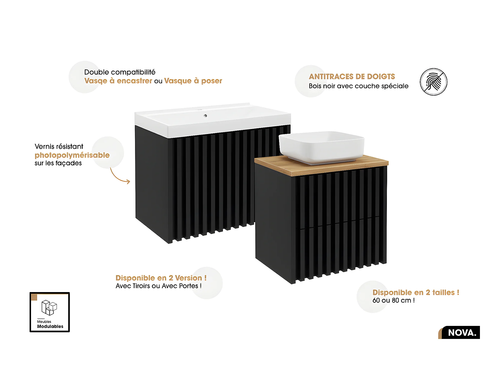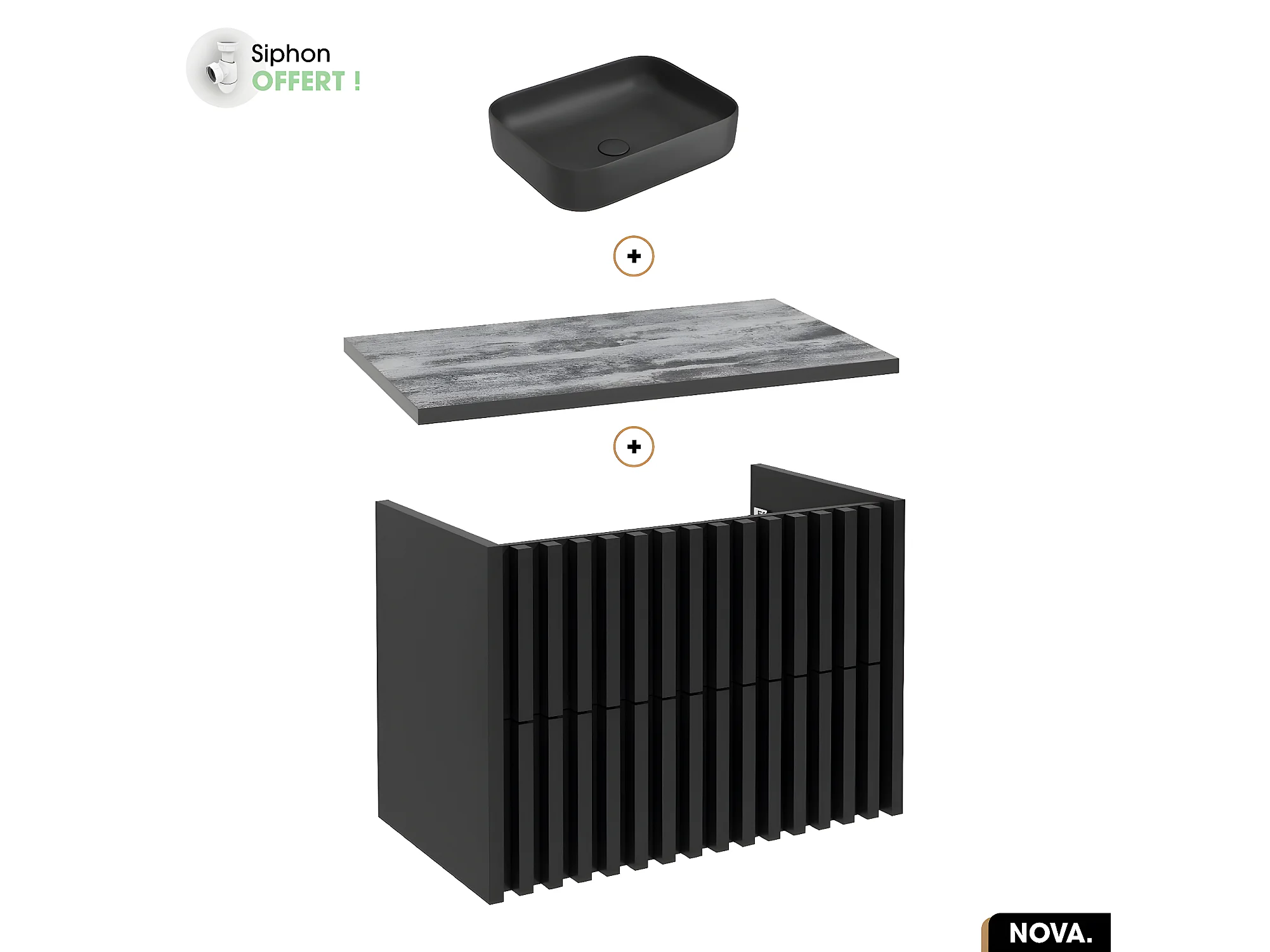 Ensemble meuble sous vasque avec vasque à poser - Siphon OFFERT | NOVA | NOIR | 80 x 56 x 45 cm