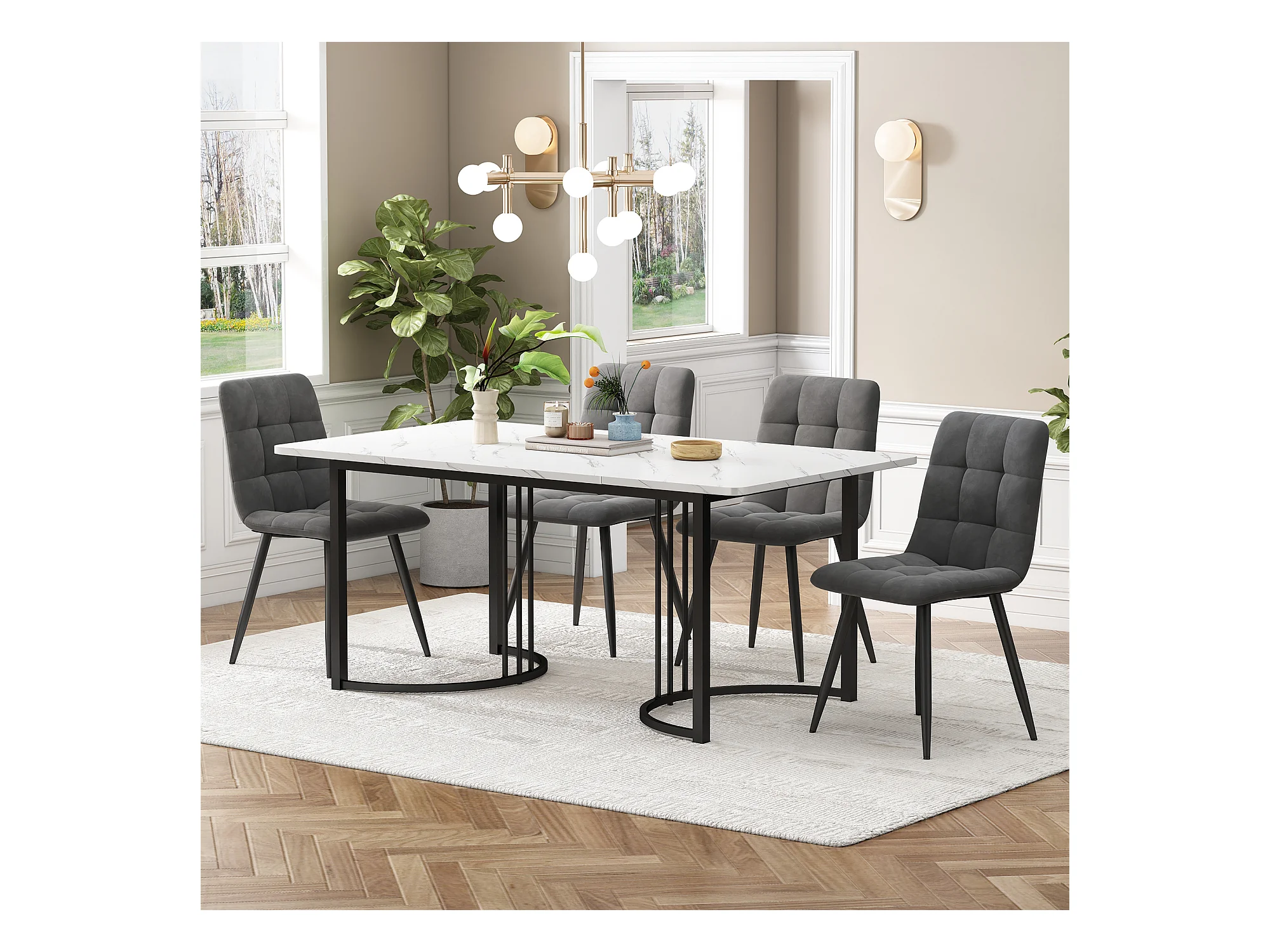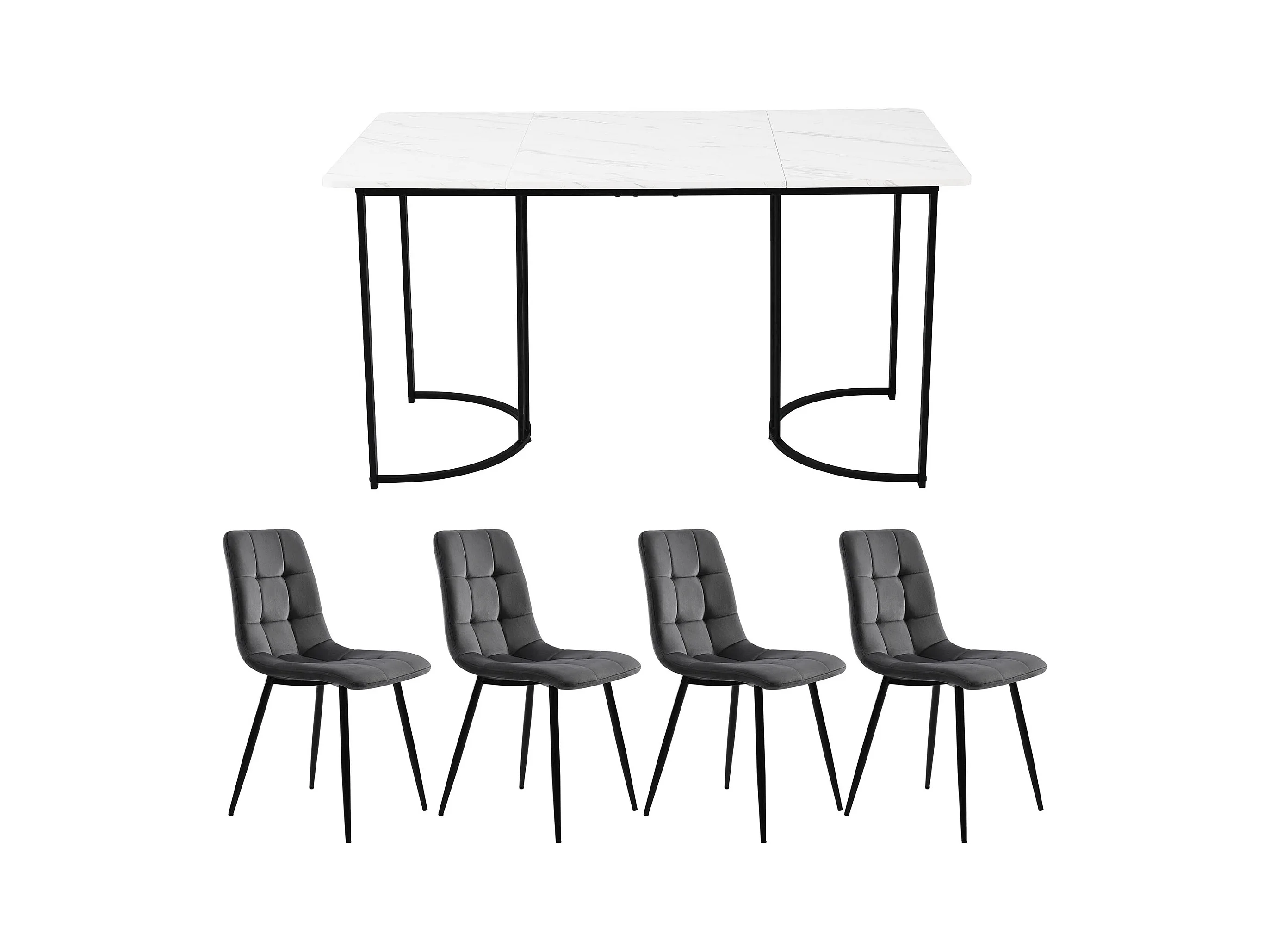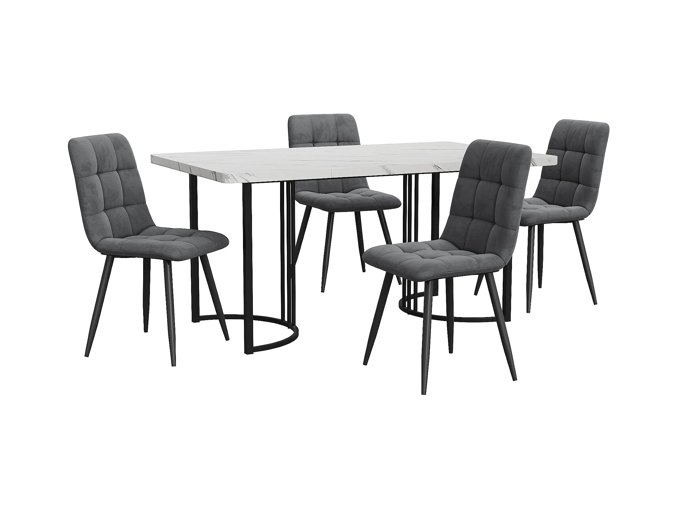 Ensemble salle à manger 5 pièces, table avec 4 chaises, velours gris motif diamant, pieds métalliques noirs, MDF blanc (140x80x75 cm)