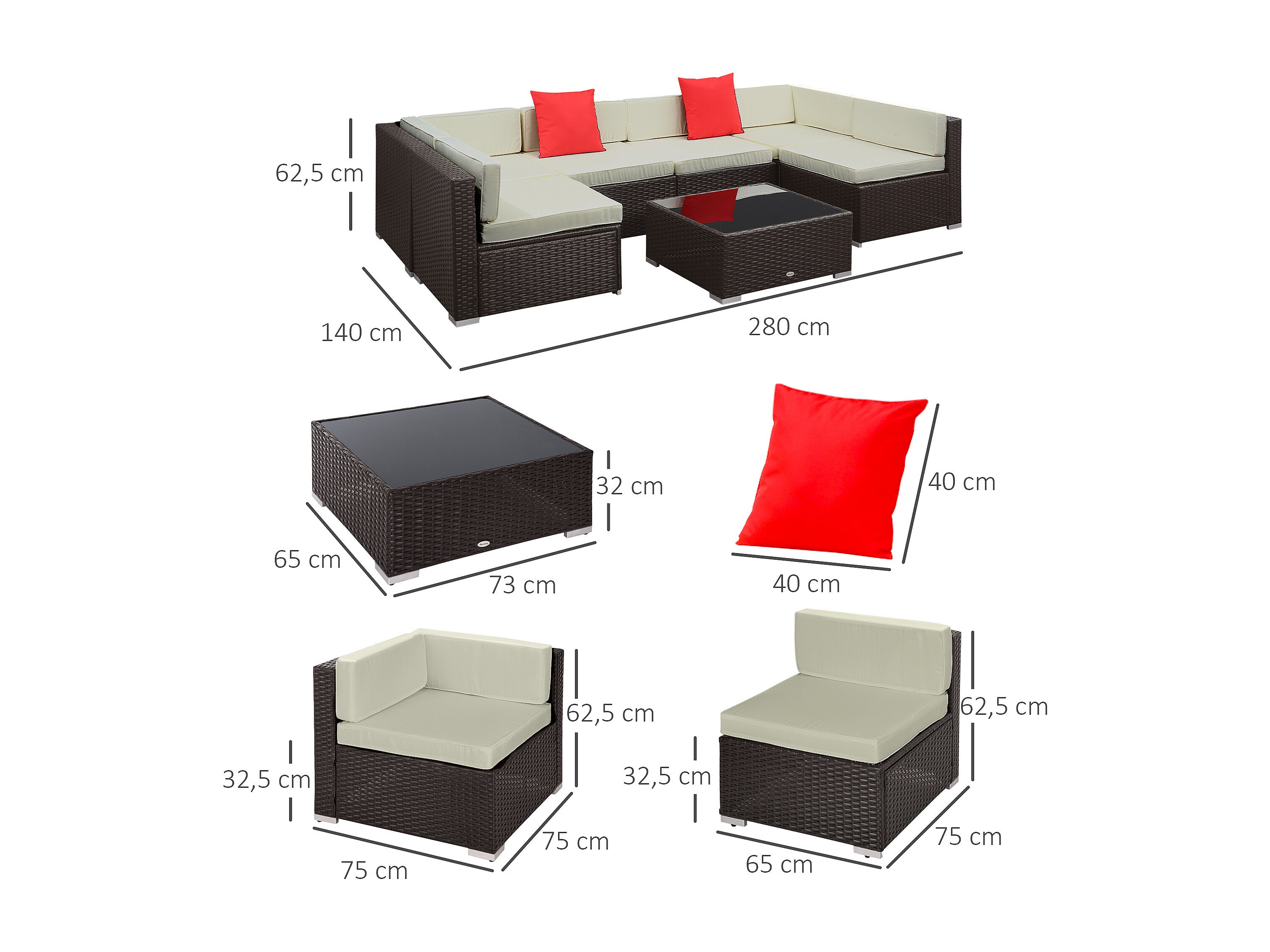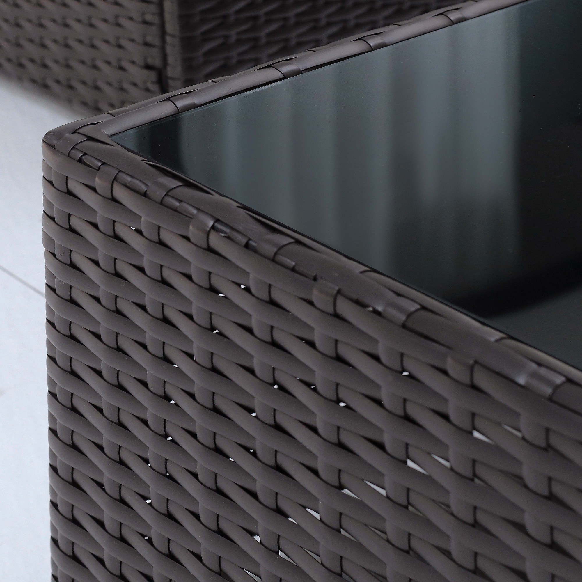 Ensemble salon de jardin 7 pièces modulables table basse plateau verre trempé coussins déhoussables inclus résine tressée imitation rotin brun foncé