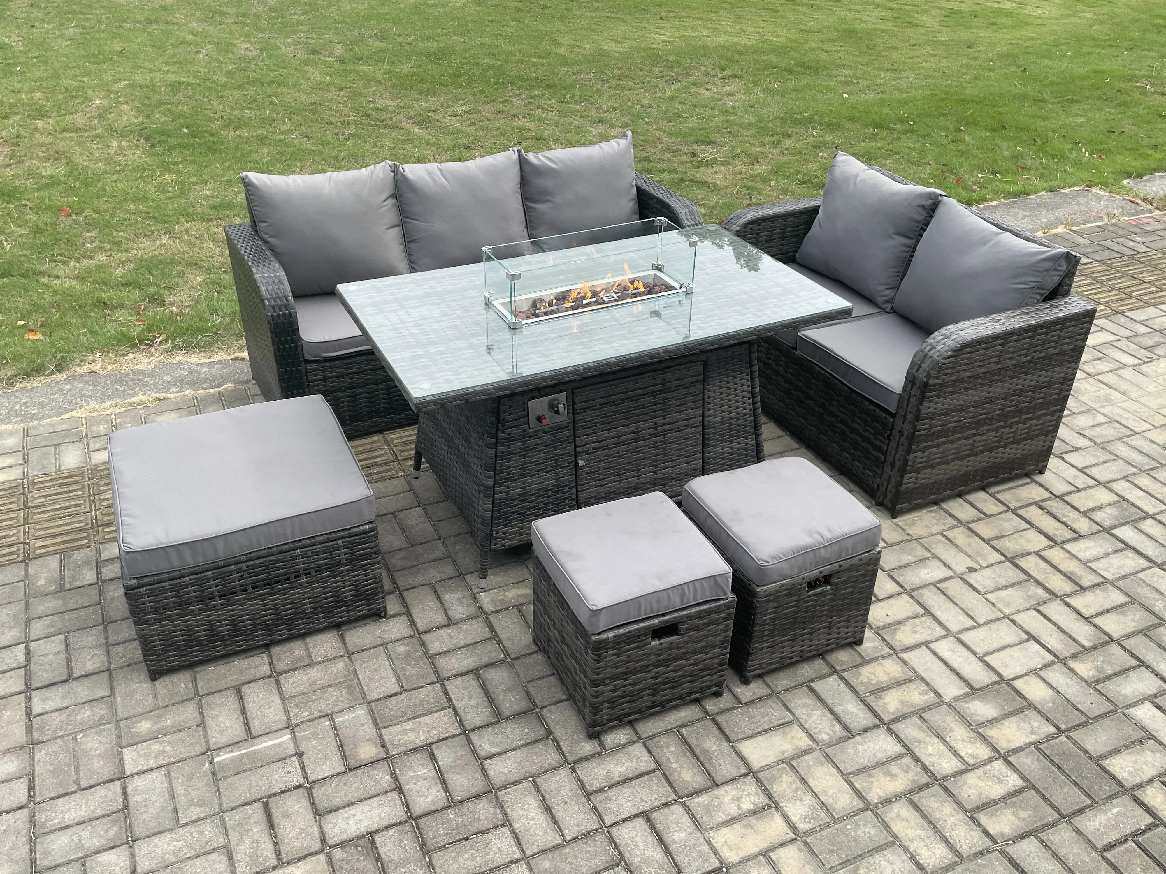 Ensemble Salon de Jardin Extérieur en polyrotin Table de foyer à gaz et Canapé Fauteuil avec 3 Tabourets Gris foncé mixte
