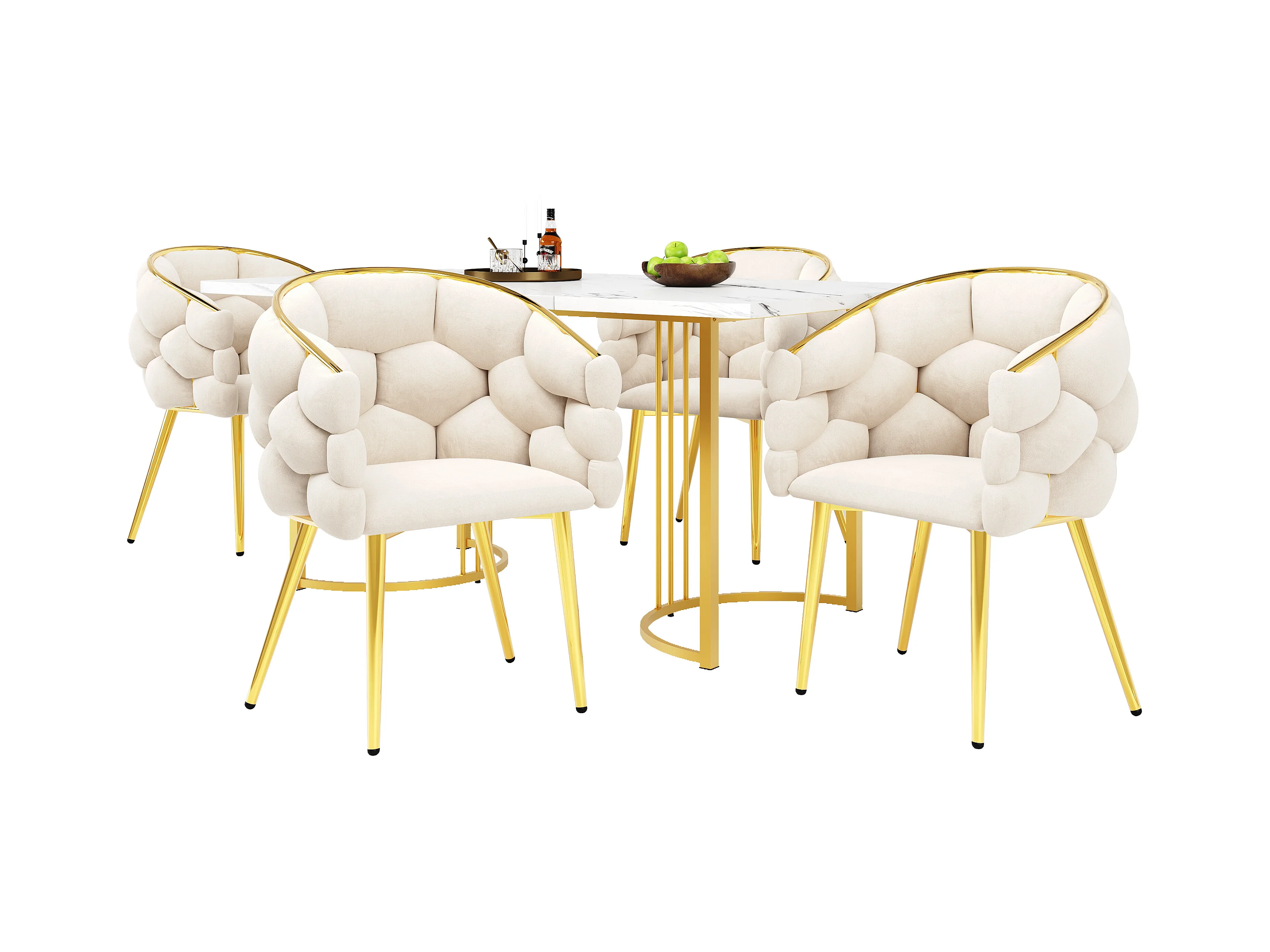 Ensemble table à manger + 4 chaises en velours - 140 x 80 x 75 cm - MDF + Pieds en métal doré - Blanc + beige