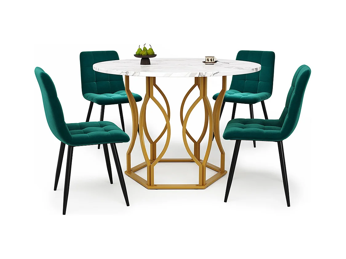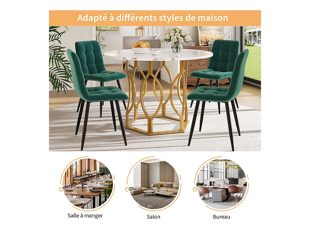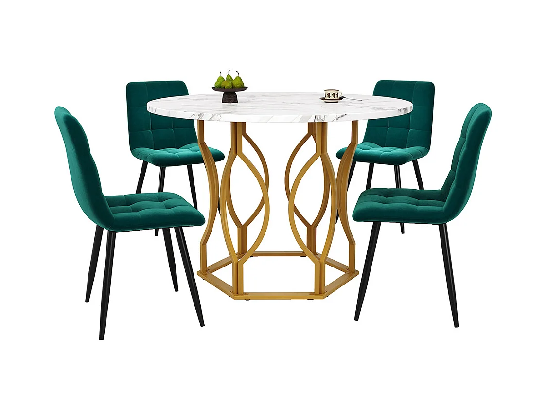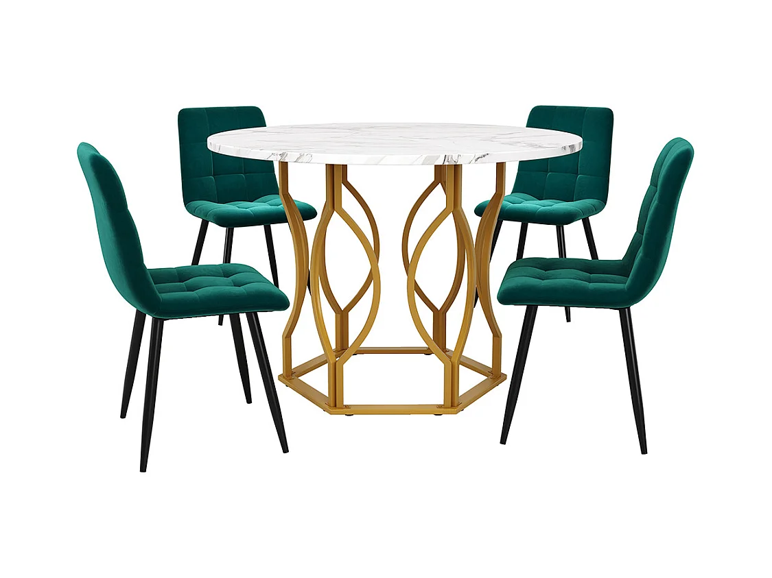 Ensemble table à manger 5 pièces 4 chaises table ronde 100cm pieds dorés plateau blanc chaises velours vert foncé
