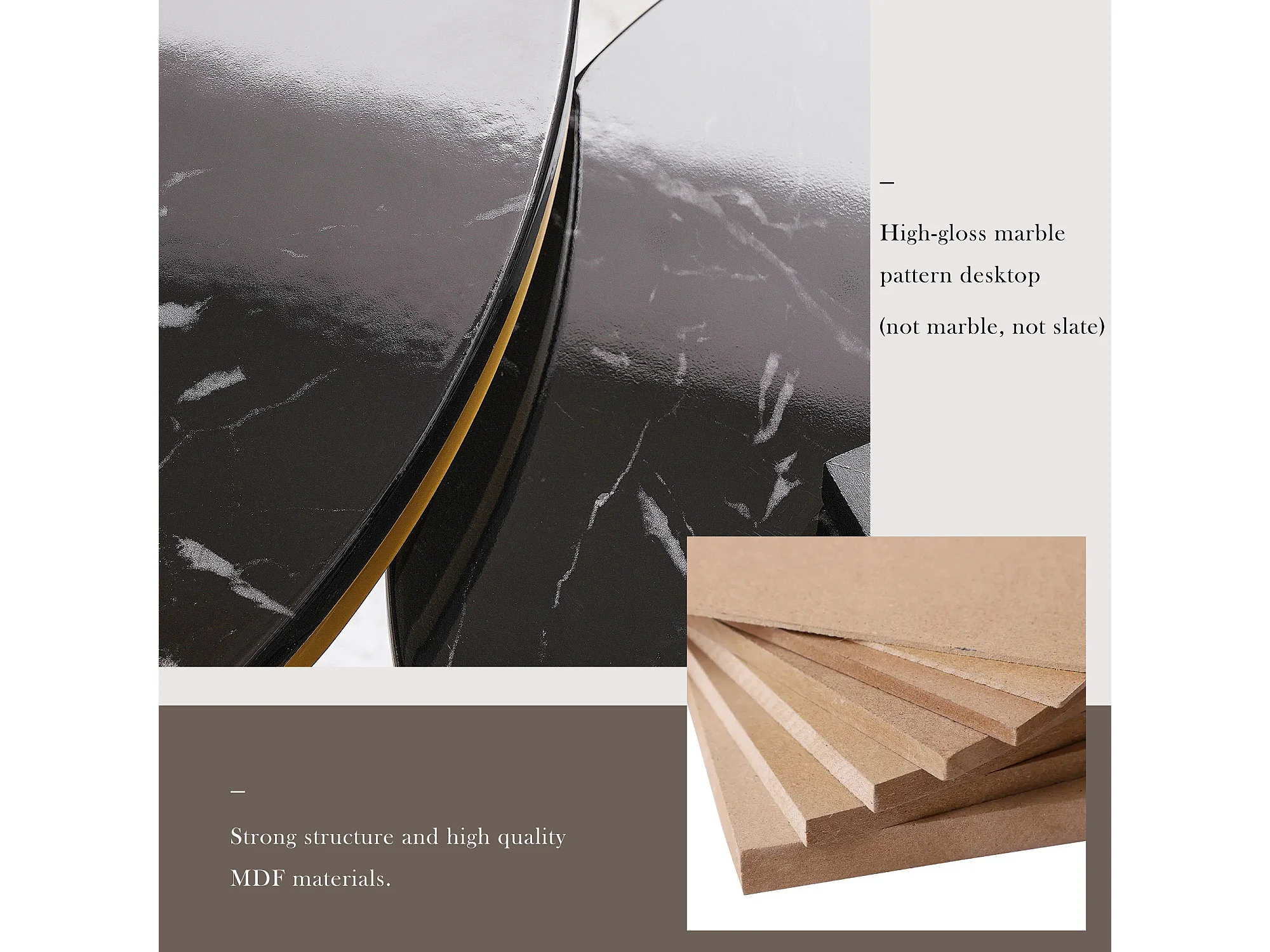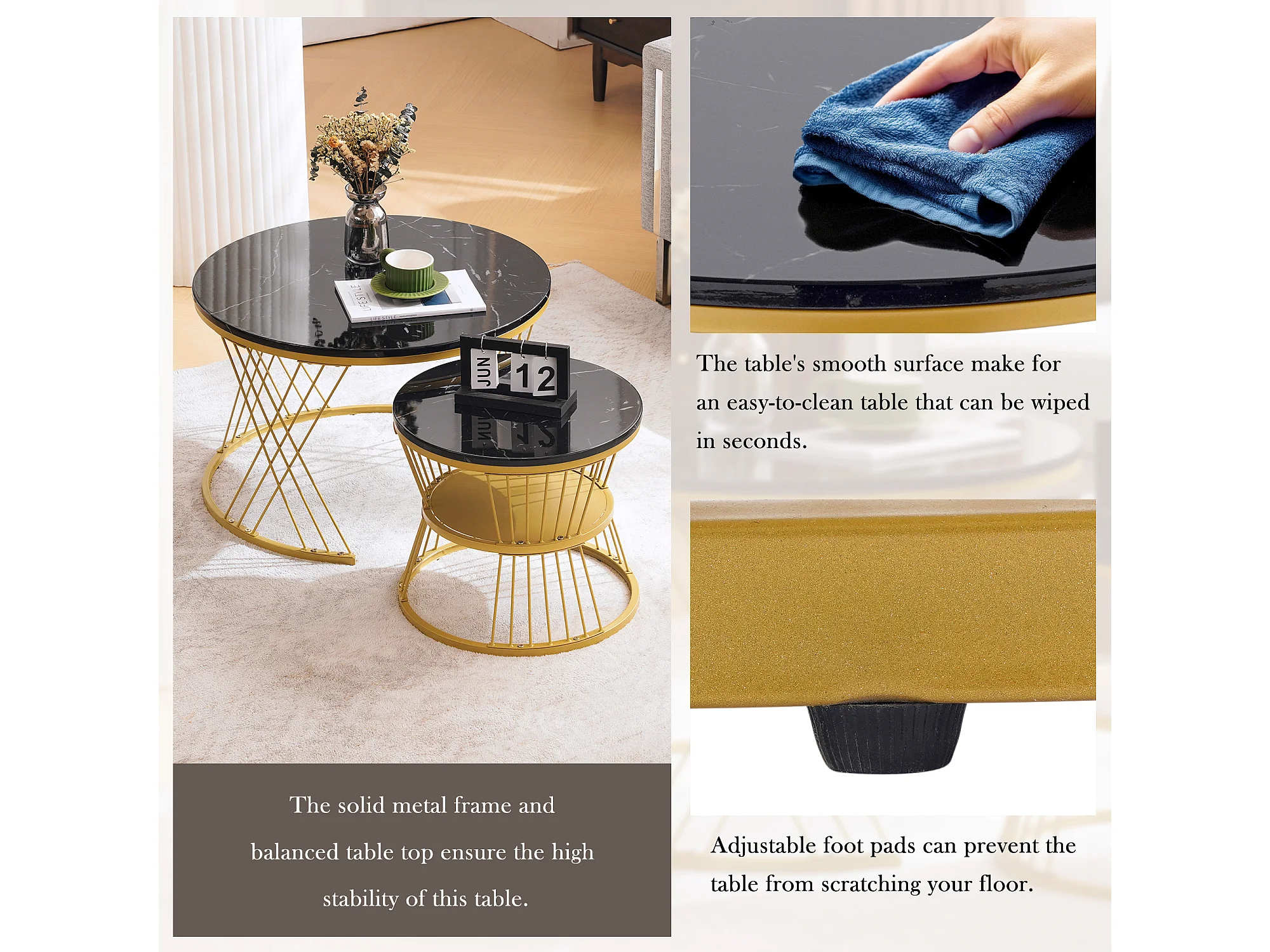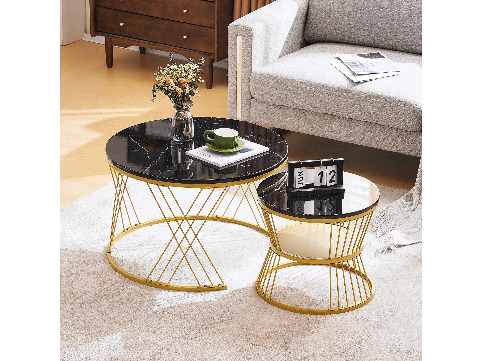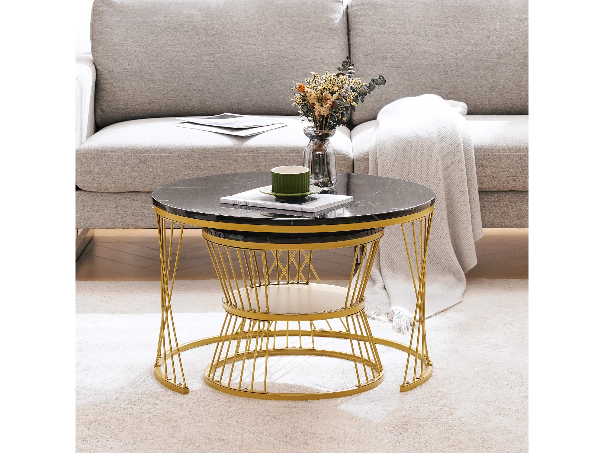 URBAN MEUBLE Ensemble table basse rondes gigogne haute brillance effet marbre noir structure couleur dorée