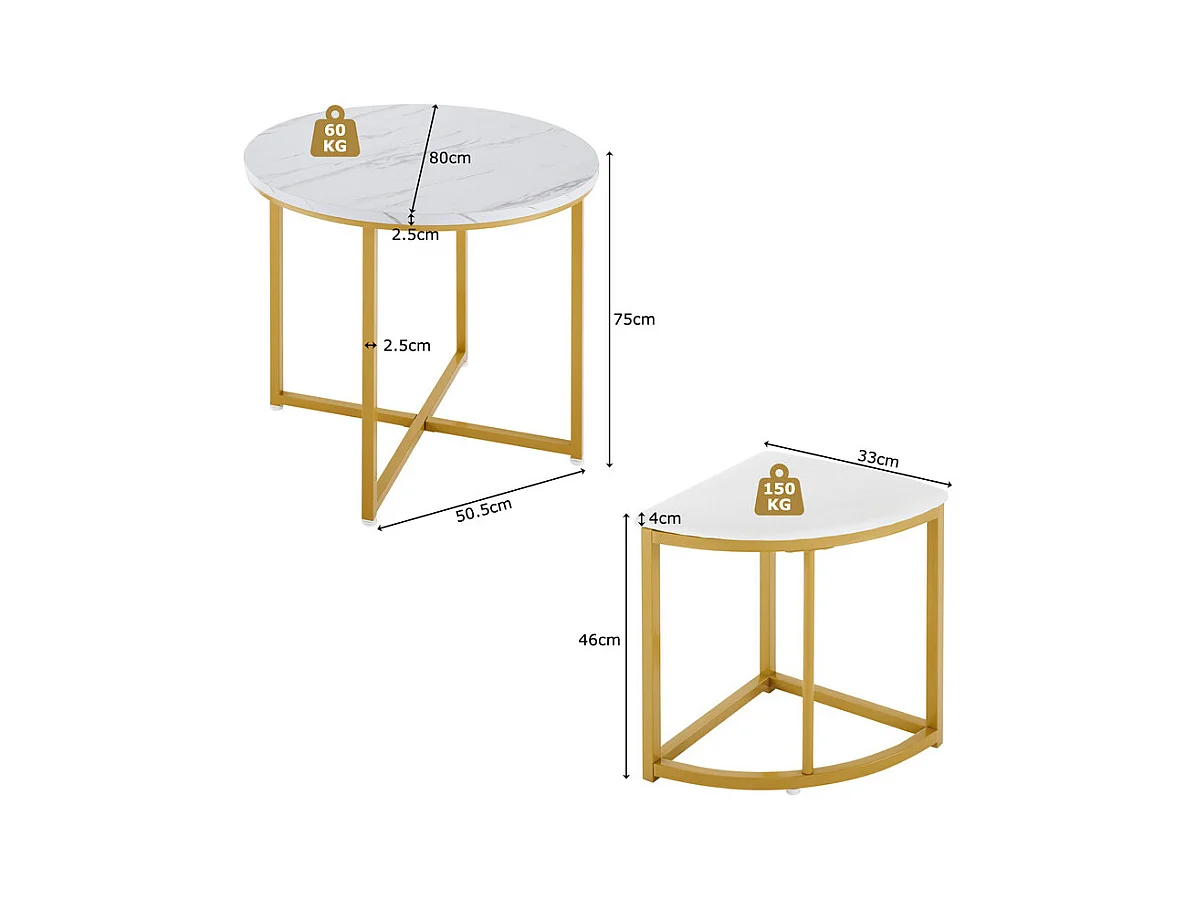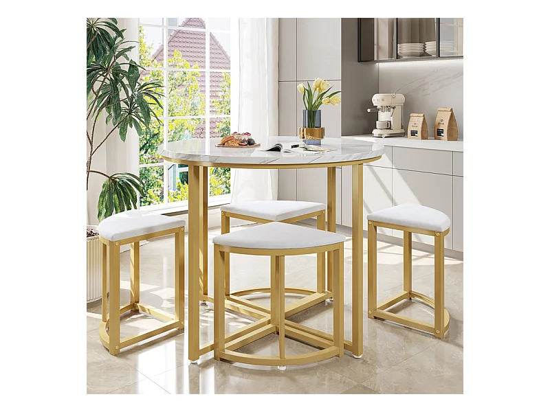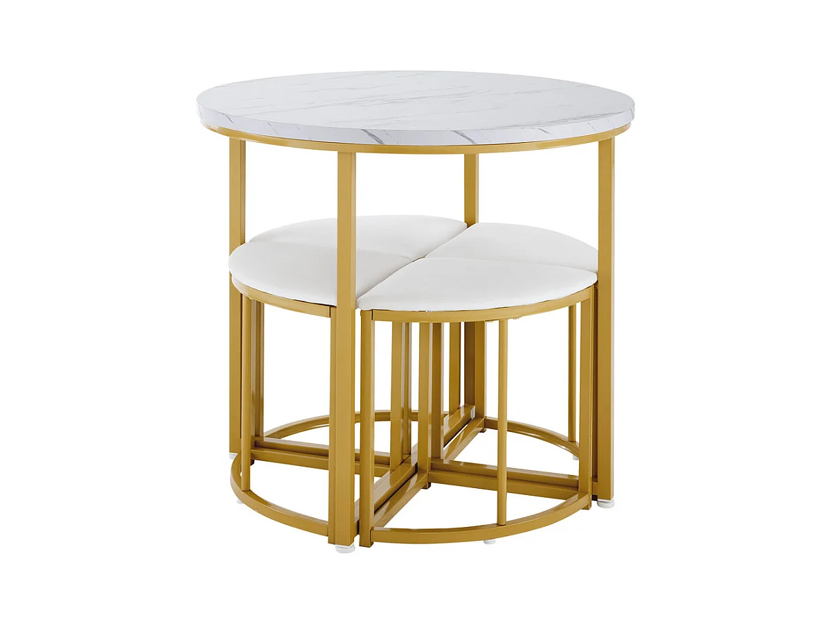 Ensemble table ronde et 4 chaises en velours blanc, MDF + cadres en fer doré, table à manger 80 x 80 x 75cm