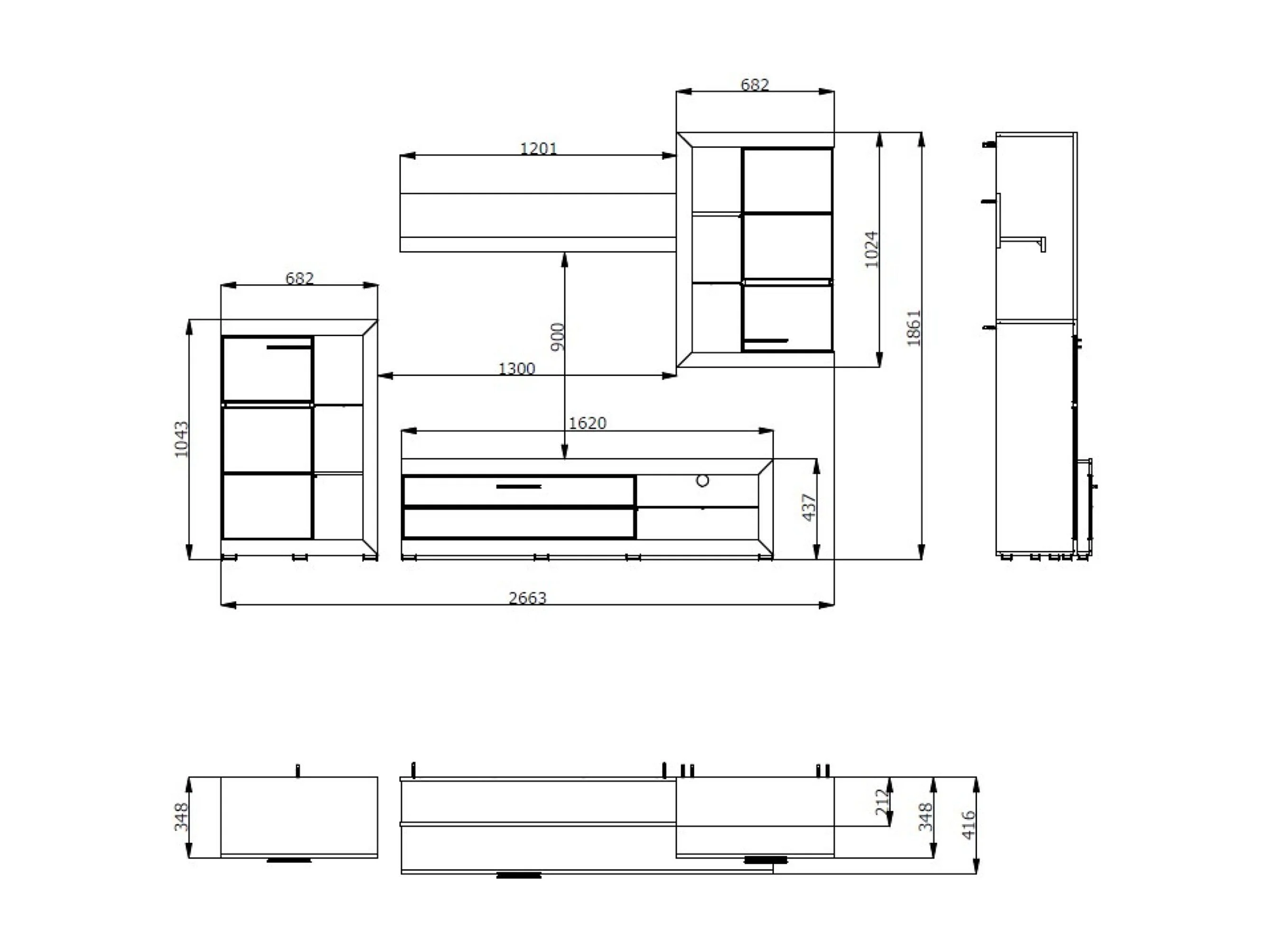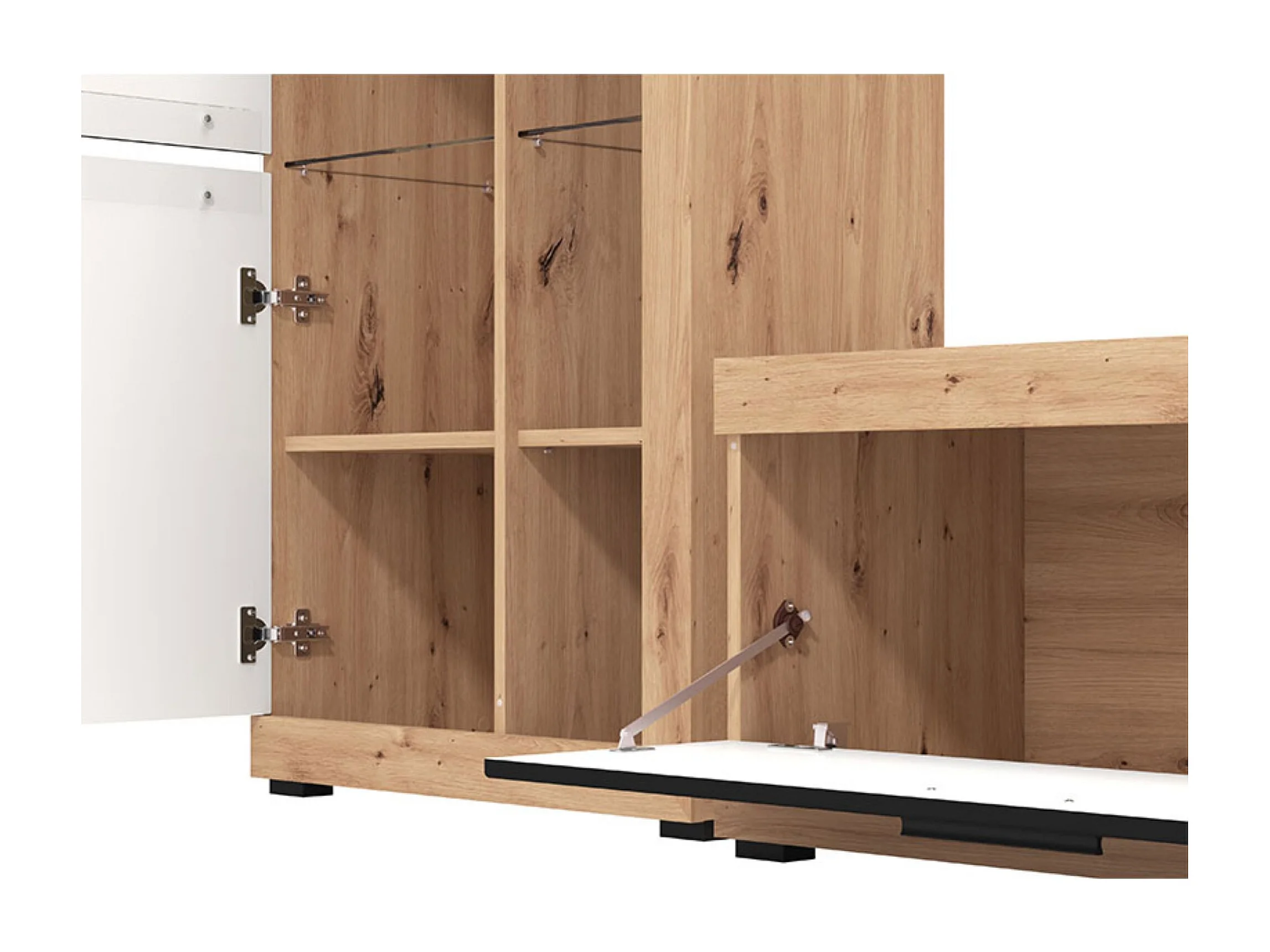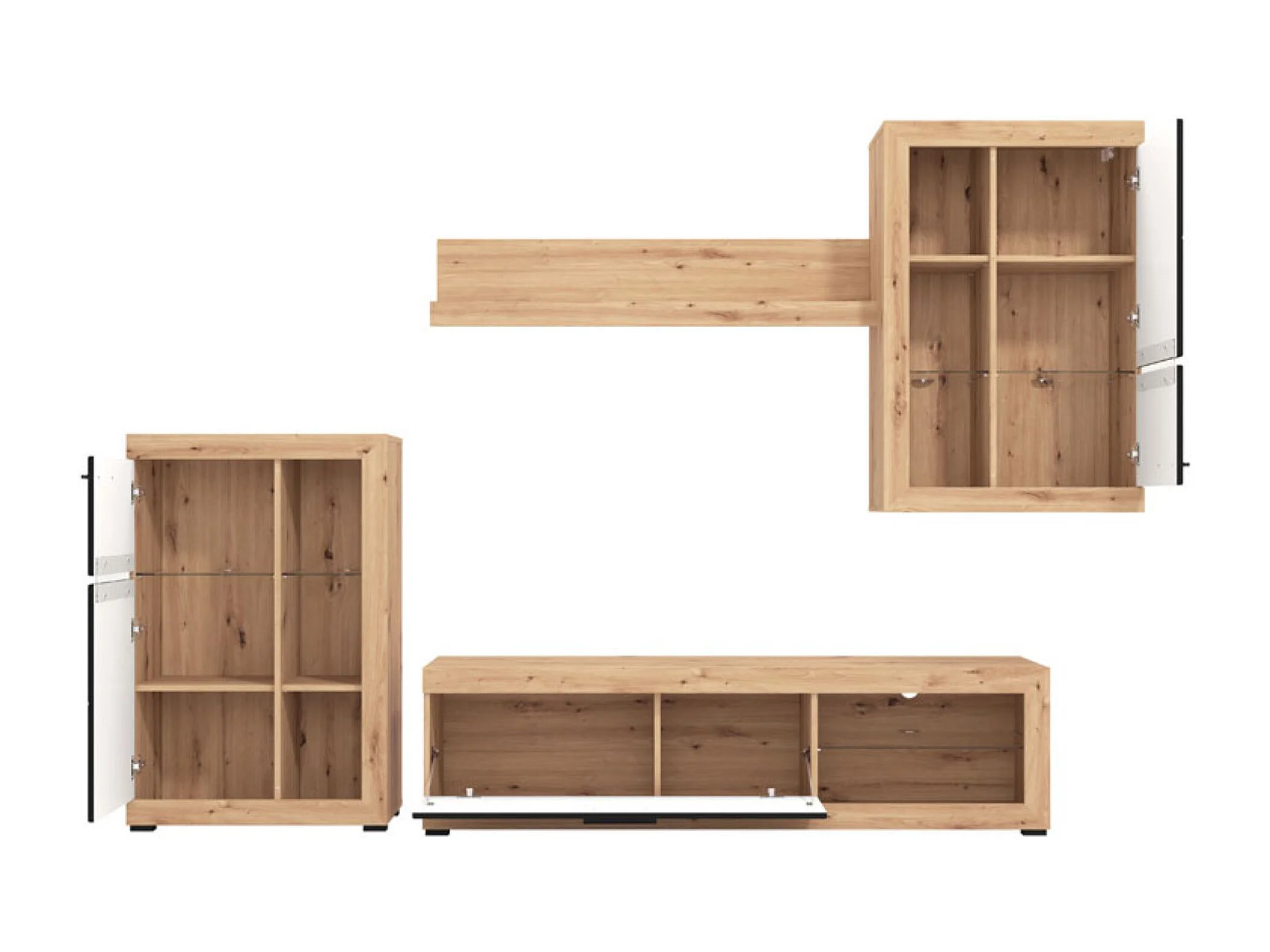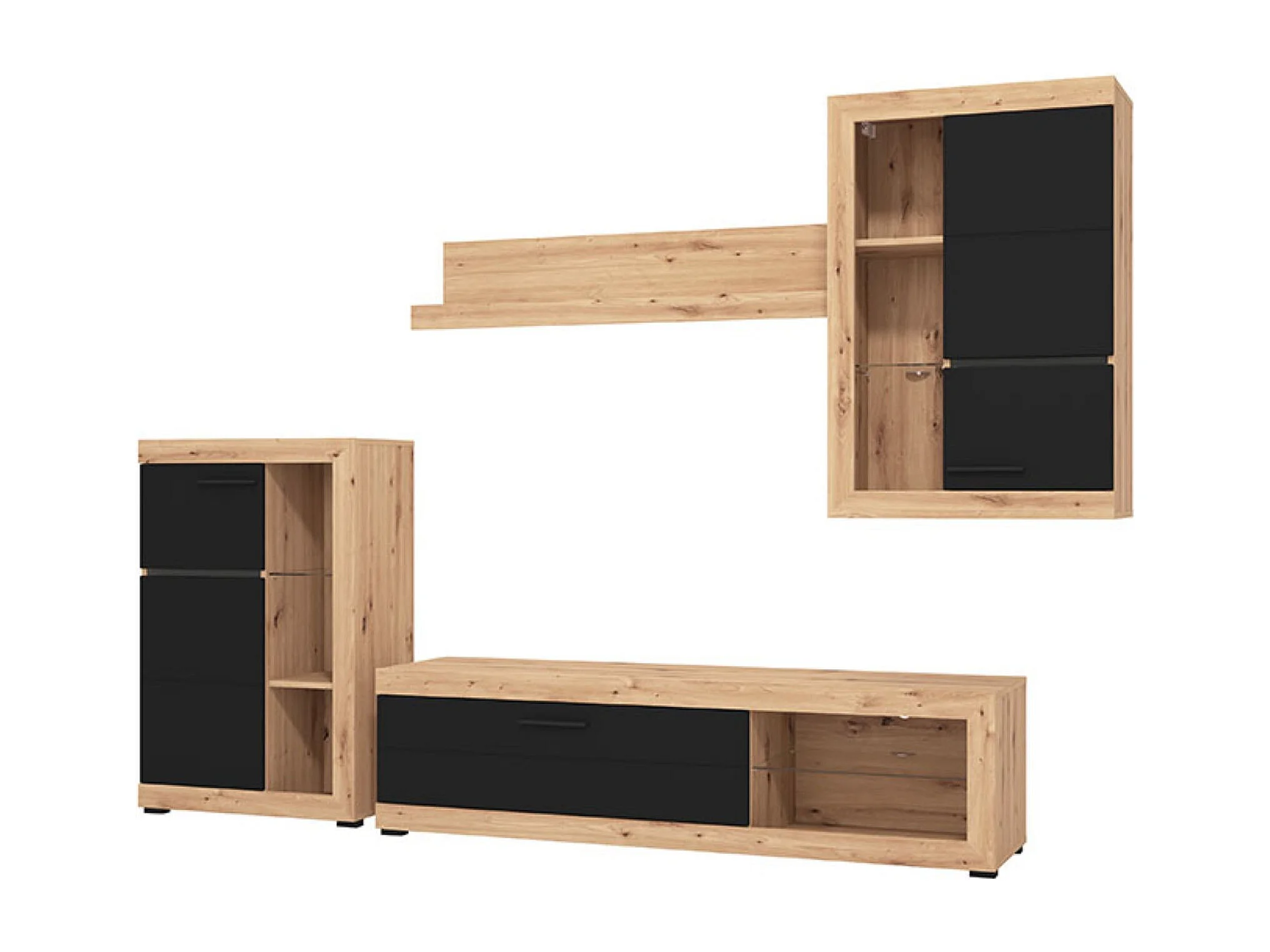 Ensemble TV avec vitrine, meuble TV, meuble haut et étagère couleur chêne artisan / noir - Longueur 266,5 x profondeur 41,5 x hauteur 186 cm