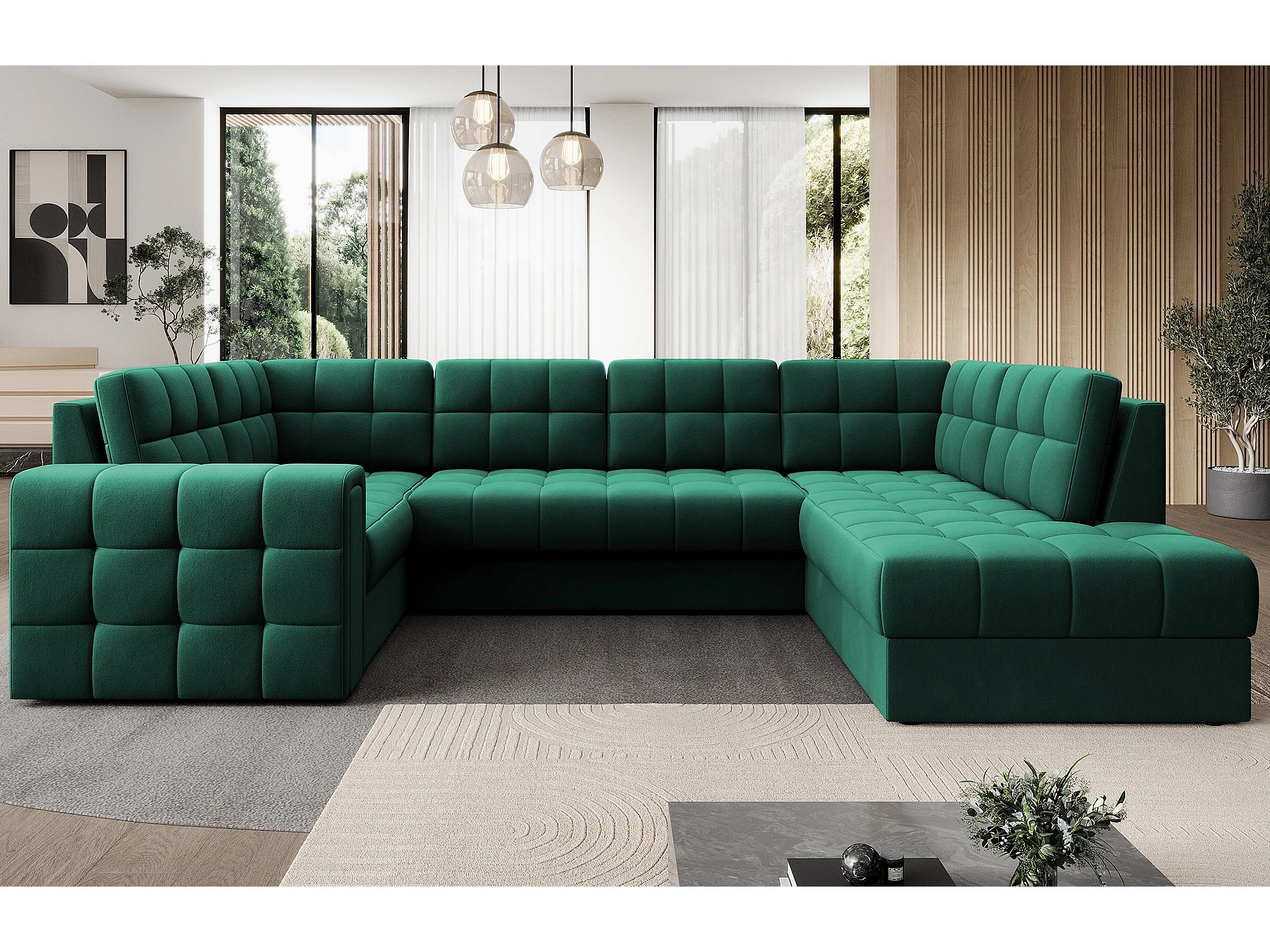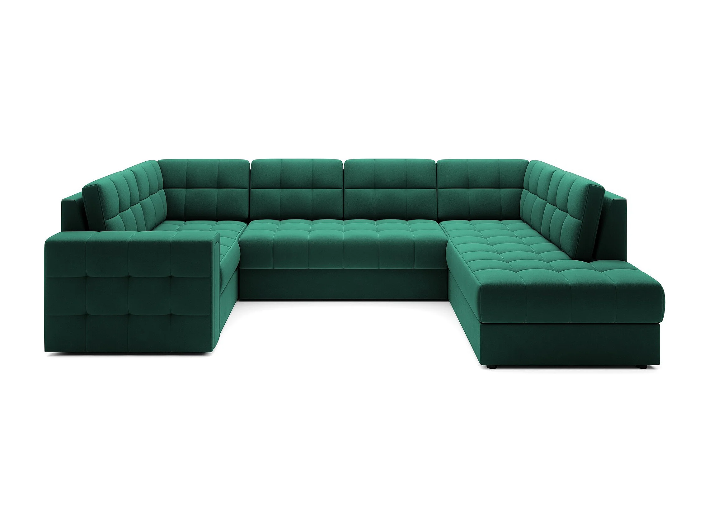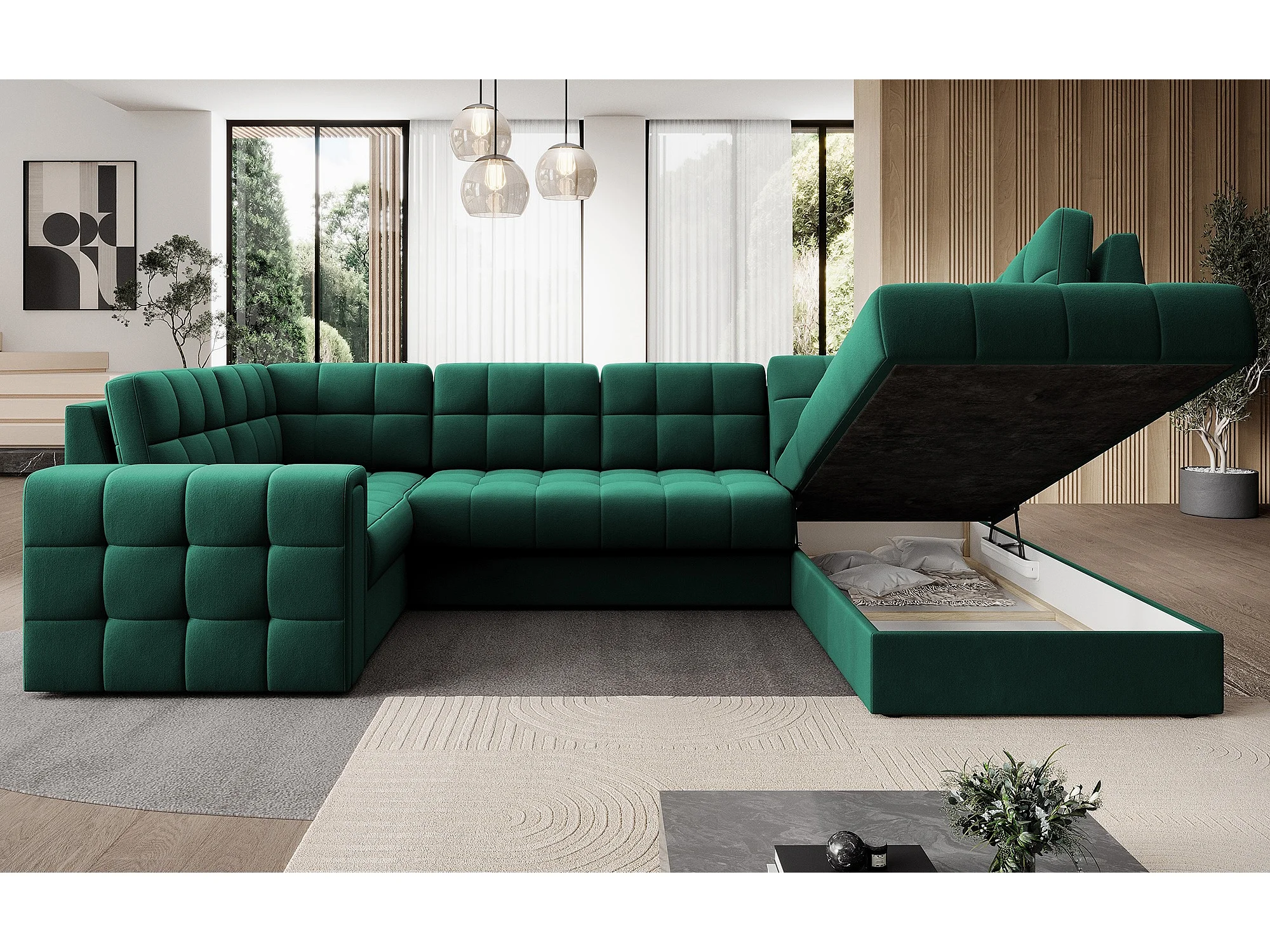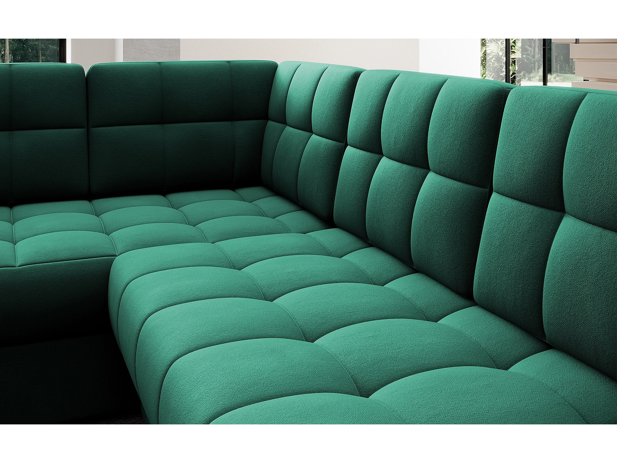 Canapé panoramique BLOOM velours capitonné - Rangement et convertible-Vert-Coffre de rangement à droite
