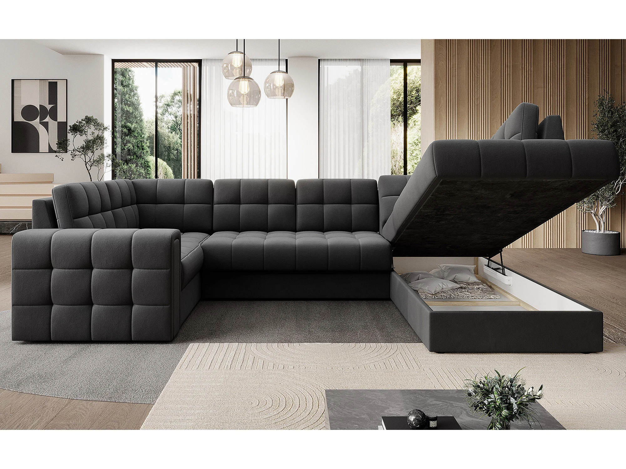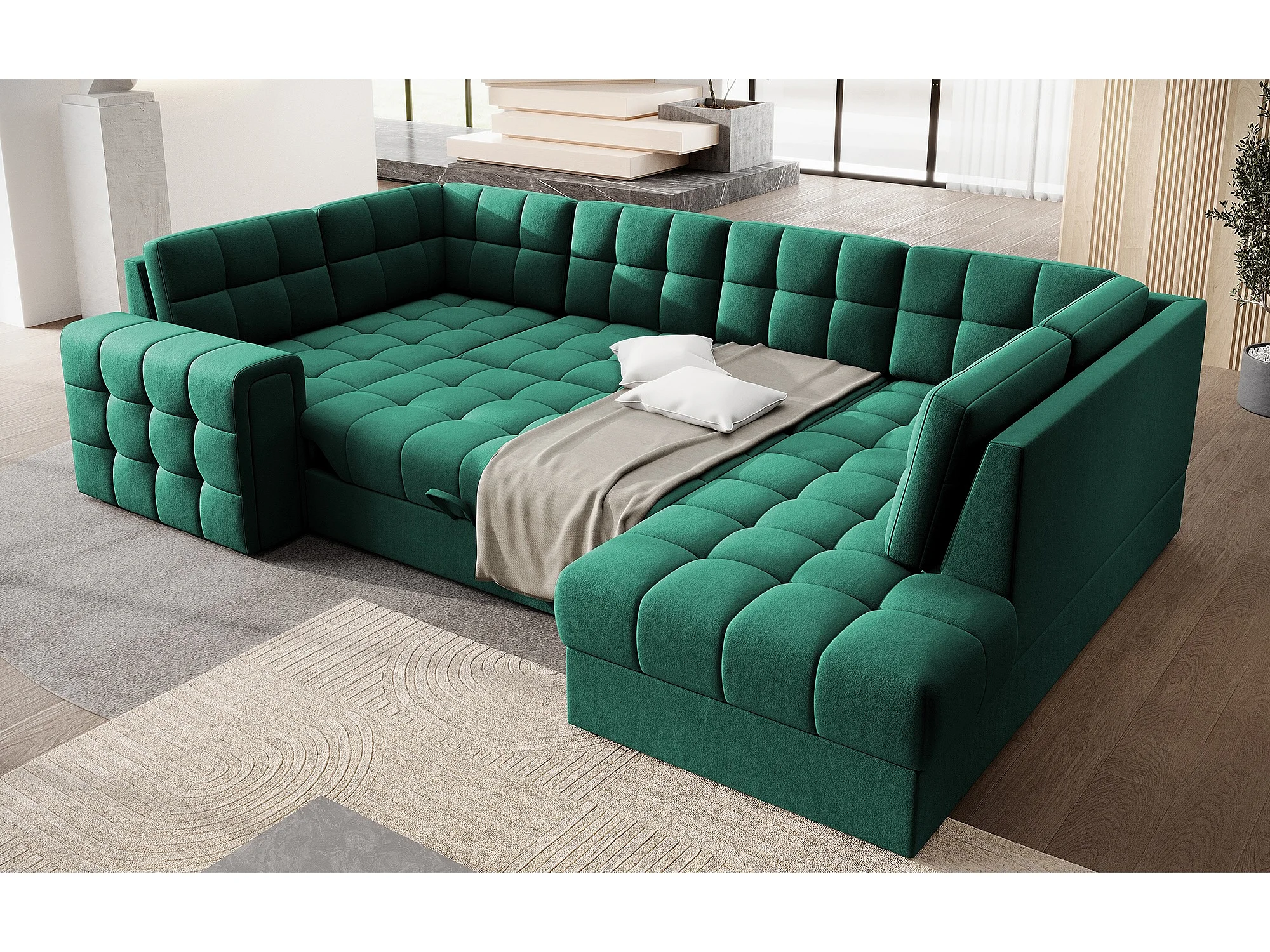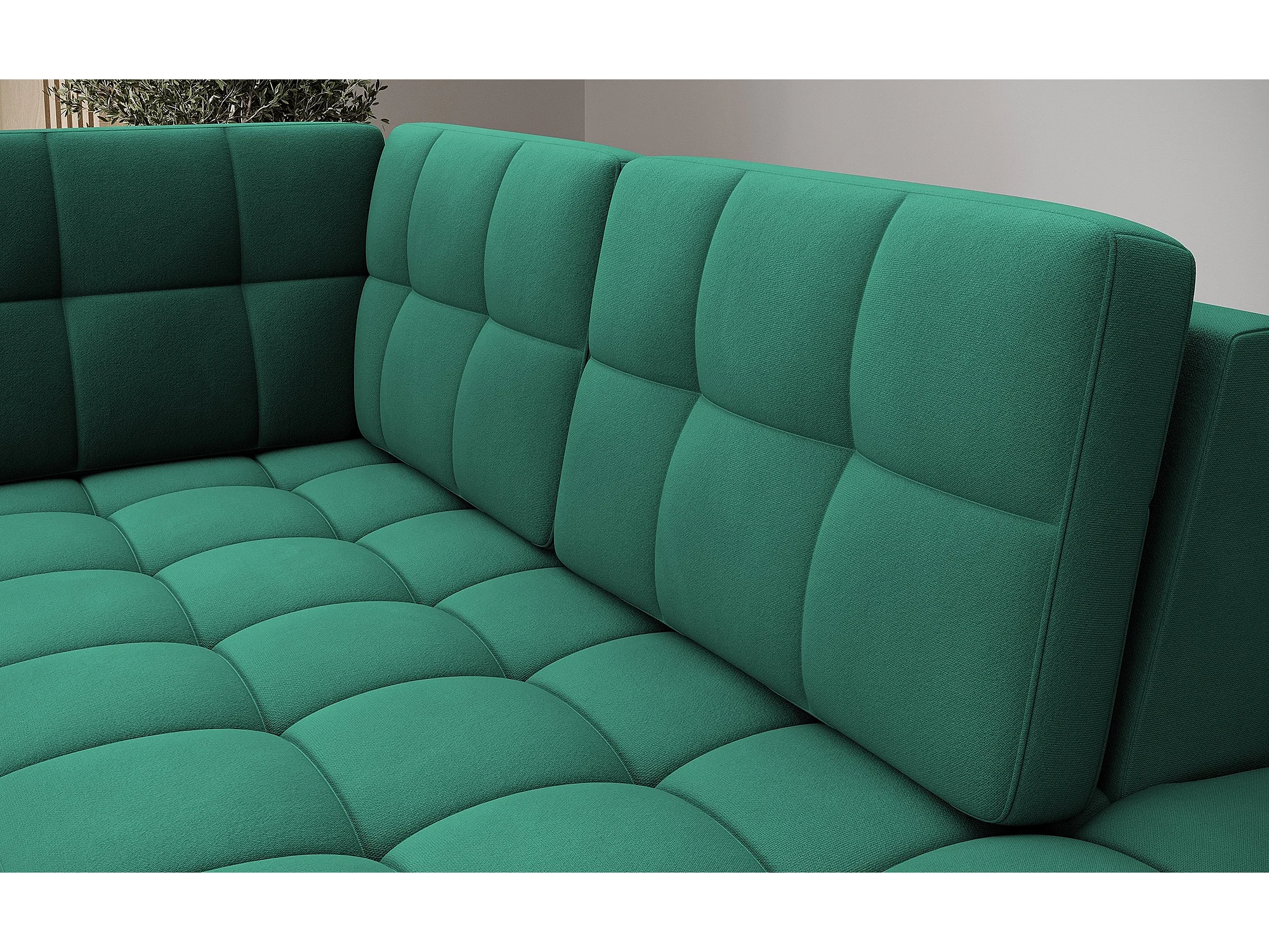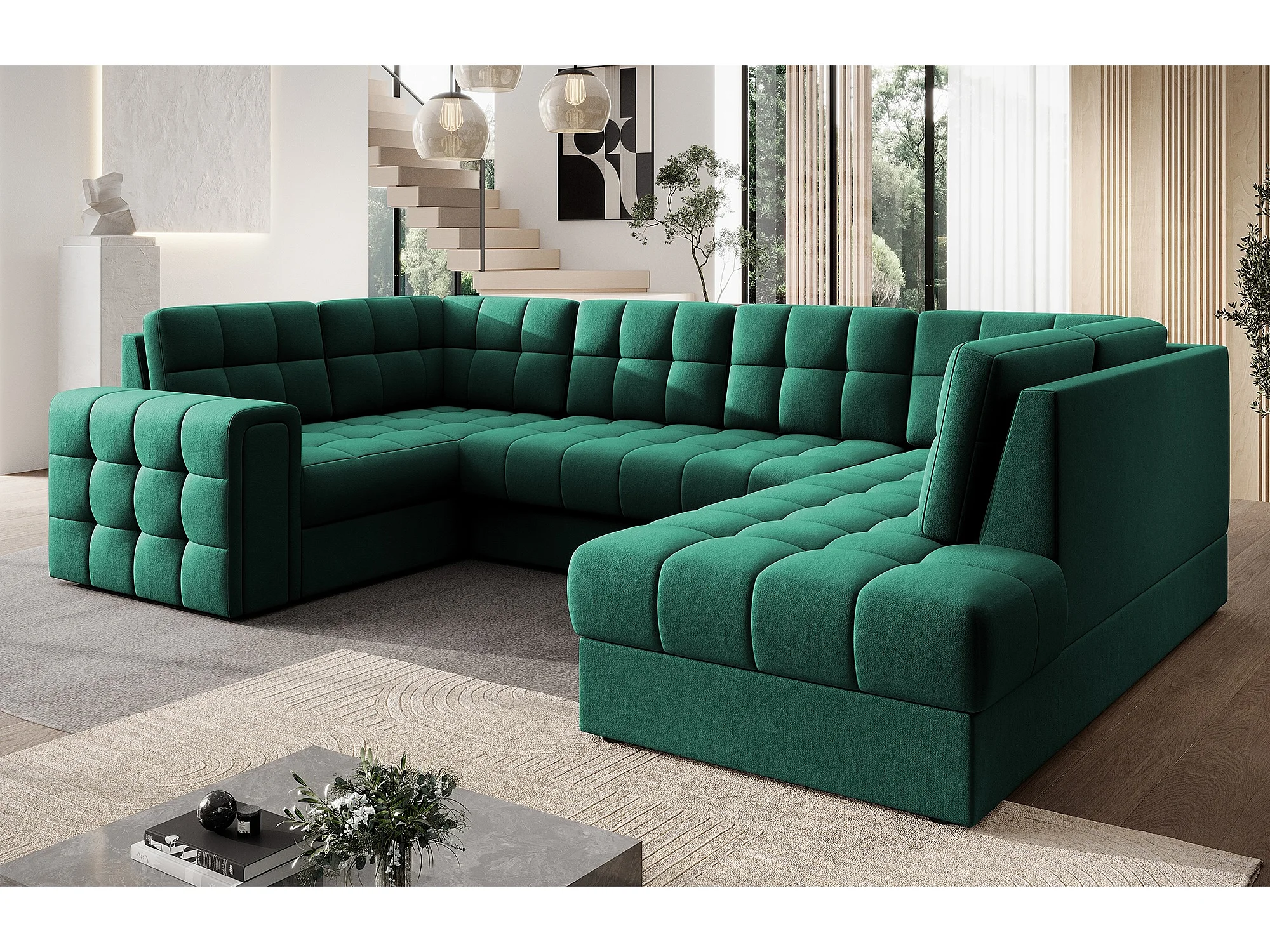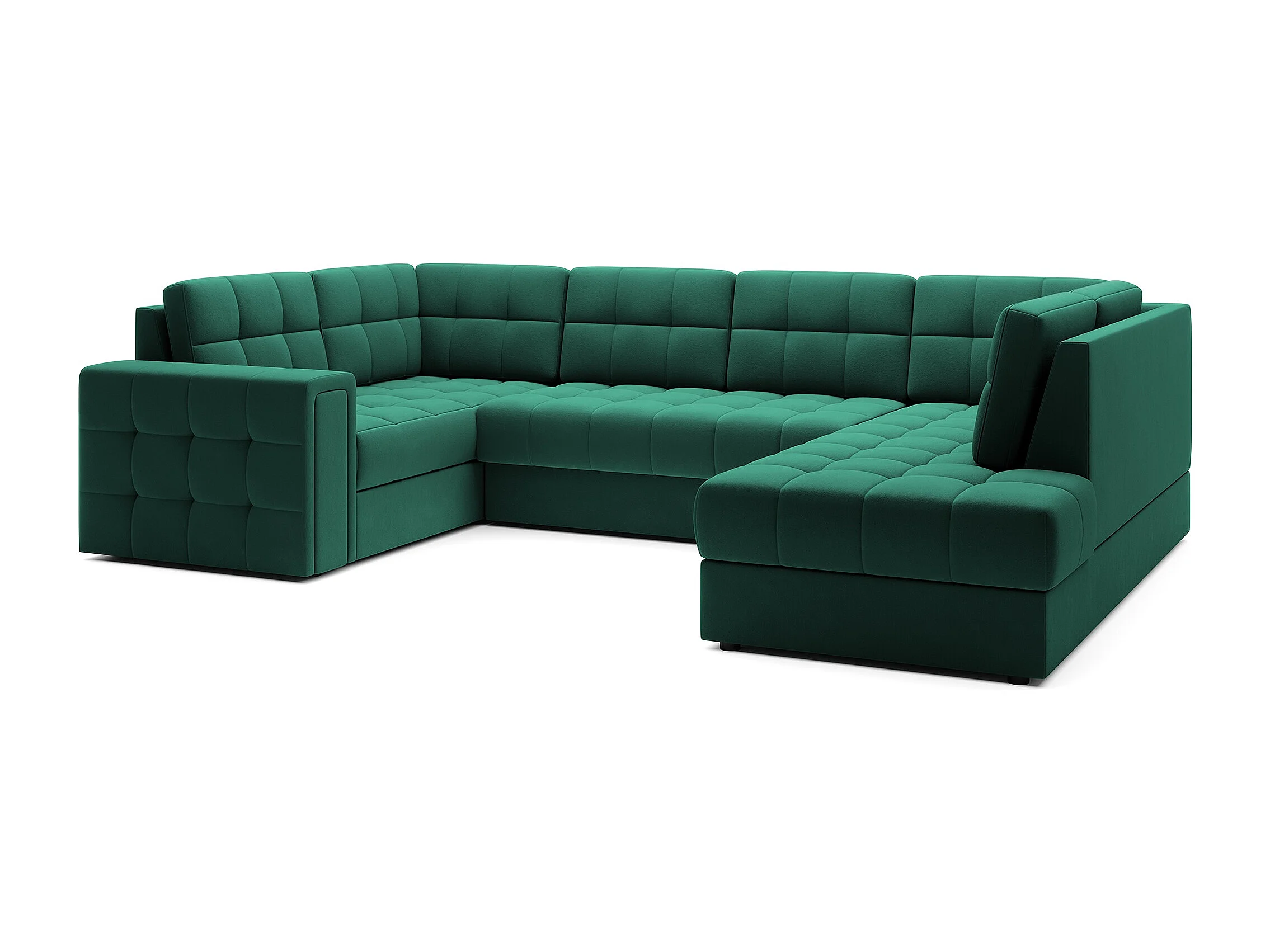 Canapé panoramique BLOOM velours capitonné - Rangement et convertible-Vert-Coffre de rangement à droite
