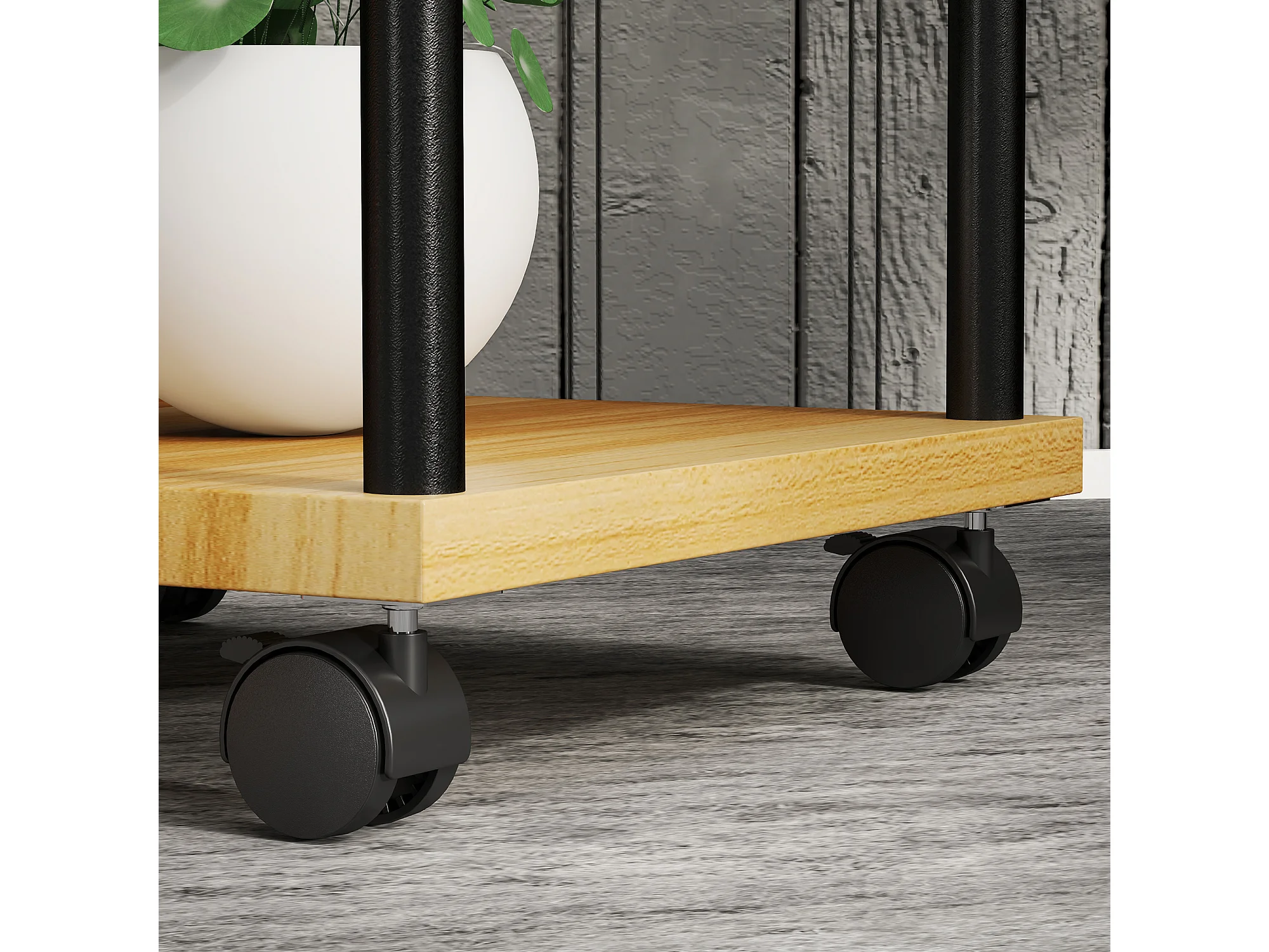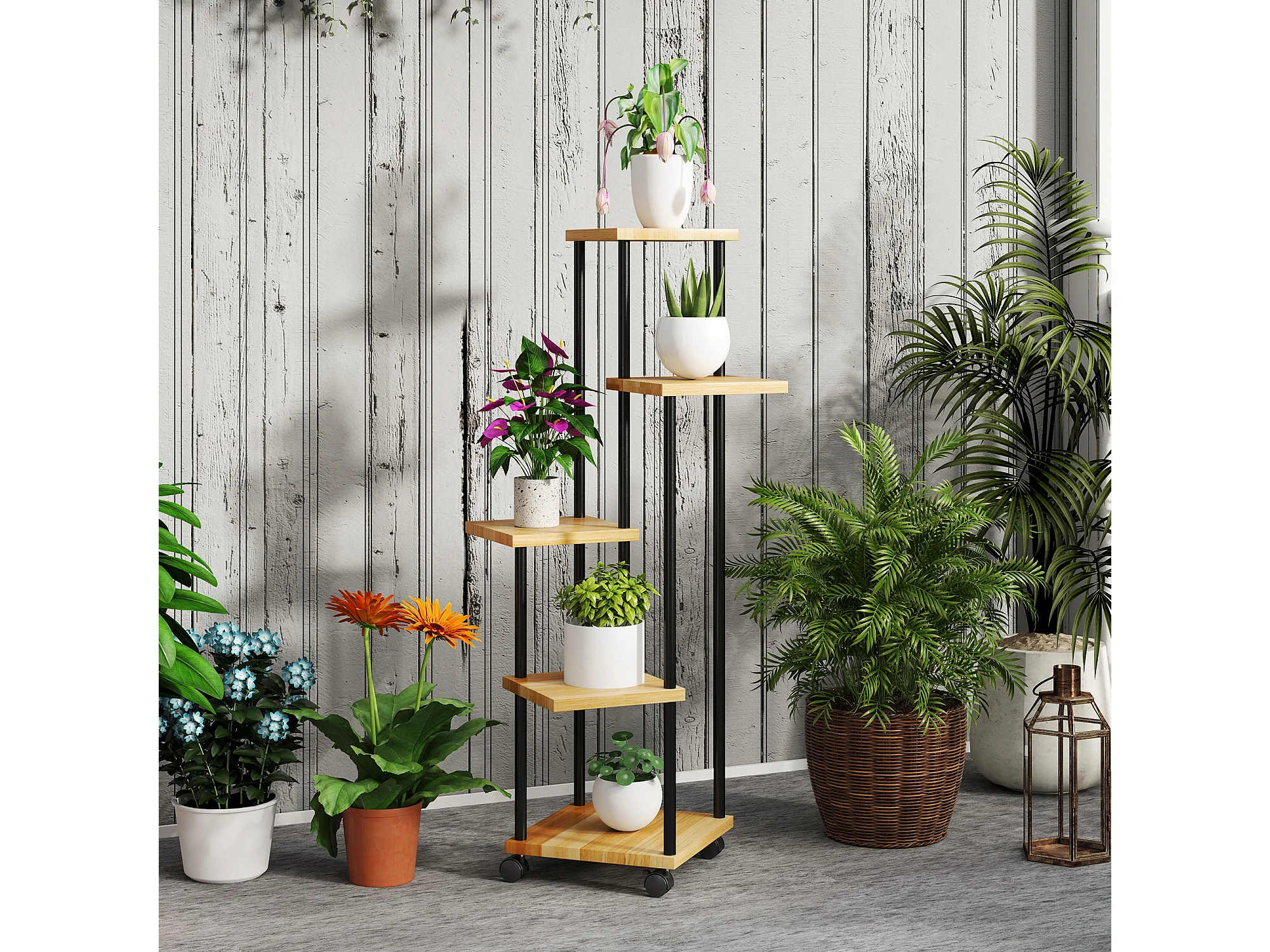 Etagère à fleurs 5 niveaux - 4 roulettes, 2 freins - acier époxy noir bois verni