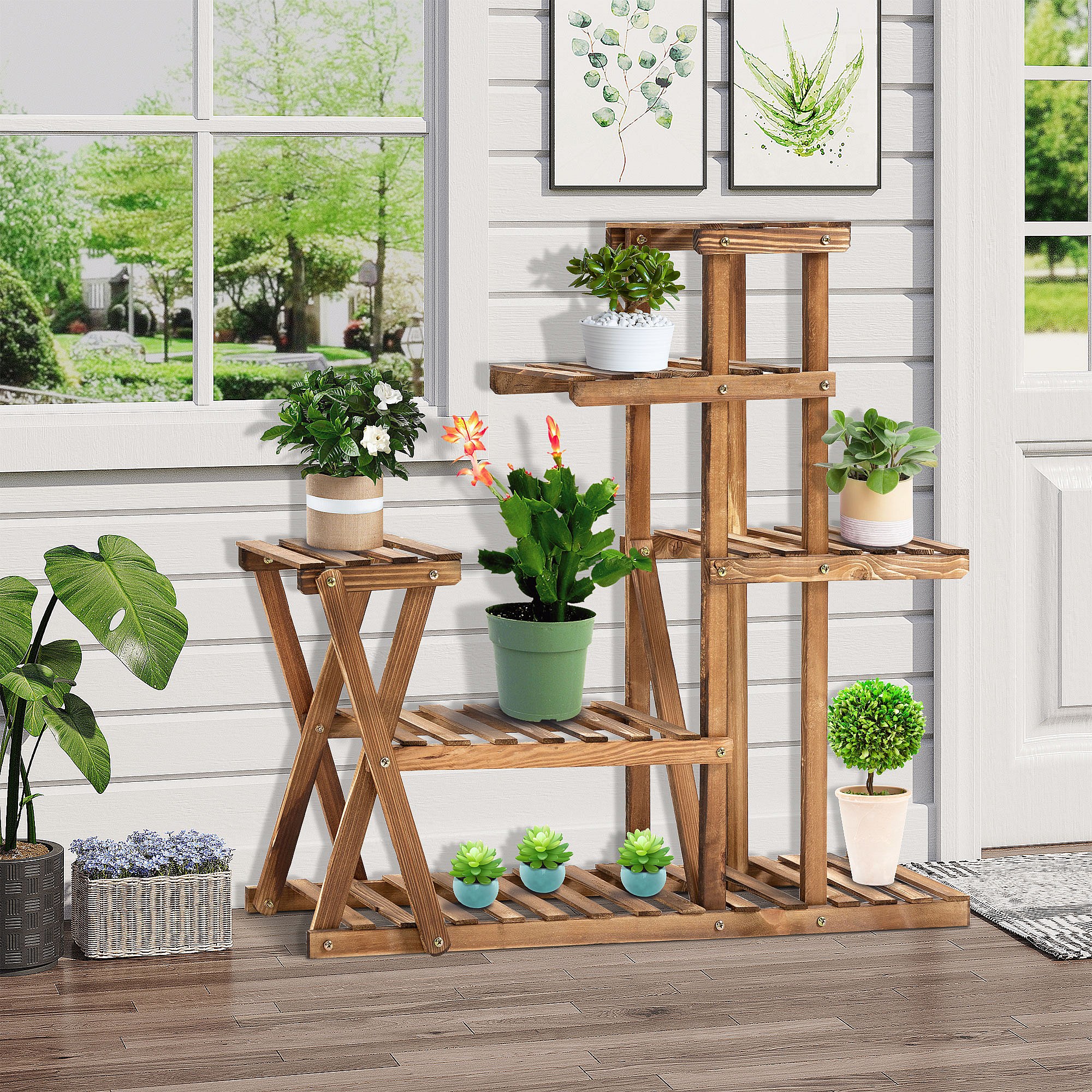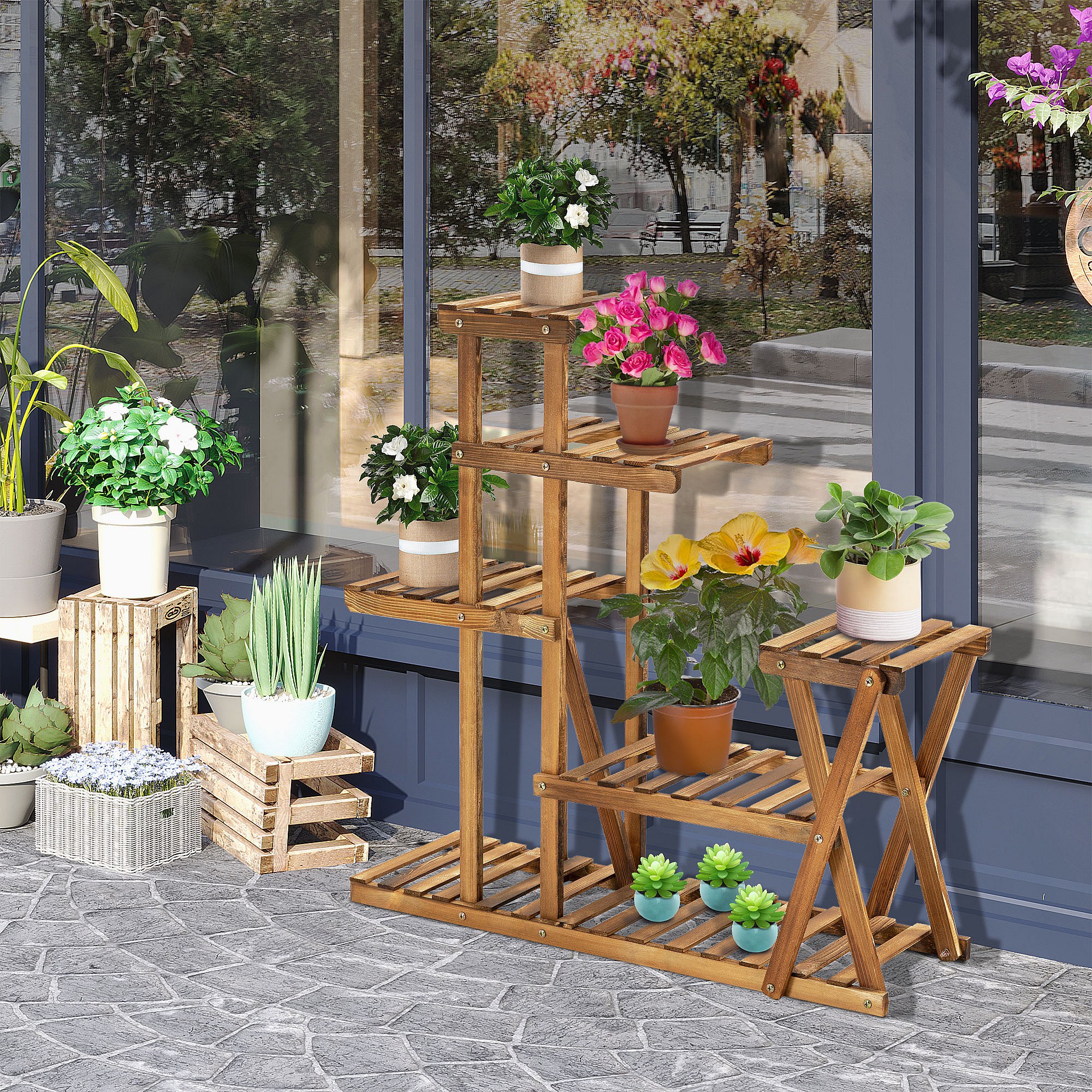 Étagère à fleurs en bois - porte plante bois 6 tablettes - dim. 98L x 28l x 96,5H cm - bois de sapin traité carbonisation
