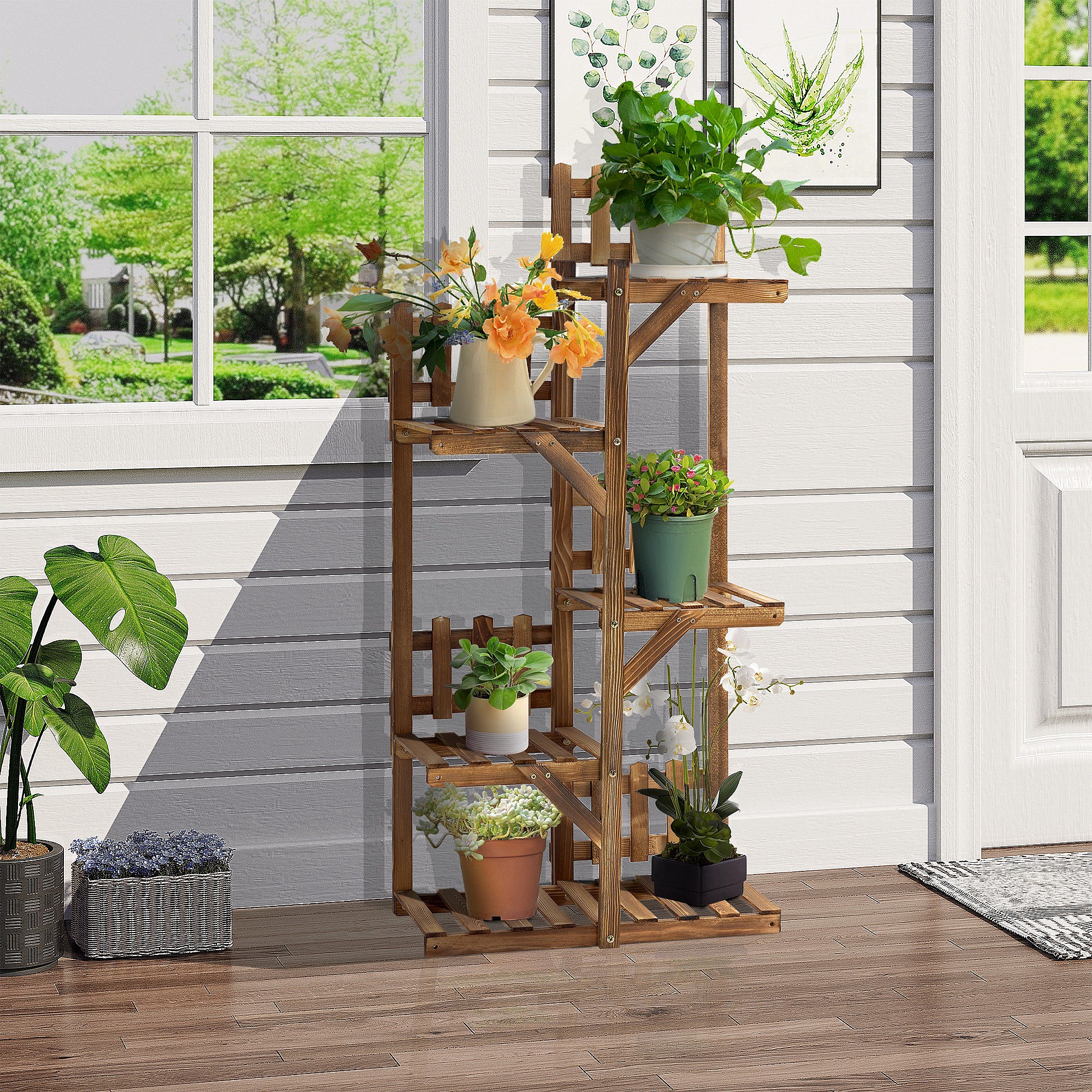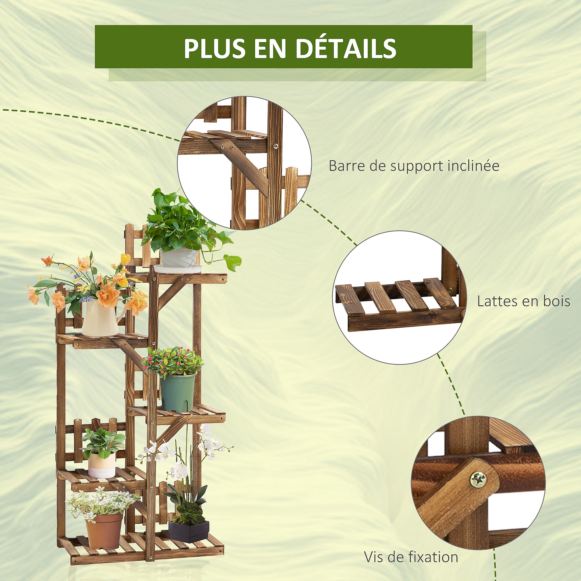 Étagère à fleurs en bois - porte plante bois 6 tablettes - dim. 98L x 28l x 96,5H cm - bois de sapin traité carbonisation