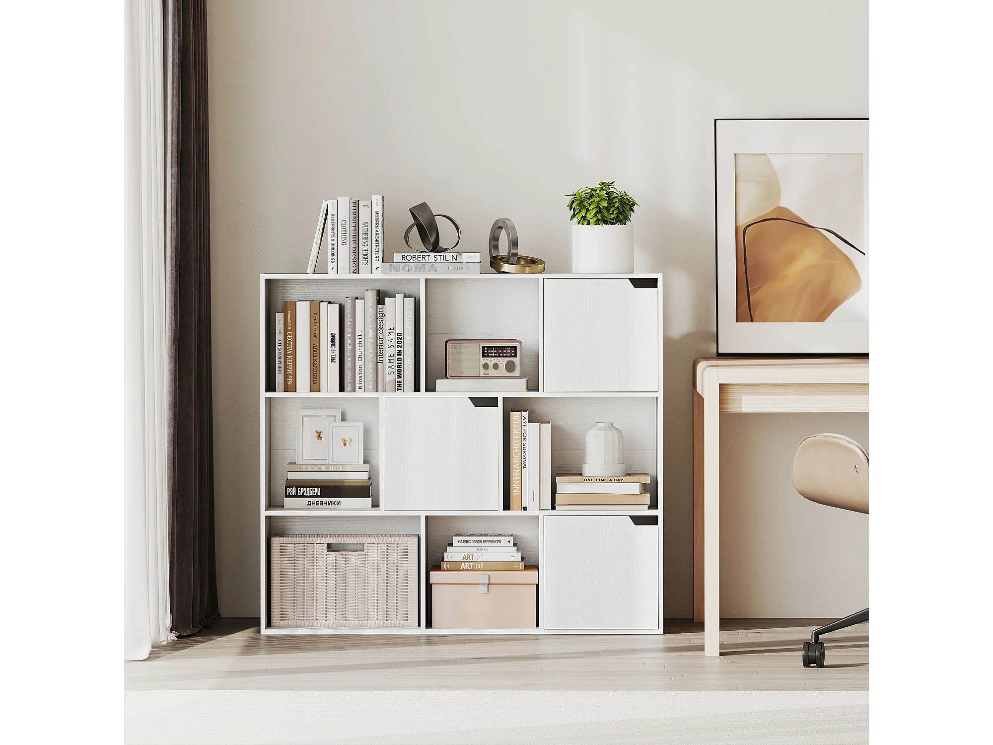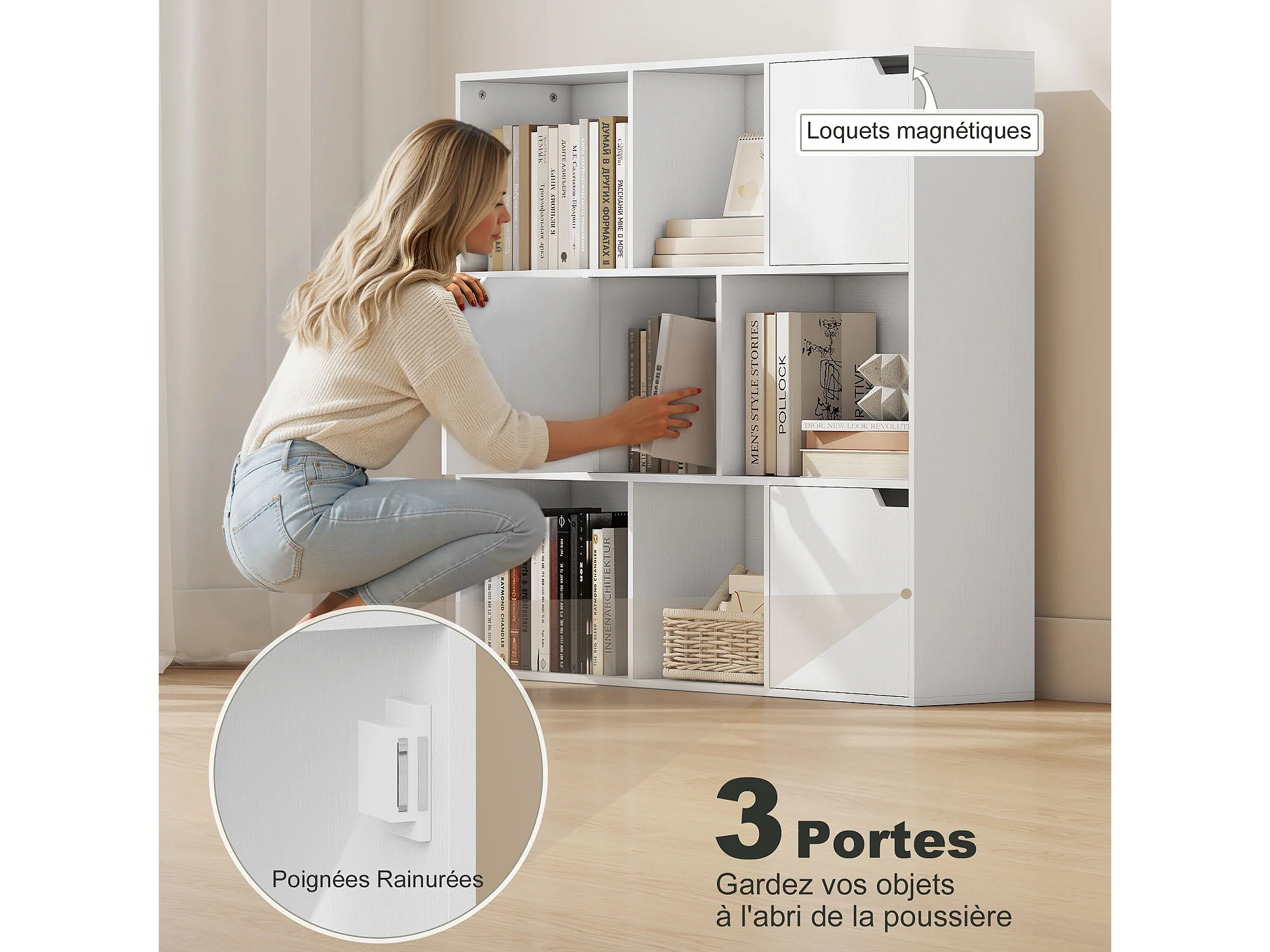 Etagère bibliothèque cubique - rangement cube 3 portes 6 niches - 106 x 24 x 95 cm - blanc