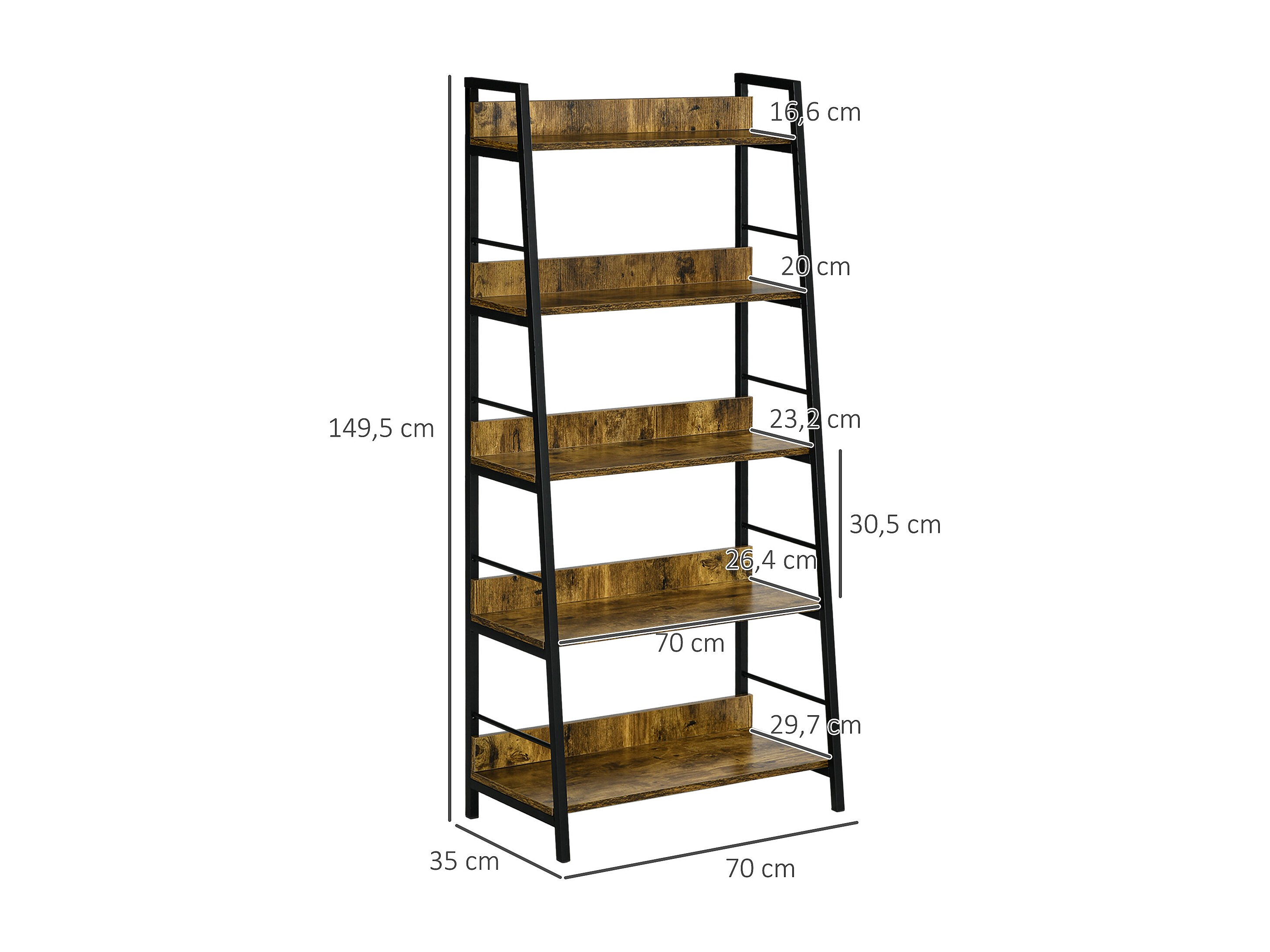 Étagère bibliothèque style industriel incliné 5 niveaux 70L x 35l x 150H cm coloris bois vieilli noir