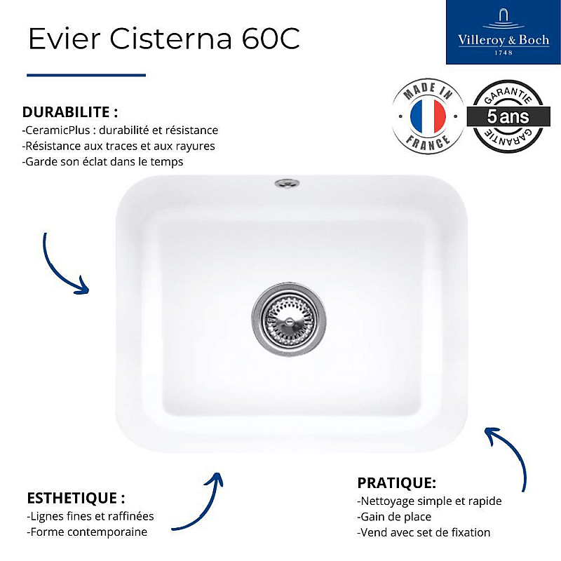 Evier 1 bac VILLEROY ET BOCH Cisterna 60C Chromite CeramicPlus avec vidage manuel