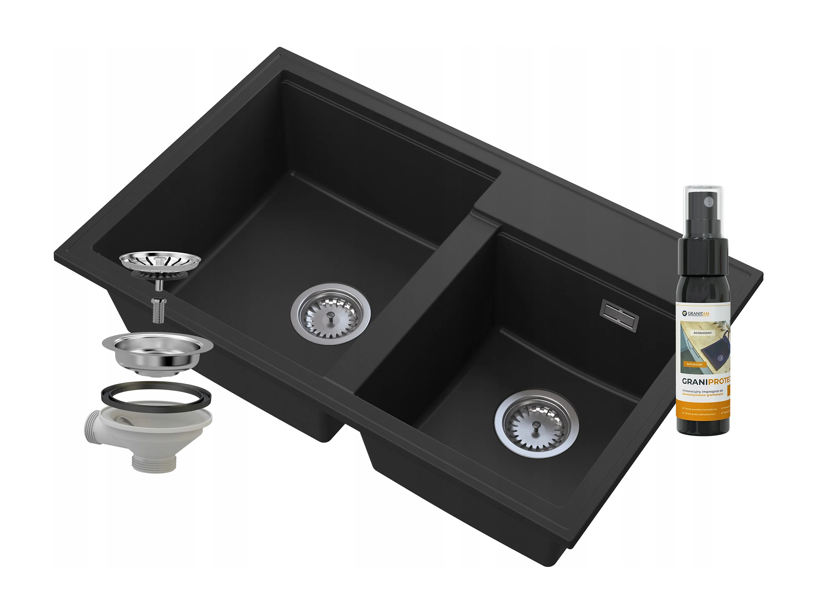 ÉVIER DOUBLE BAC GRANIT NOIR SIPHON CHROME HECTOR