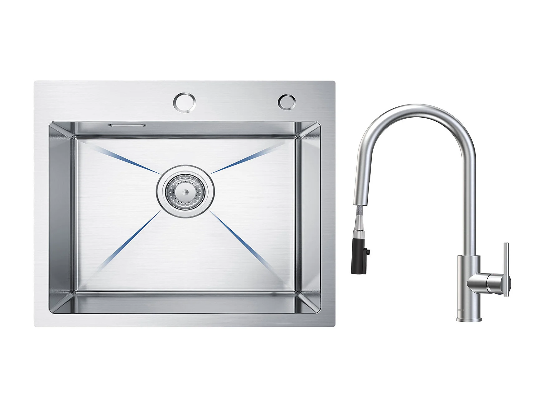 Cecipa max 2 en 1 Évier 1 Bac Inox 50 x 45 x 18,5 cm + Robinet de Cuisine Inox Extractible Chrome