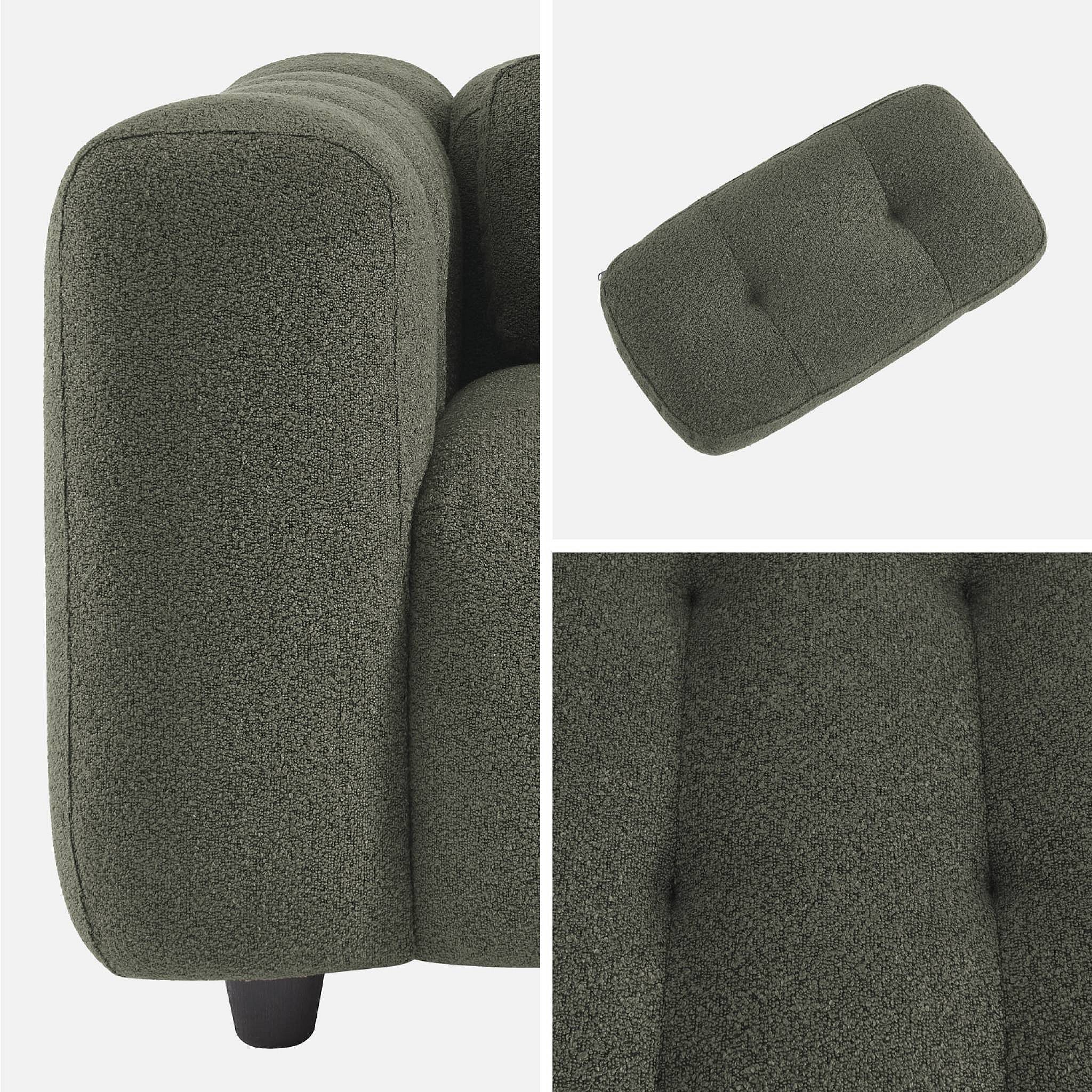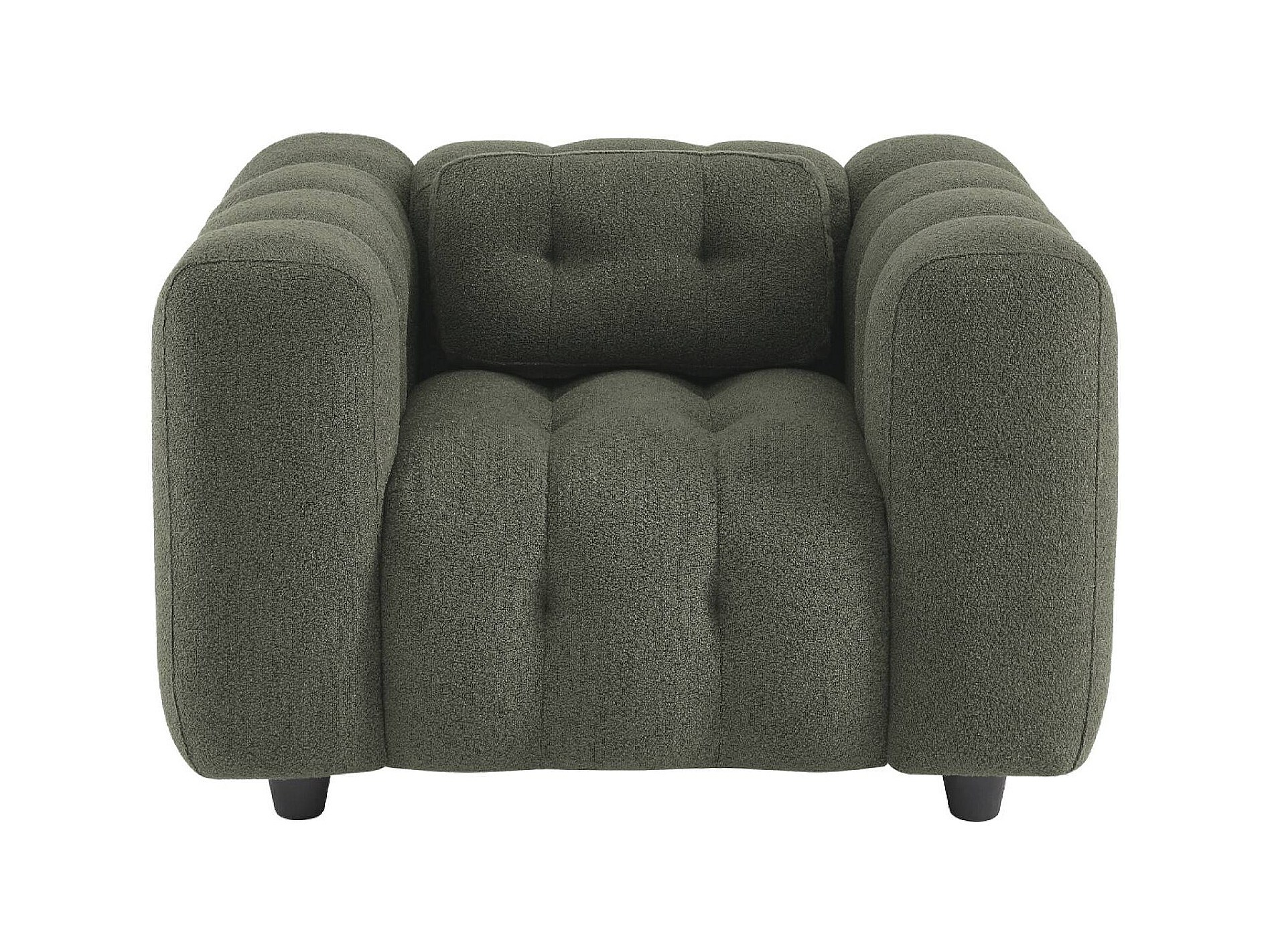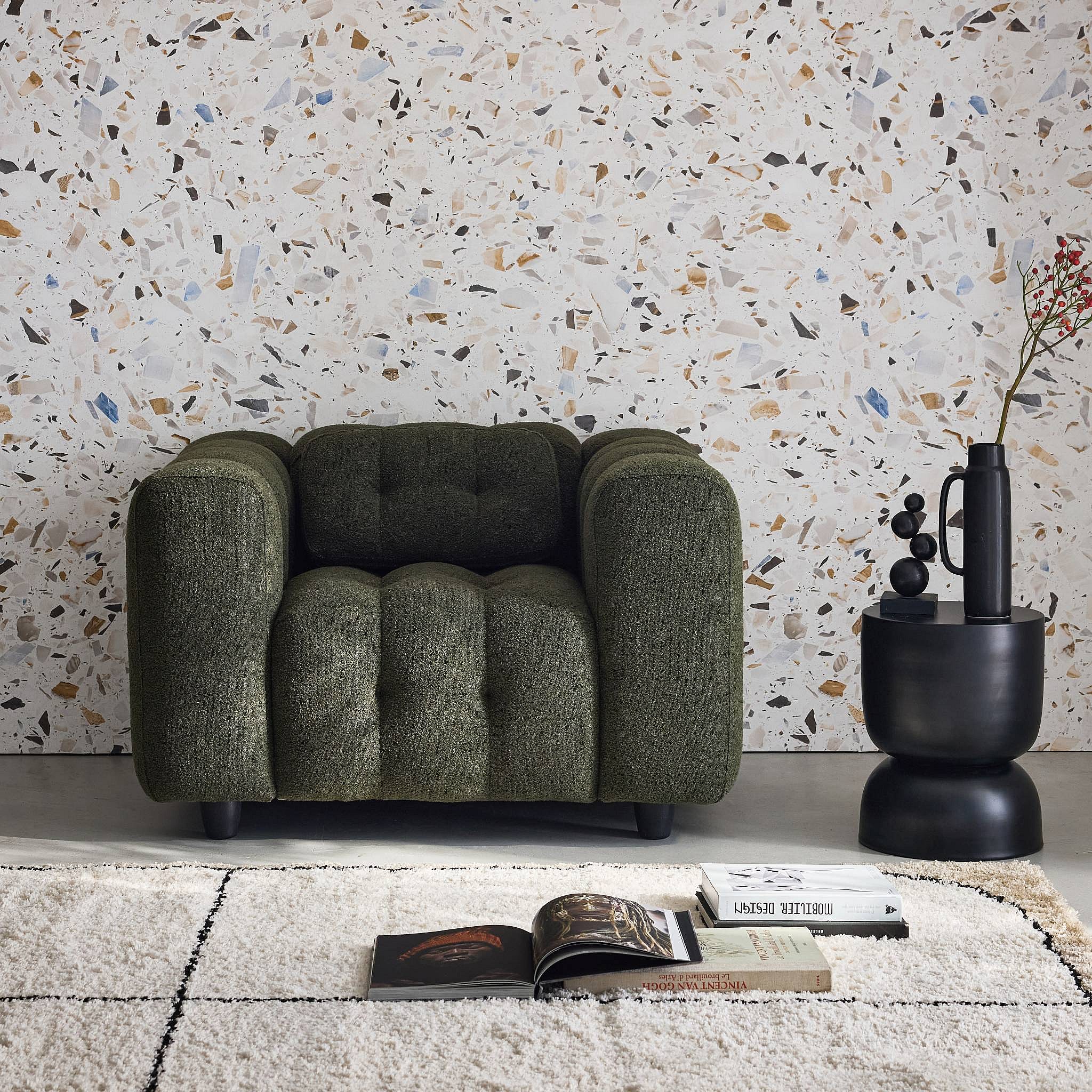 Fauteuil 1 place en bouclette texturée capitonné kaki foncé structure bois d'eucalyptus et contreplaqué