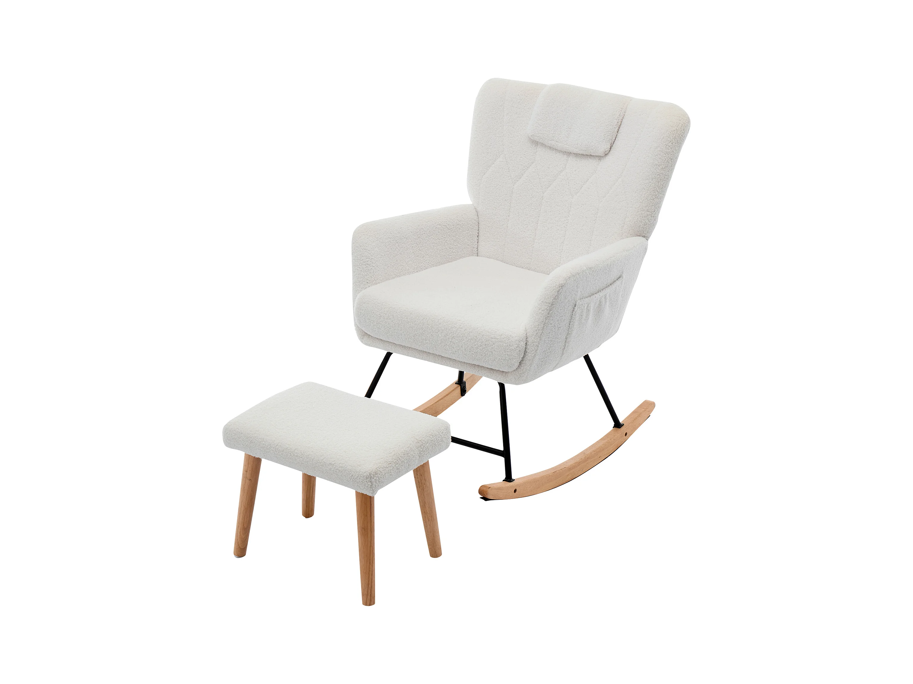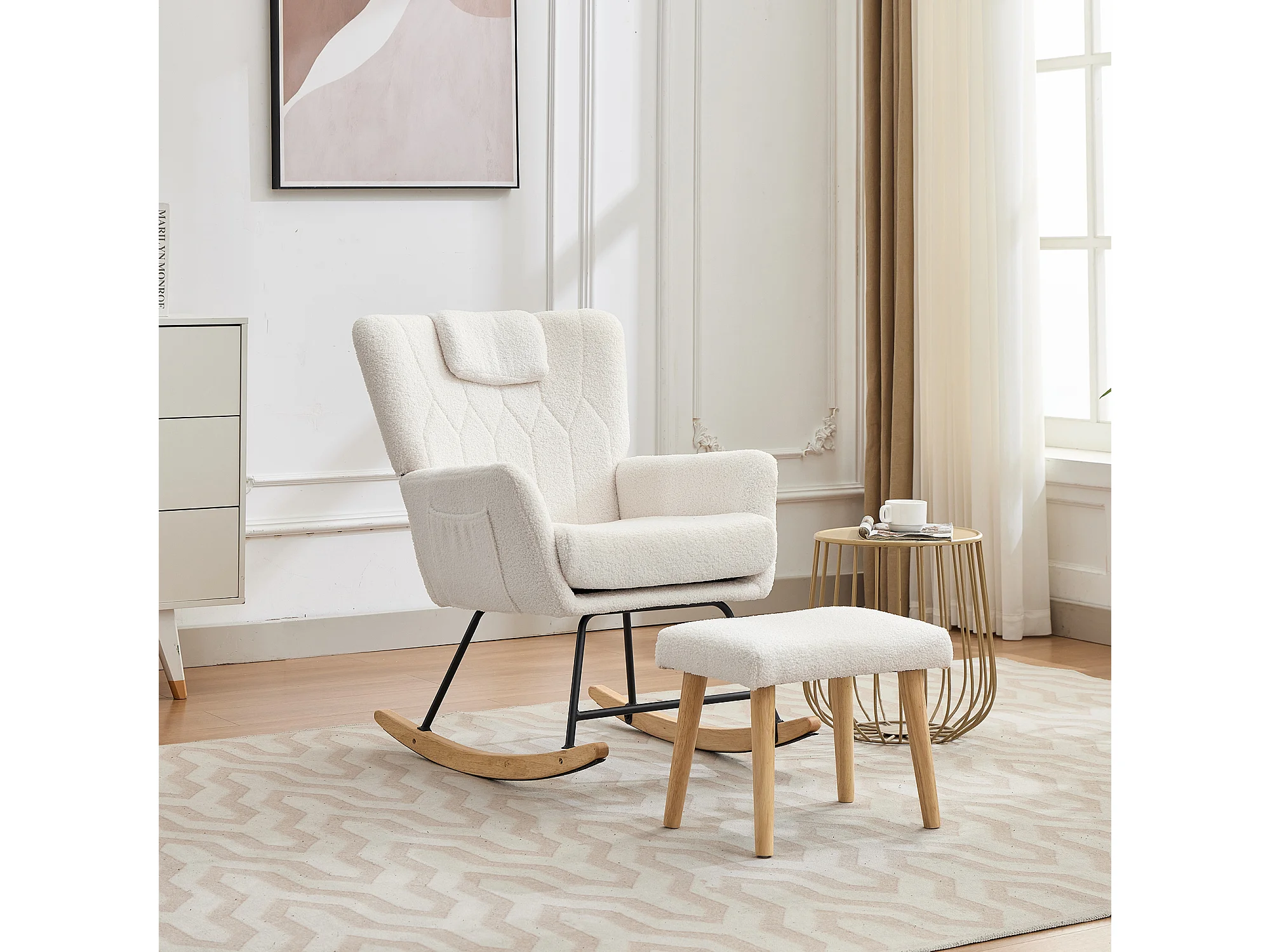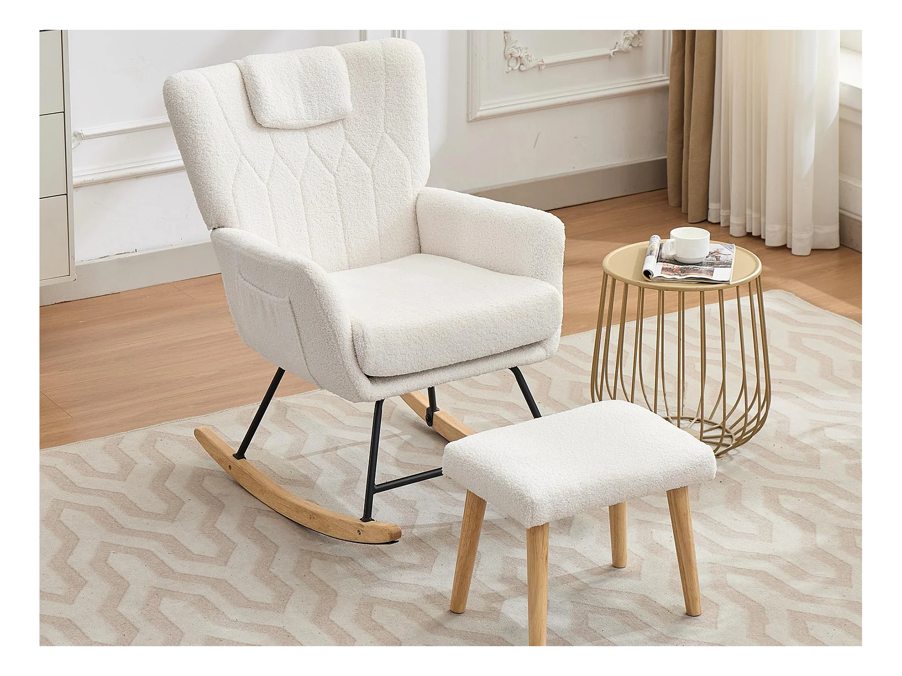 Fauteuil à Bascule Scandinave, Dossier Capitonné, Pieds en Bois, Blanc