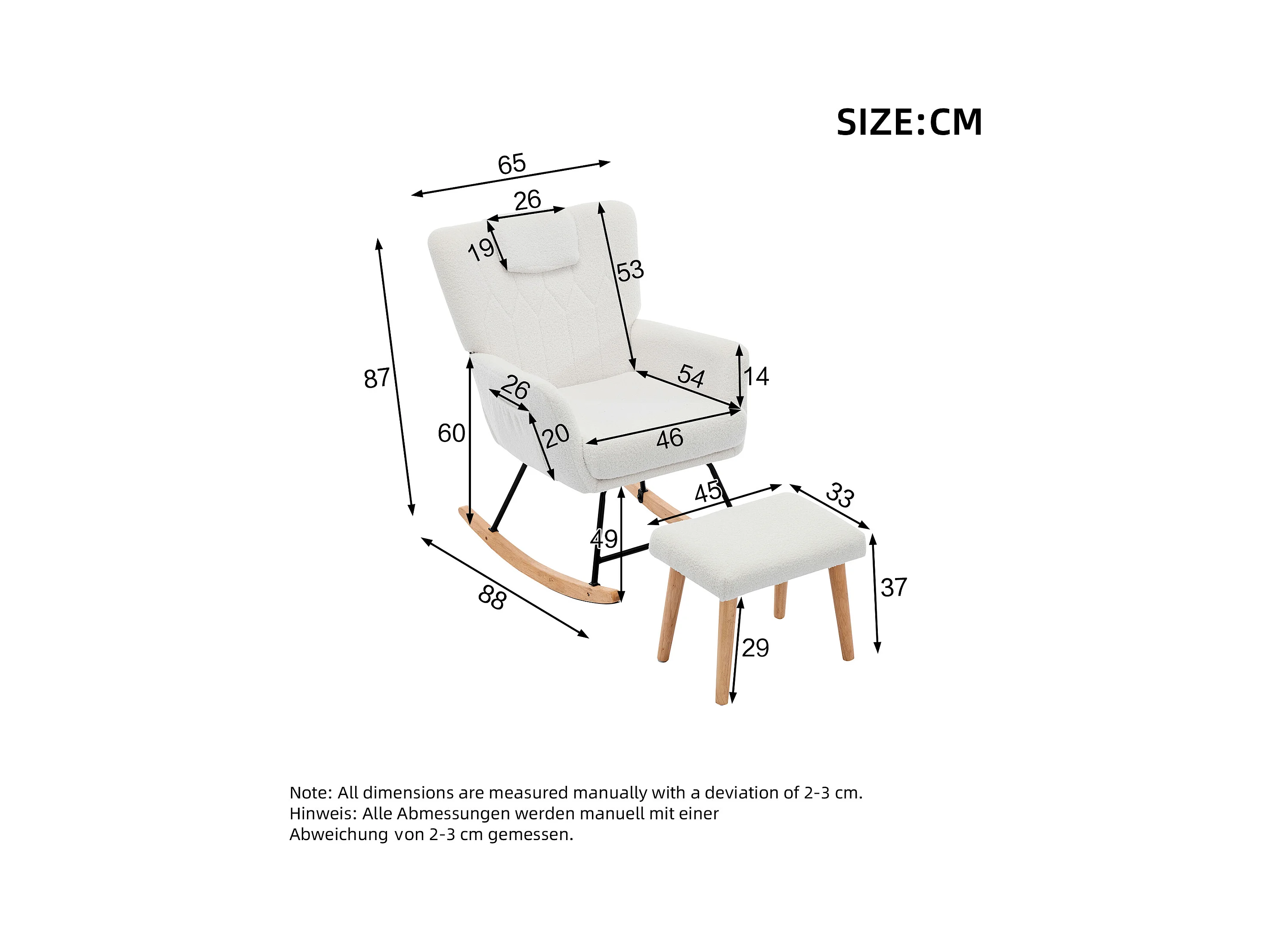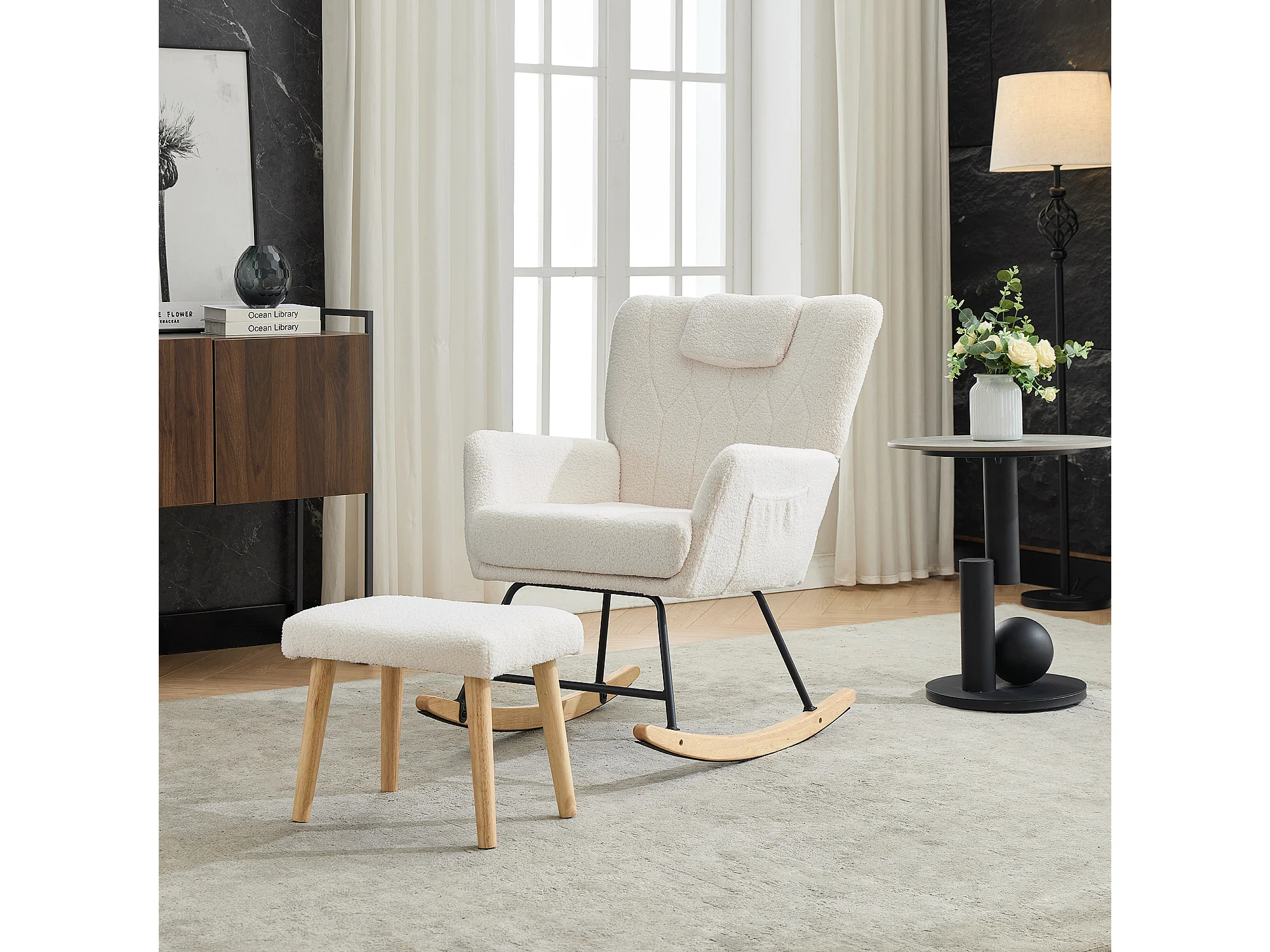 Fauteuil à bascule en peluche Teddy - Rocking chair avec repose-pied, pieds en bois massif - confortable 65x96.5x85cm - Blanc