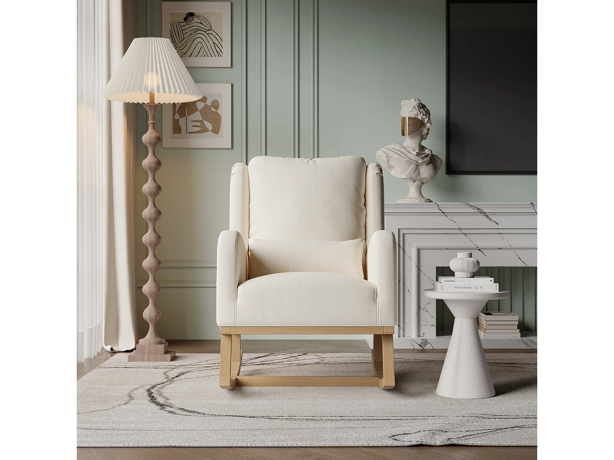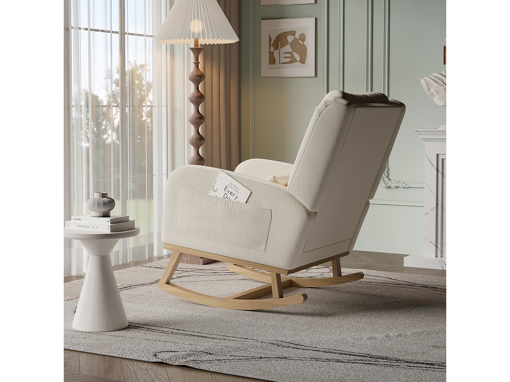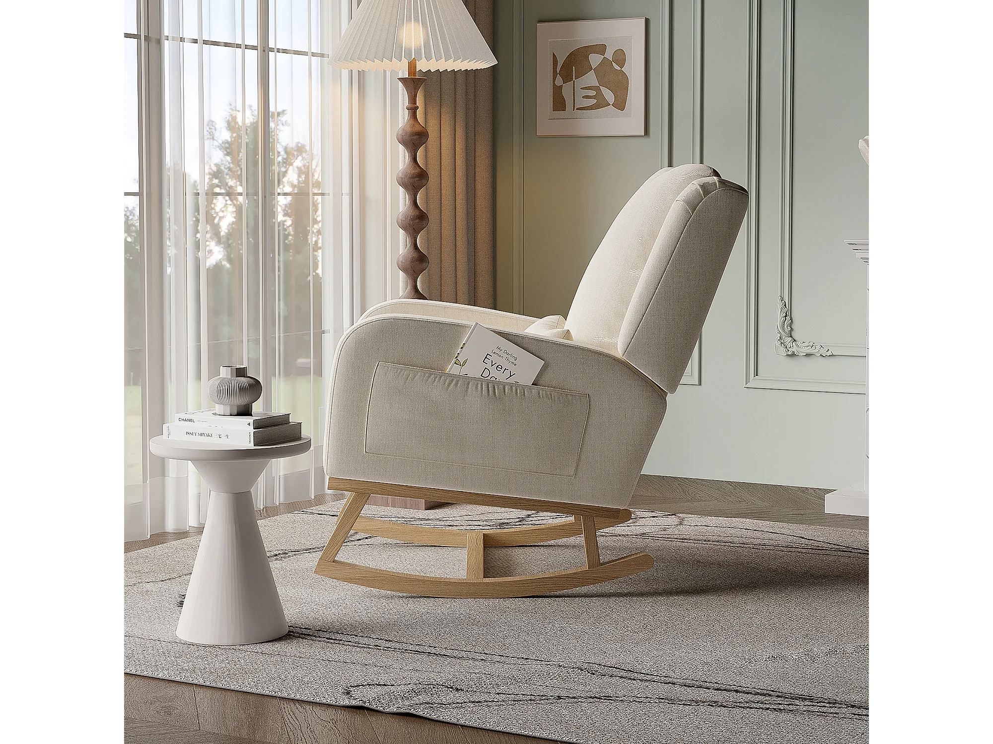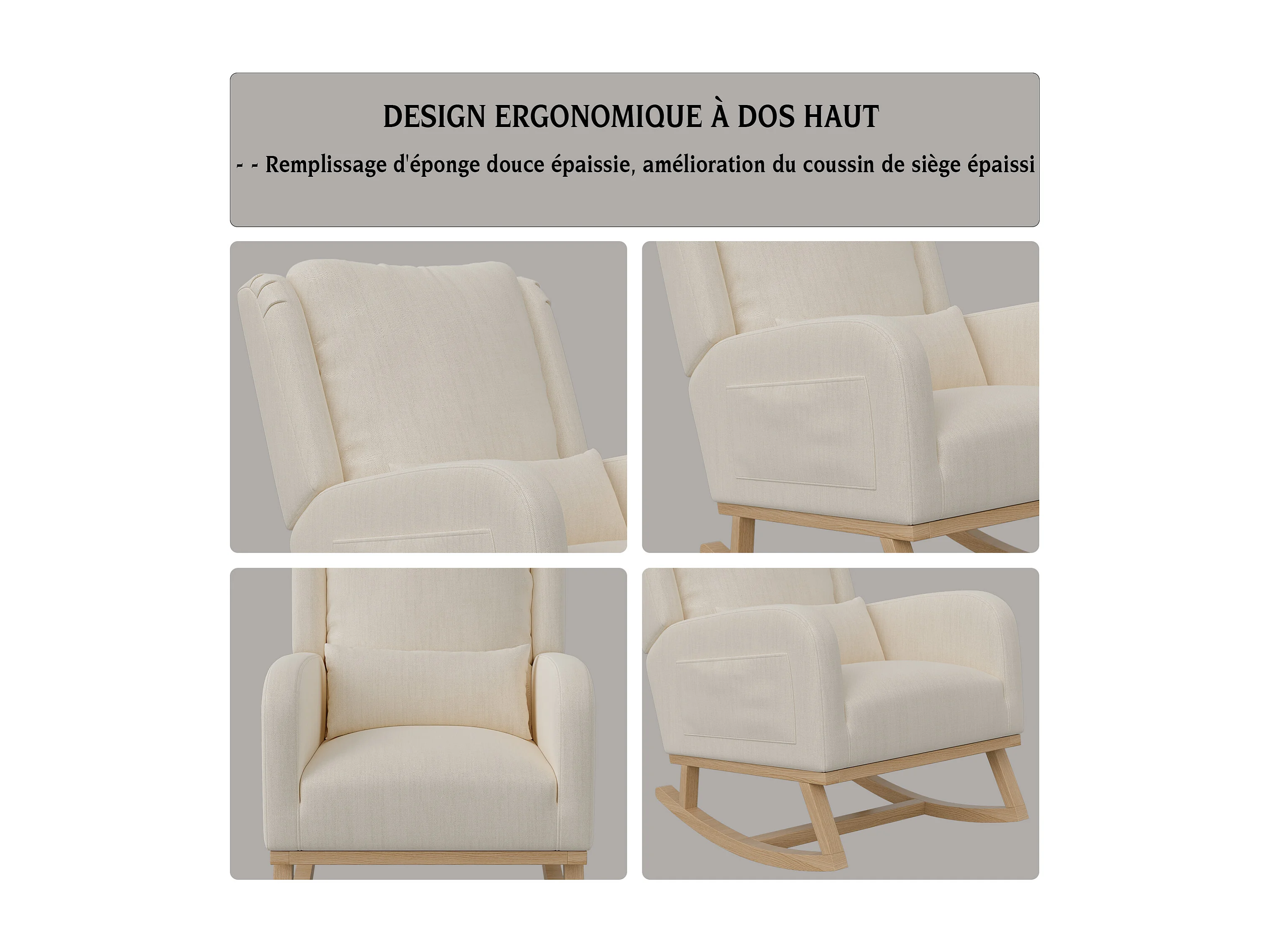 Fauteuil à bascule avec base en bois et dossier, Fauteuil de relaxation pour salon , Lin , Beige