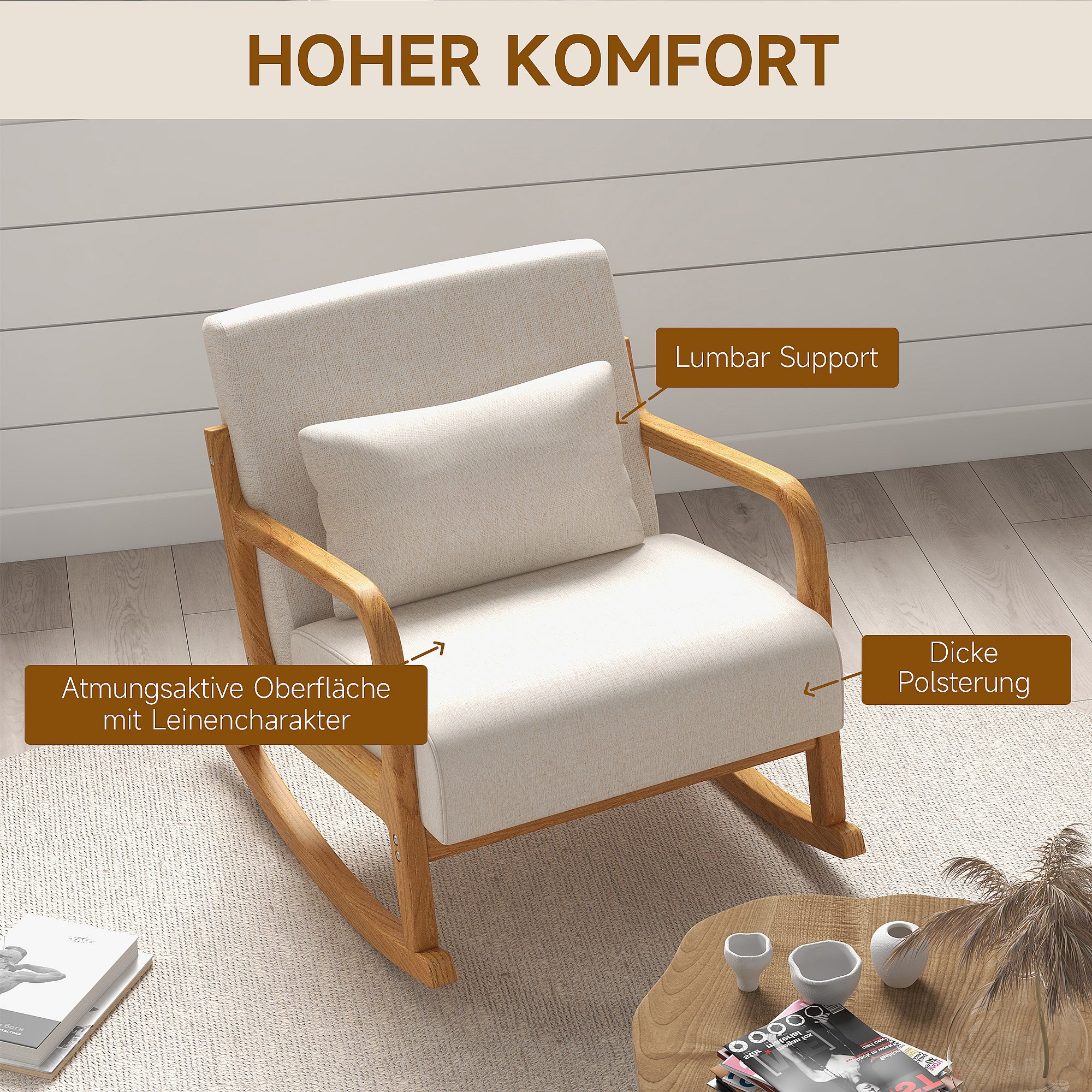 Fauteuil à bascule blanc crème avec coussin lombaire et accoudoirs, coussin d'assise épais
