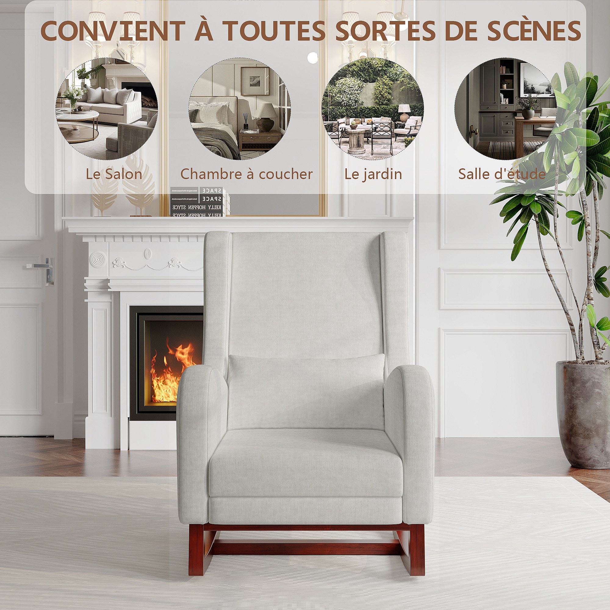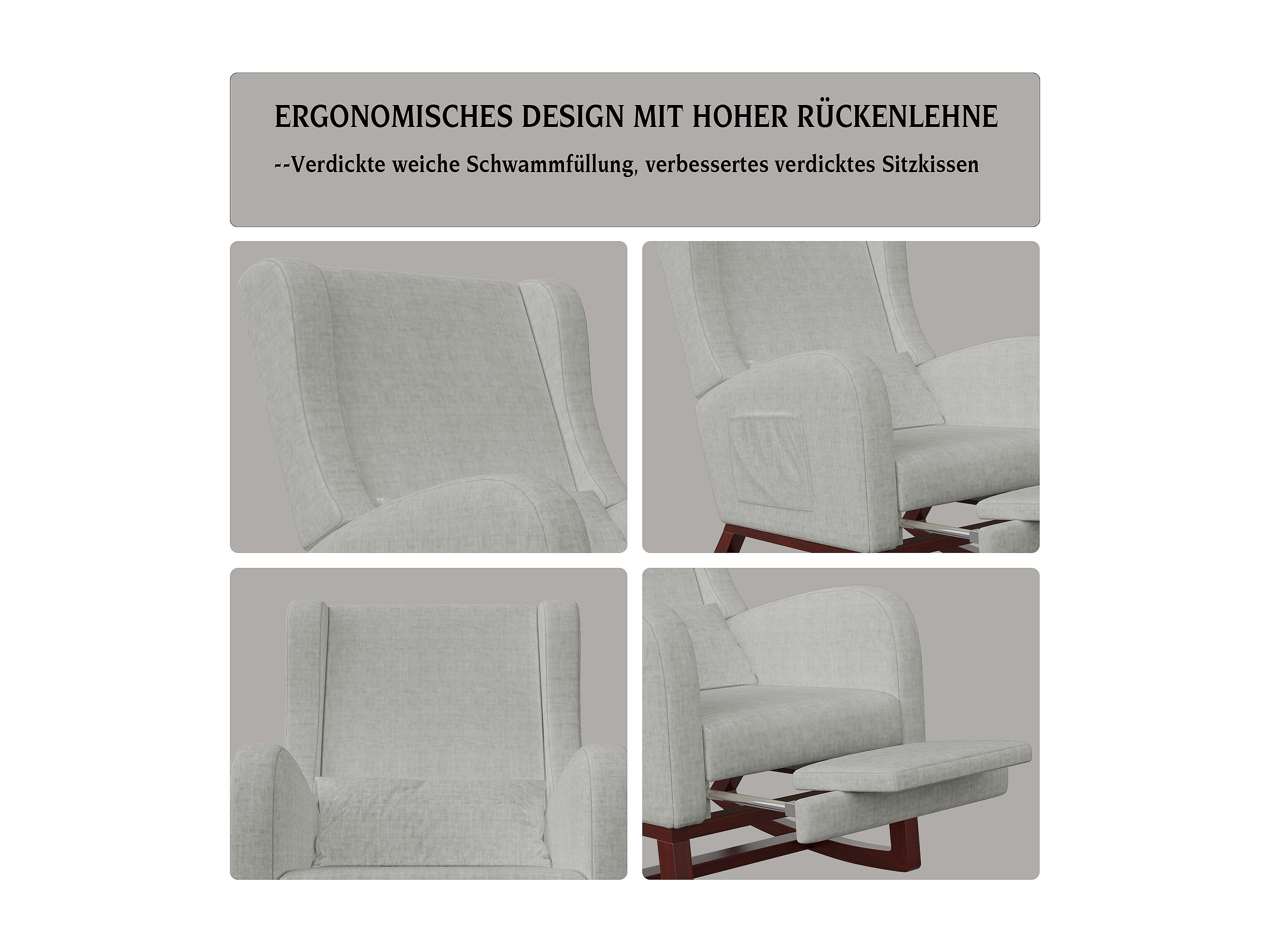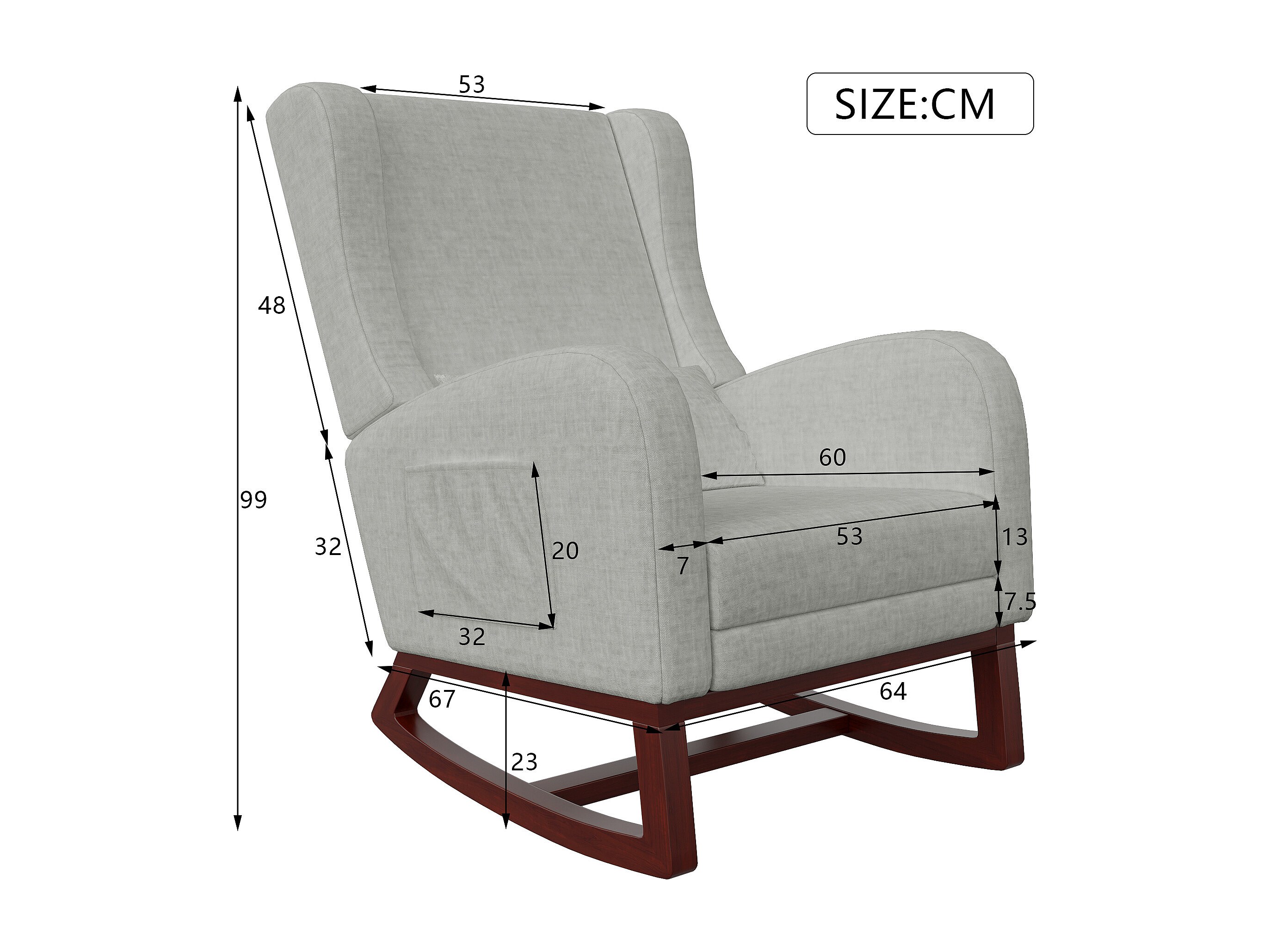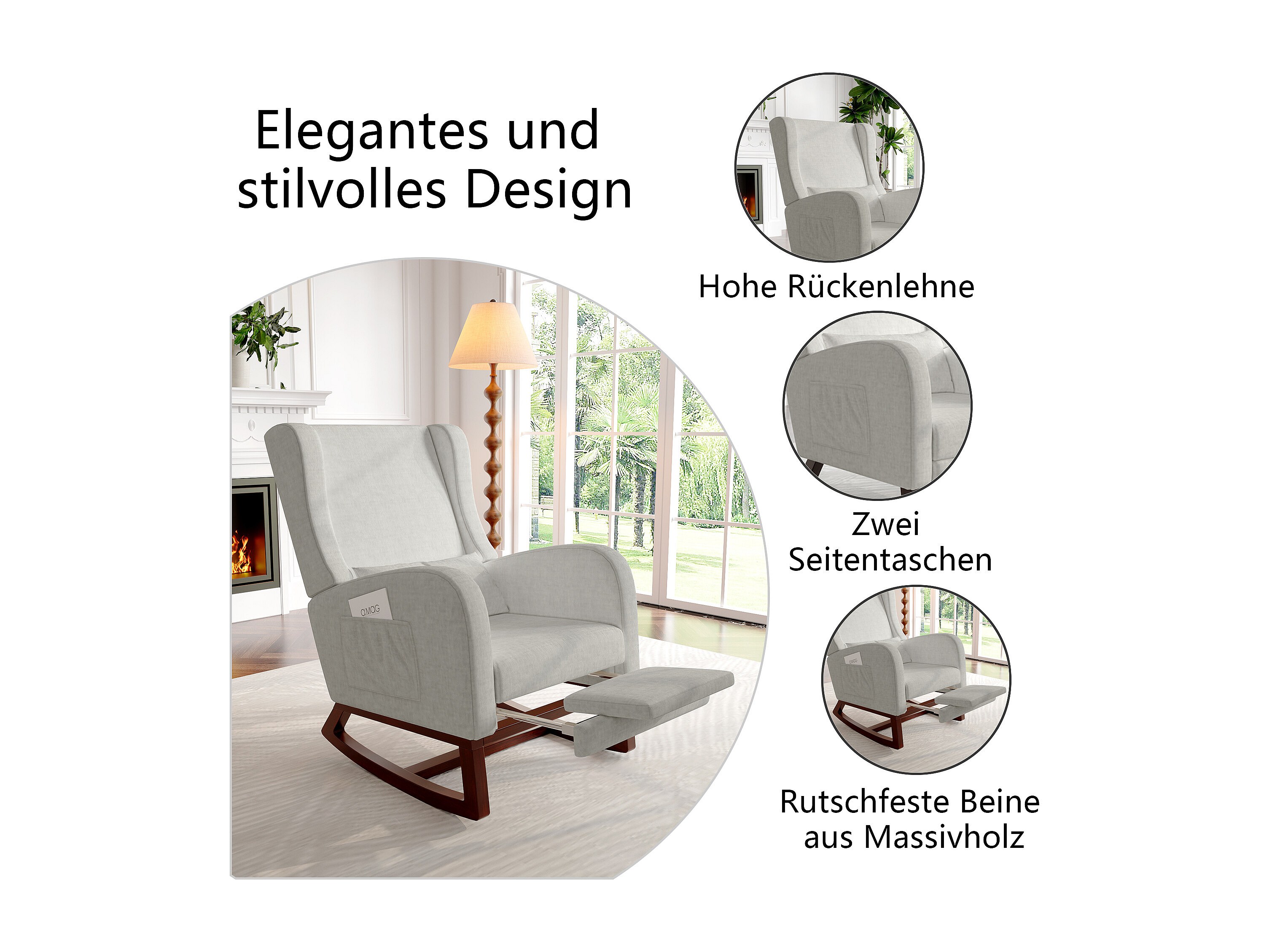 Fauteuil à bascule,Coton et lin - avec accoudoirs à poches - Pieds en bois massif - avec pieds télescopiques - gris