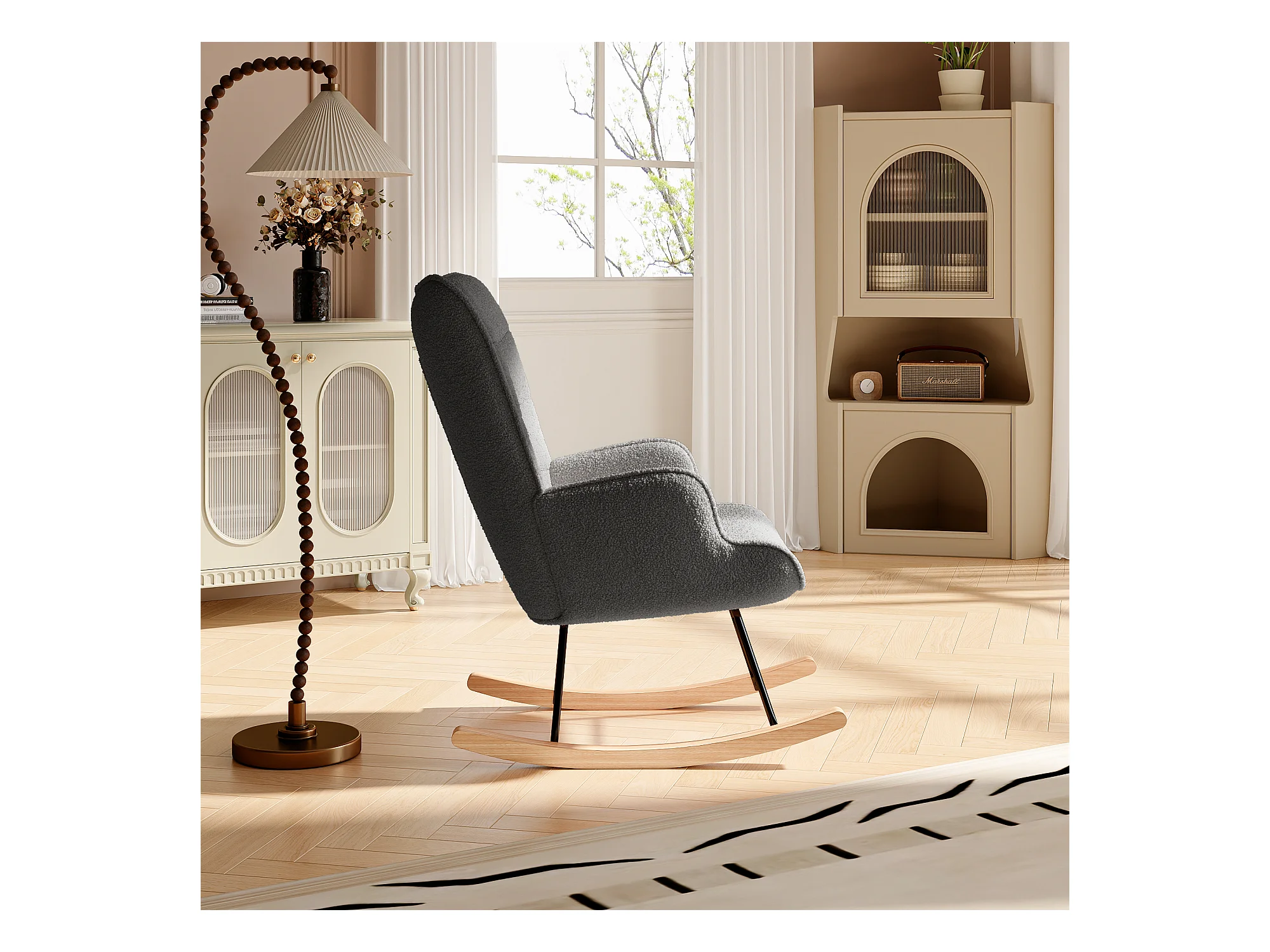 Fauteuil à bascule à oreilles en velours gris clair bois massif