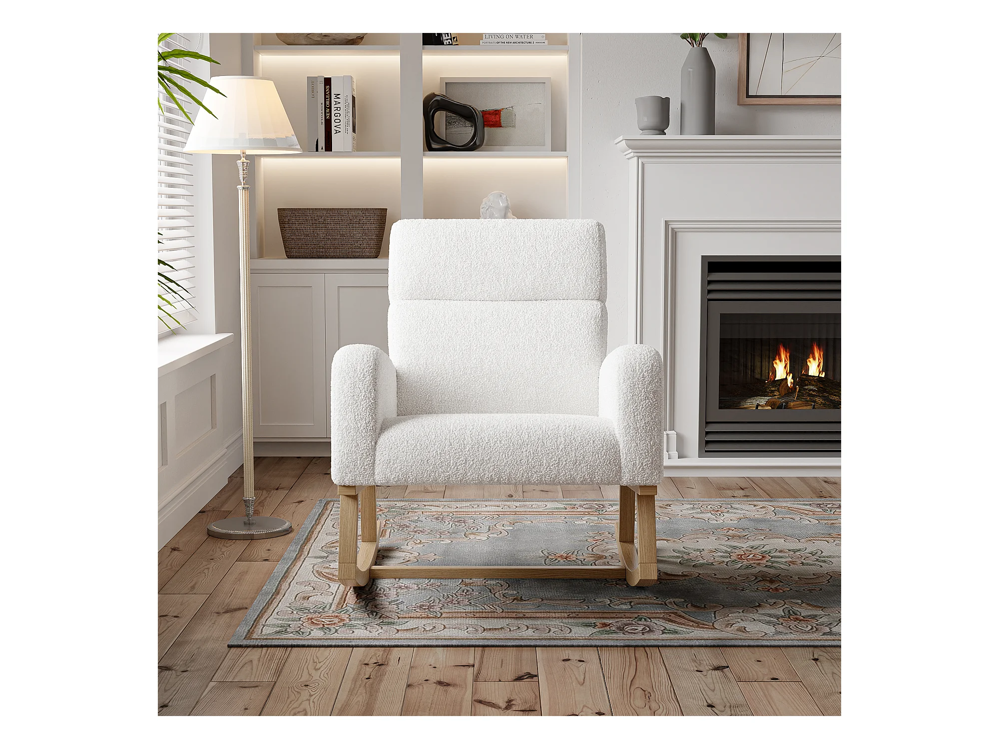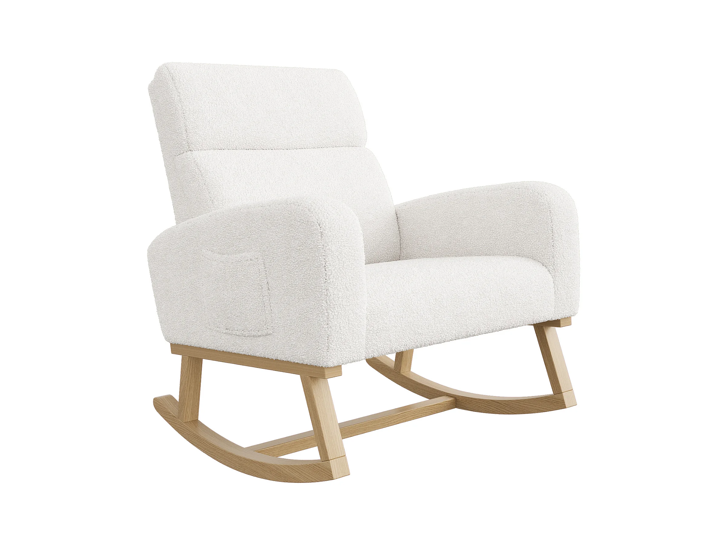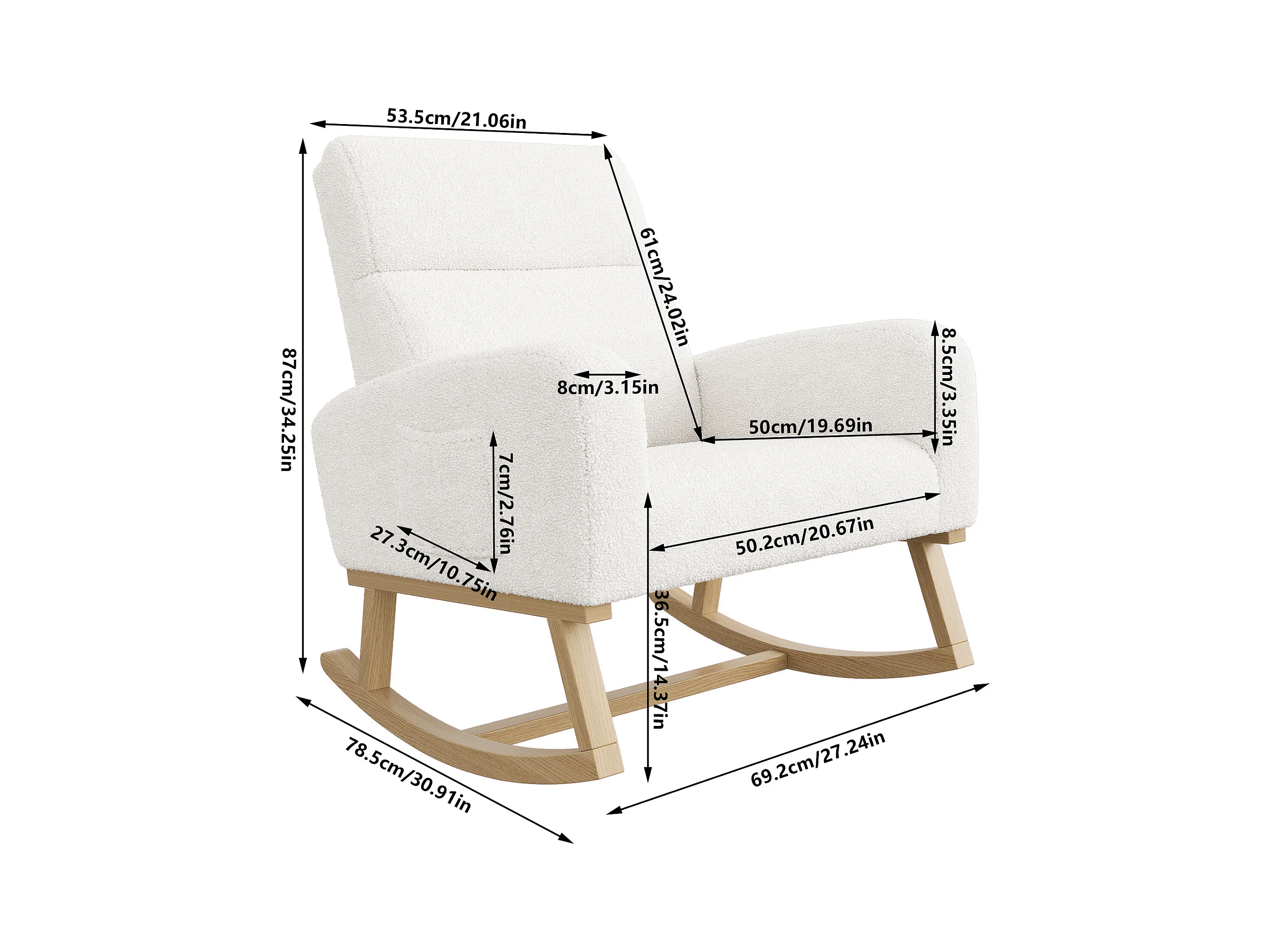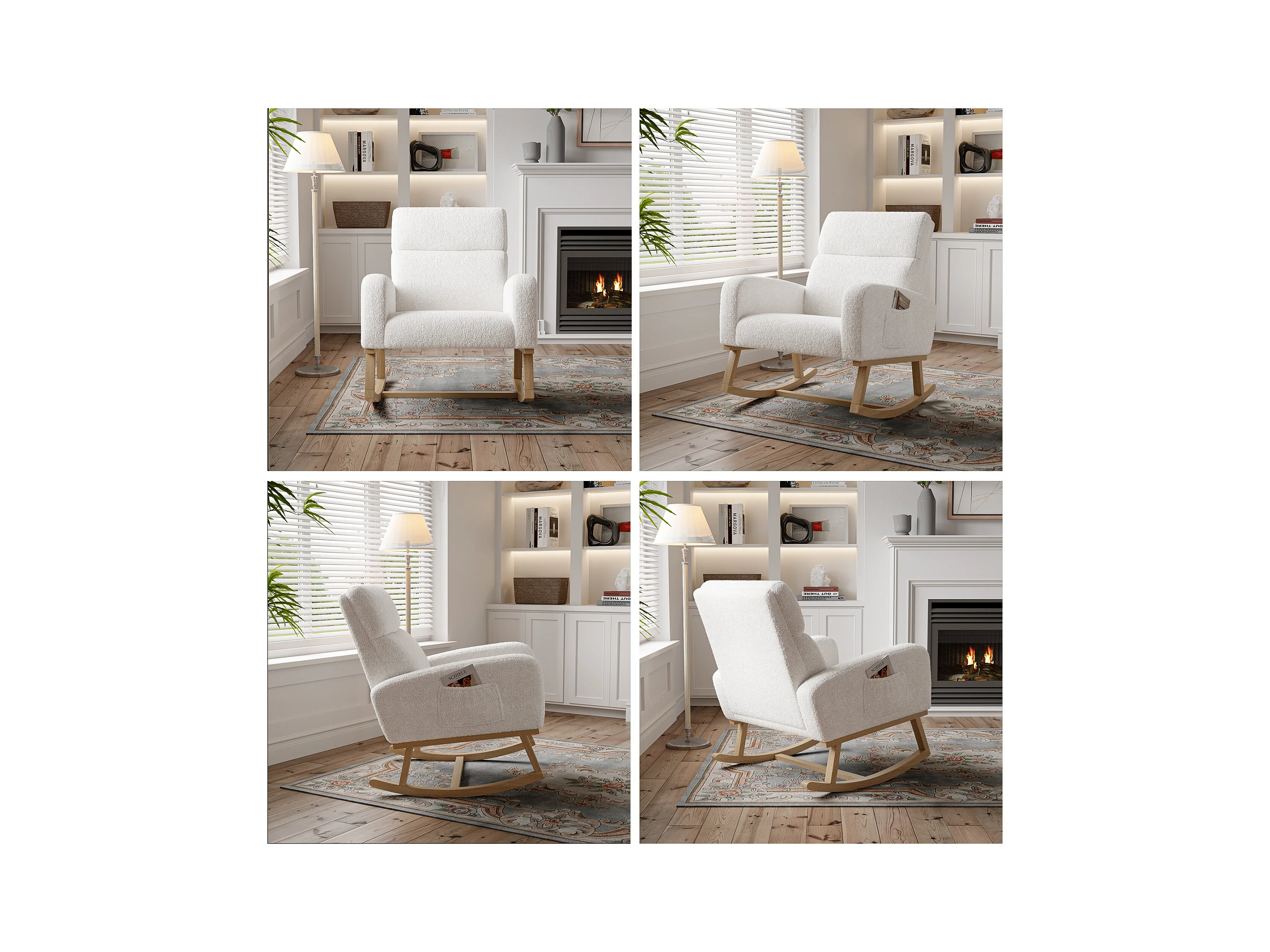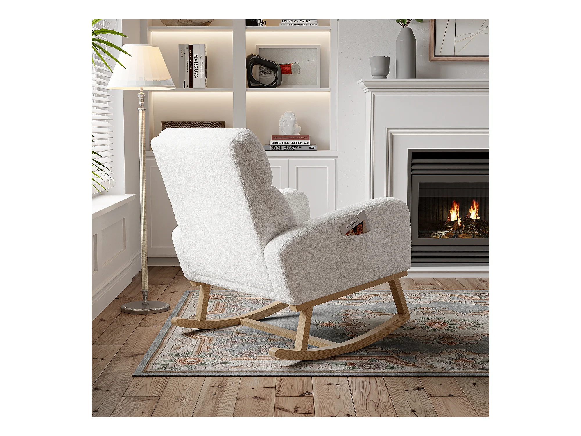Fauteuil à bascule, fauteuil de relaxation, avec poches et pieds en bois,velours Teddy beige